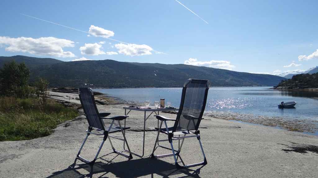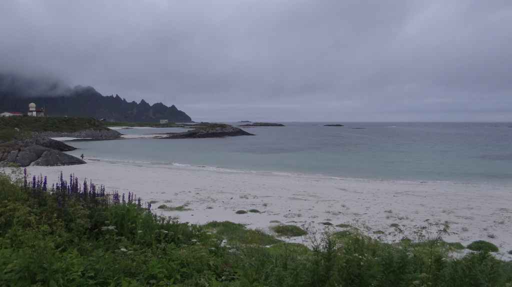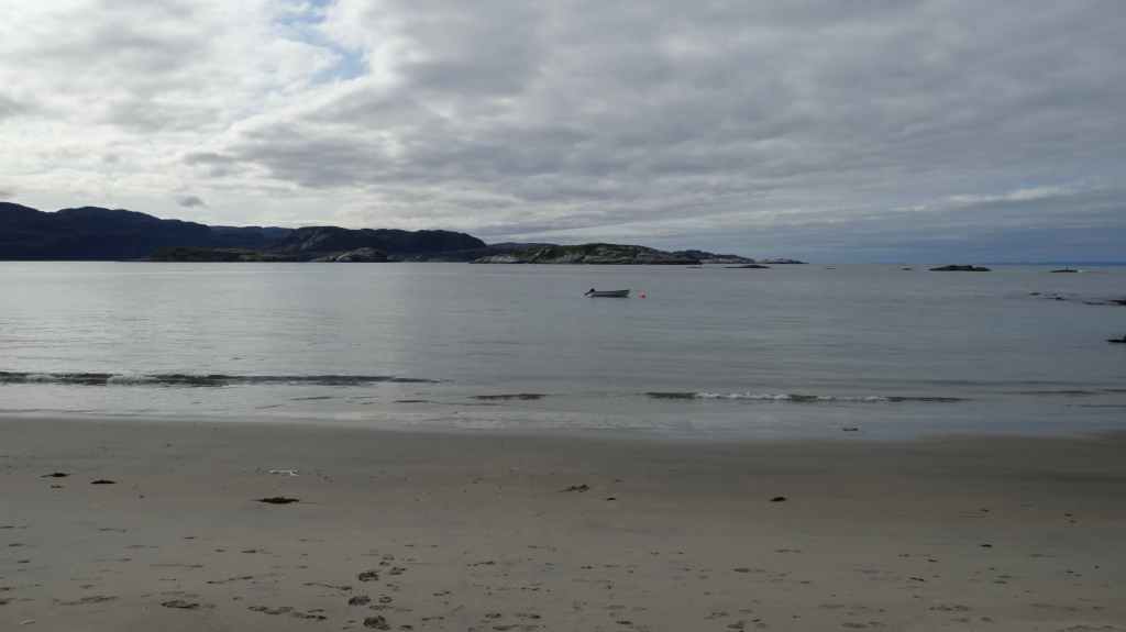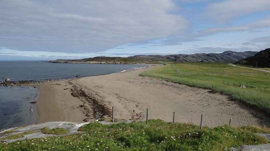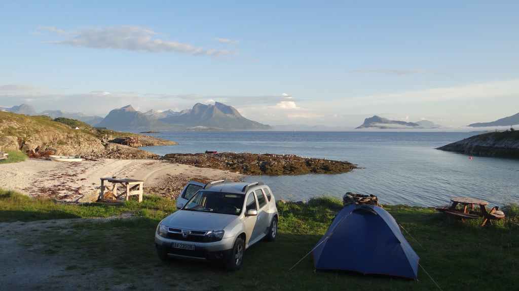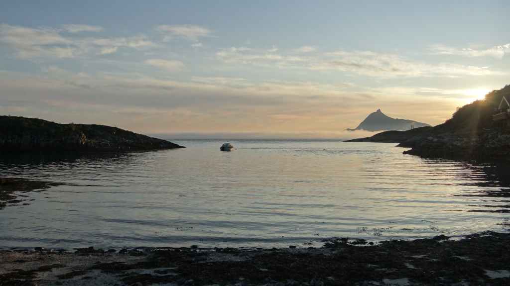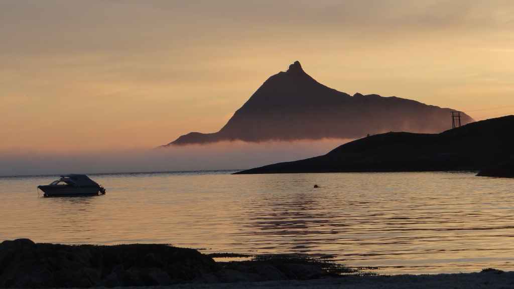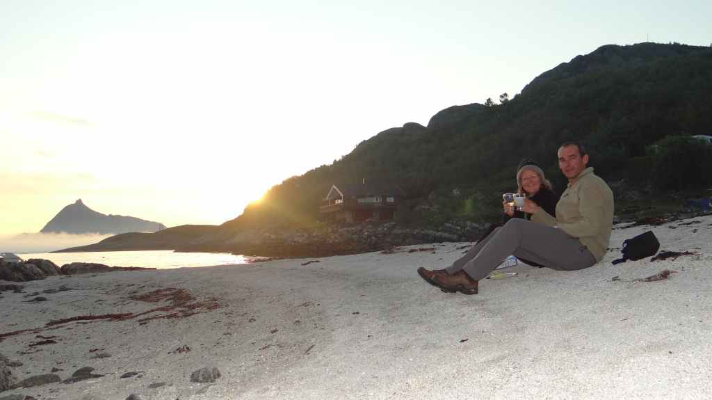 Le retour est rapide et, après une petite bière, nous reprenons la route. Nous franchissons le Cercle Polaire sans s’en apercevoir, lors d’une traversée en ferry. 2 heures suffisent pour rejoindre le petit port de Tonnes. Nous trouvons un minuscule camping au bord d’une plage de sable blanc : idyllique !!! Apéro sur la plage en admirant un magnifique coucher de soleil…
