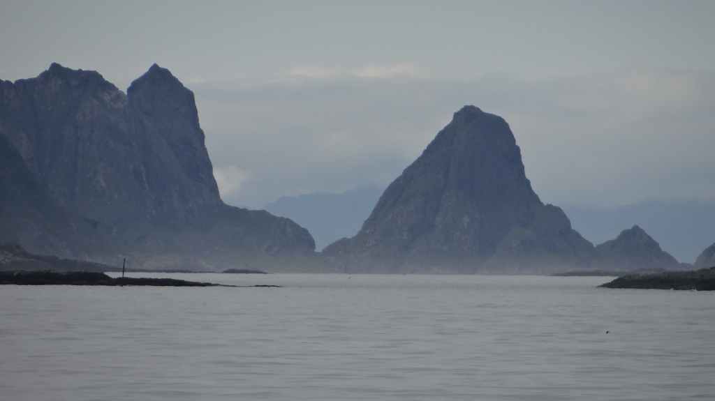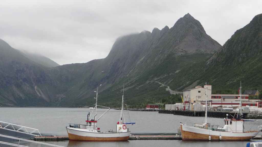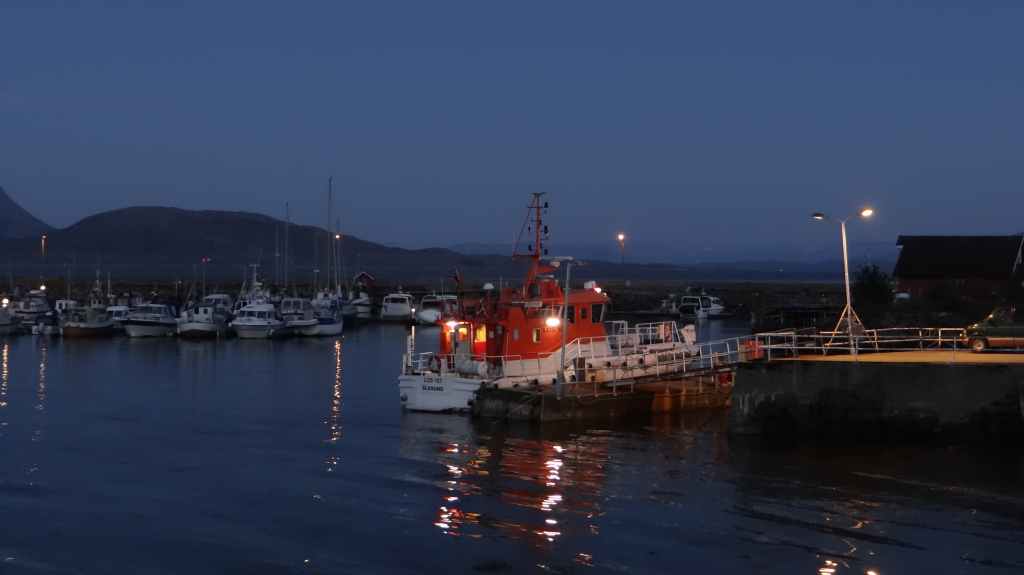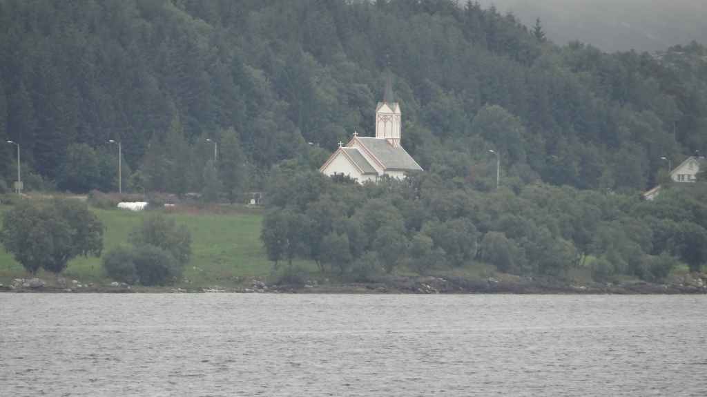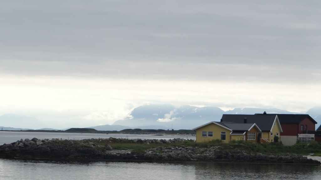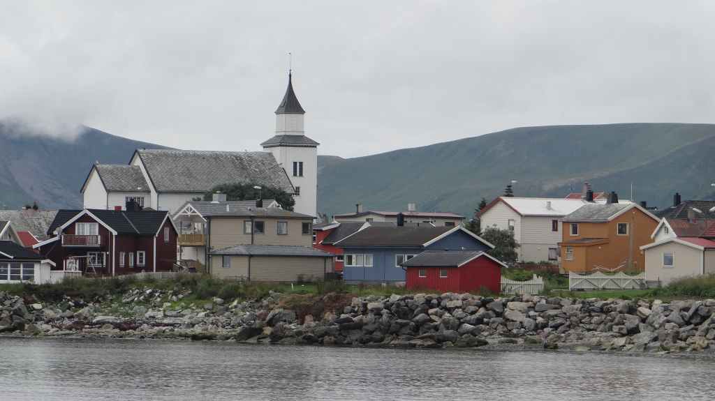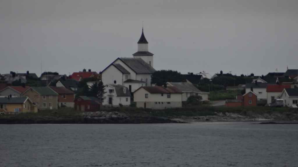 Nous passons de montagnes en fjords et de fjords en montagnes, tout ça agrémentés de lacs. Avant la traversée vers les Vesteralen, nous visitons un petit port, Torsken. Petite église rouge, quelques maisons de couleur et quelques chalutiers donnent de la couleur à la grisaille du fjord. Il est maintenant l’heure d’embarquer sur le ferry qui nous emmène à Andenes. Bien que la mer soit peu formée, Sylvie n’est pas à l’aise avec le tangage… Nous débarquons vers 20h00 sur l’île sous un ciel très menaçant. On plante la tente vers 21h00 au camping de la ville. Demain, c’est le grand jour pour le « safari baleines », mais nous devons encore une fois se lever très tôt pour espérer avoir de la place sur le bateau.
