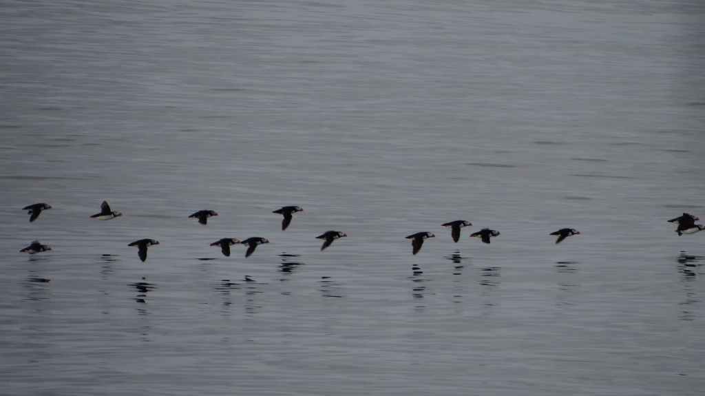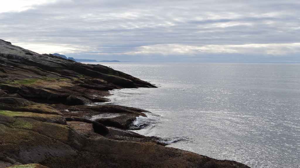 C’est de là que part notre rando. Il fait encore beau mais on voit déjà les nuages se pointer. Les paysages sont beaux mais austères et après 2 h1/2 de marche, on arrive au bout du bout ! On a alors la vue sur la mappemonde du Nordkapp, située au-dessus de la falaise. Des vols de cormorans, de goélands et surtout de macareux moines flirtent avec la surface de l’eau.