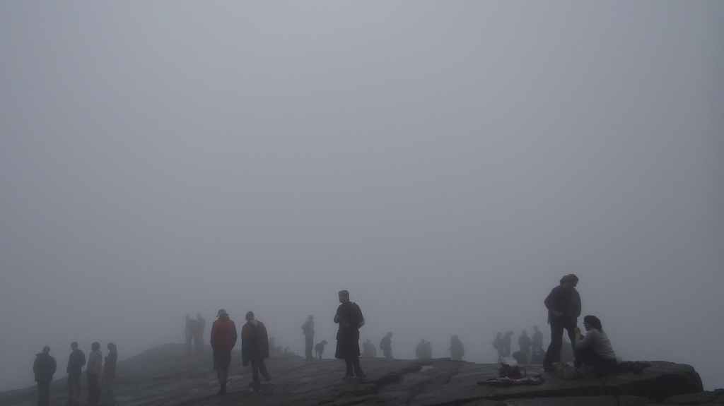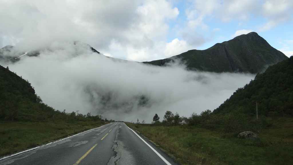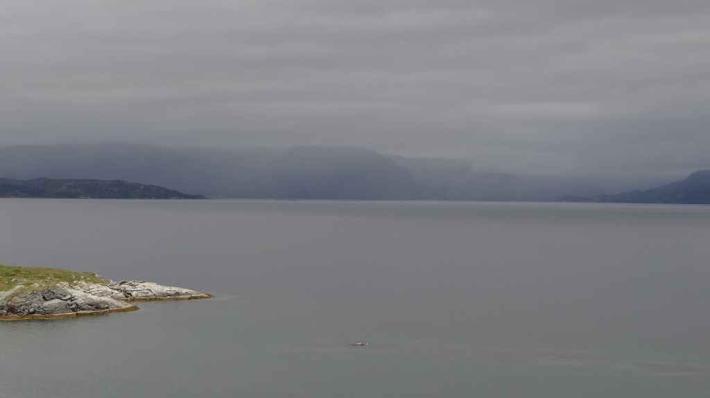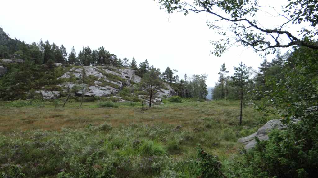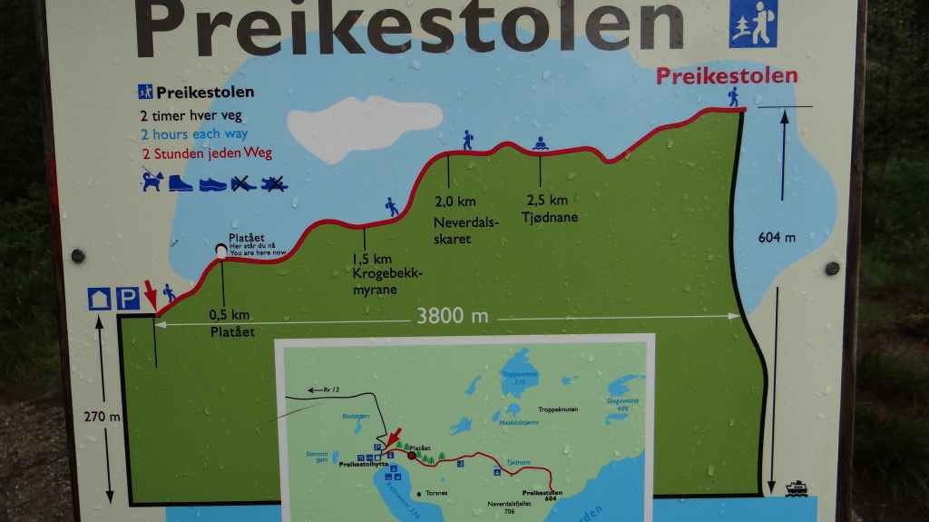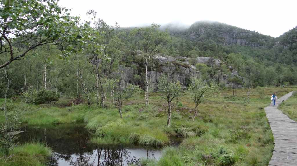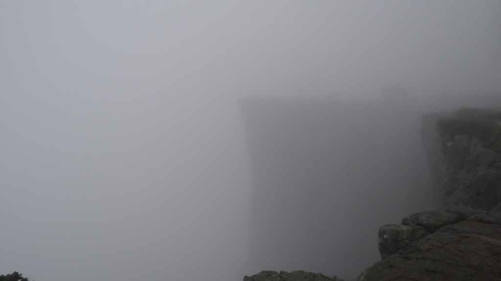 Après une soirée et une nuit bien arrosée, le ciel matinal est encore bien brumeux, mais on rejoint tout de même le parking au départ de la rando (10 € : encore pire qu’en Corse, dans les gorges de la Restonica !). Le sentier est une véritable autoroute avec des randonneurs mais surtout de nombreux touristes mal chaussés, malgré le sol très humide. Normalement, 2 heures suffisent pour rejoindre le prestigieux rocher, mais après 1h30, on est déjà au-dessus, dans un brouillard épais. La foule s’agglutine en espérant une éclaircie, mais après 1 heure dans la brume et l’humidité, c’est la pluie qui nous fait fuir, alors que des centaines de personnes continuent d’affluer. Nous ne verrons donc pas ce rocher plat surplombant un fjord de plusieurs centaines de mètres de hauteur.