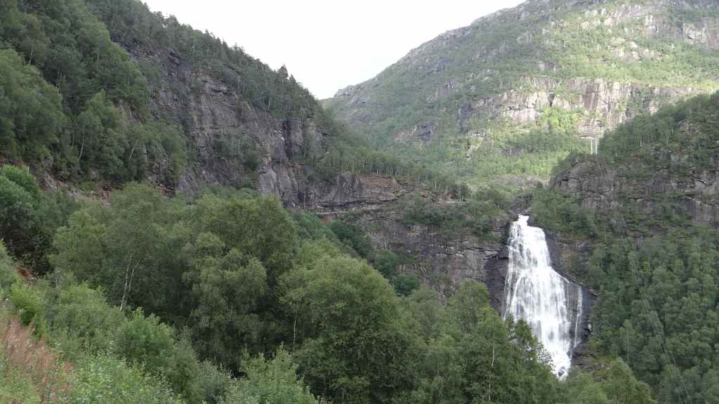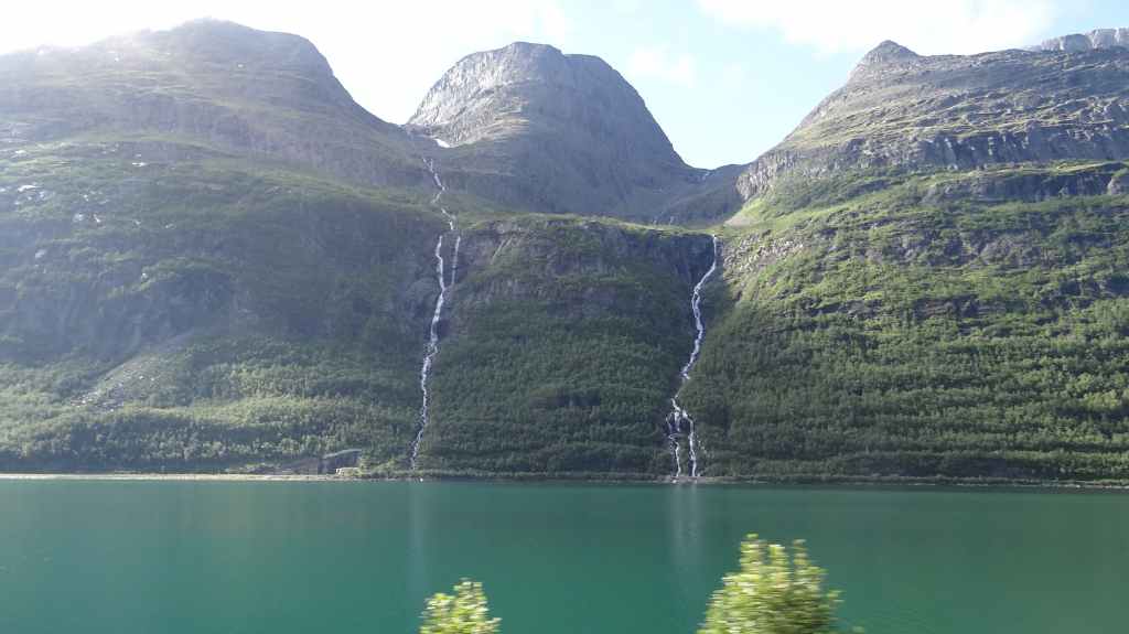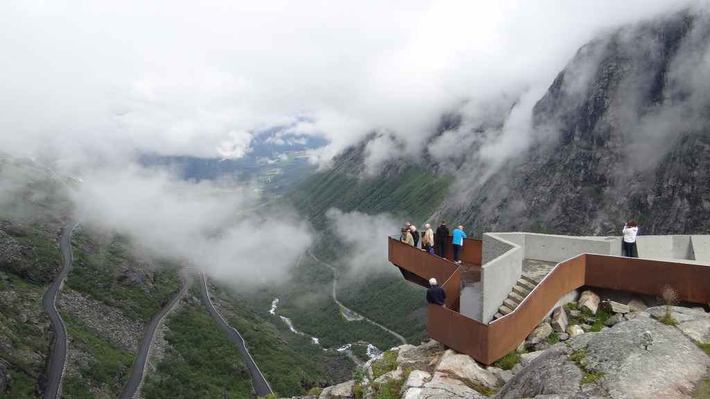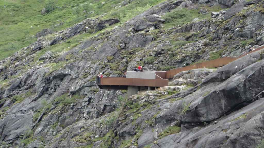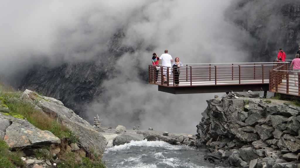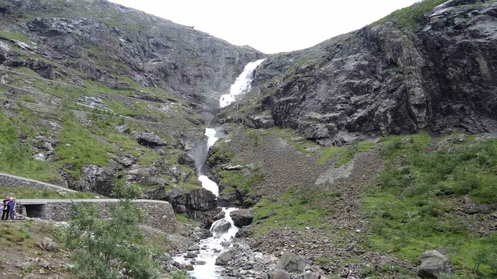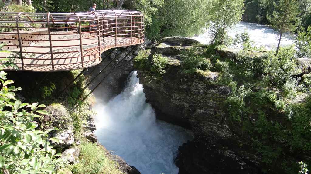 Cette journée apparait comme plus touristique. Nous remontons en direction de la très fréquentée « route des trolls » que nous ne verrons pas, sauf dans les magasins de souvenirs. Une magnifique cascade descend de la montagne. Plus haut, un grand parking et des bâtiments modernes, mais bien intégrés (avec resto, magasin de souvenirs), permettent aux nombreux touristes de visiter le haut de la cascade et la route des trolls. 2 passerelles construites en surplomb des falaises donnent une vue imprenable sur la vallée. Nous pique-niquons un peu plus loin puis redescendons de l’autre côté de la montagne où coule un autre torrent tumultueux aux eaux bleu turquoise.