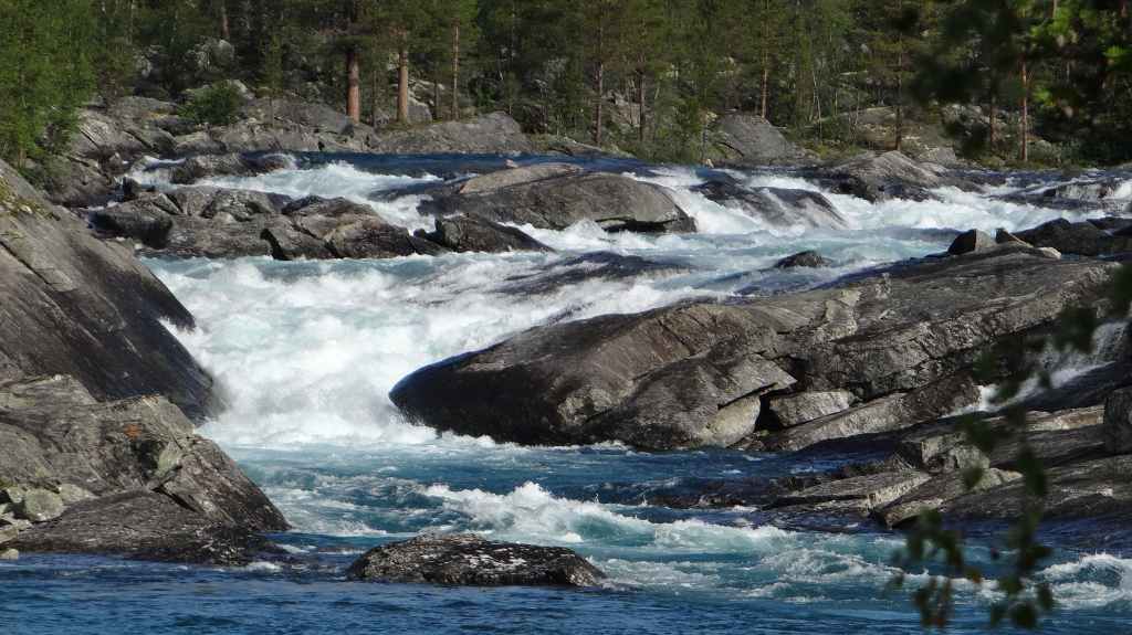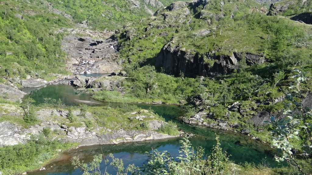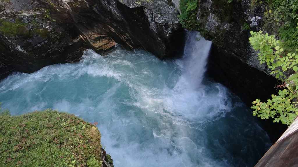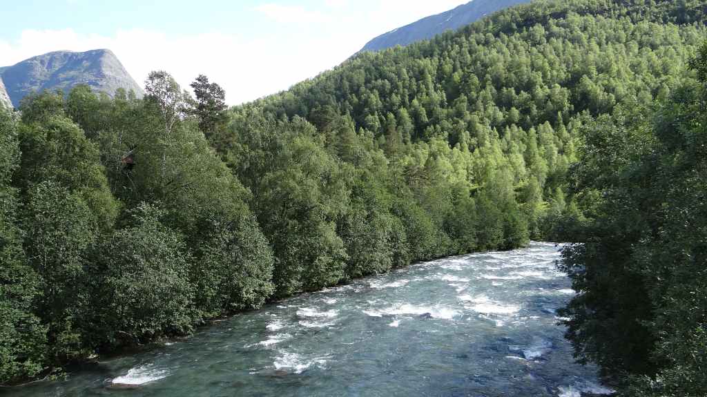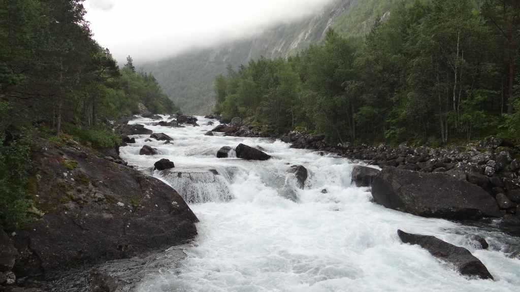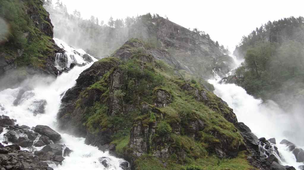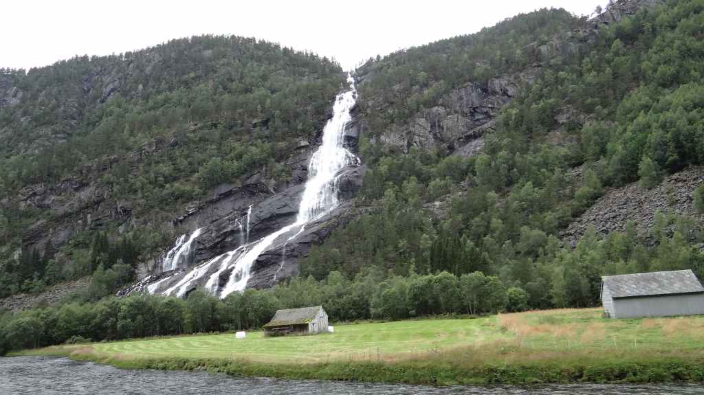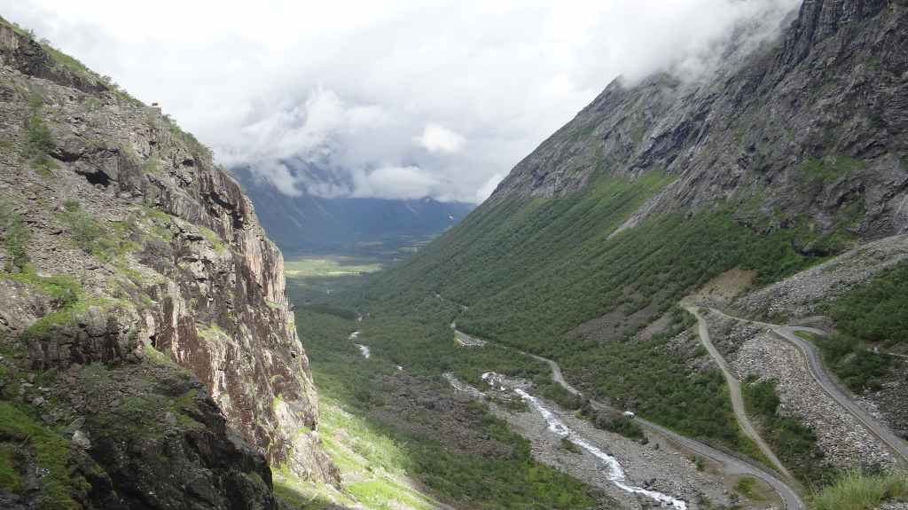 Cette journée apparait comme plus touristique. Nous remontons en direction de la très fréquentée « route des trolls » que nous ne verrons pas, sauf dans les magasins de souvenirs. Une magnifique cascade descend de la montagne. Plus haut, un grand parking et des bâtiments modernes, mais bien intégrés (avec resto, magasin de souvenirs), permettent aux nombreux touristes de visiter le haut de la cascade et la route des trolls. 2 passerelles construites en surplomb des falaises donnent une vue imprenable sur la vallée. Nous pique-niquons un peu plus loin puis redescendons de l’autre côté de la montagne où coule un autre torrent tumultueux aux eaux bleu turquoise.