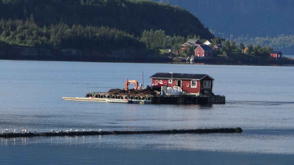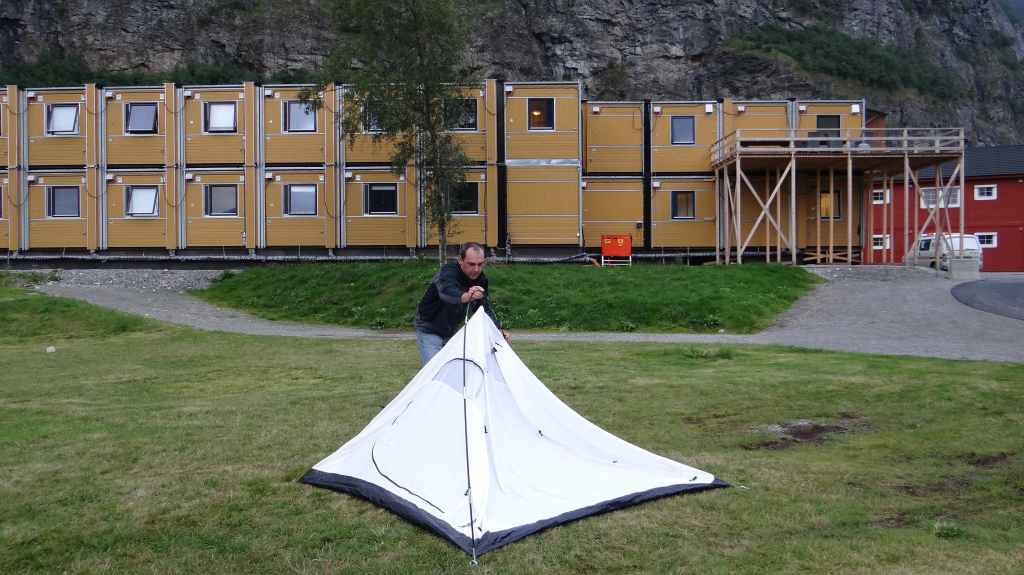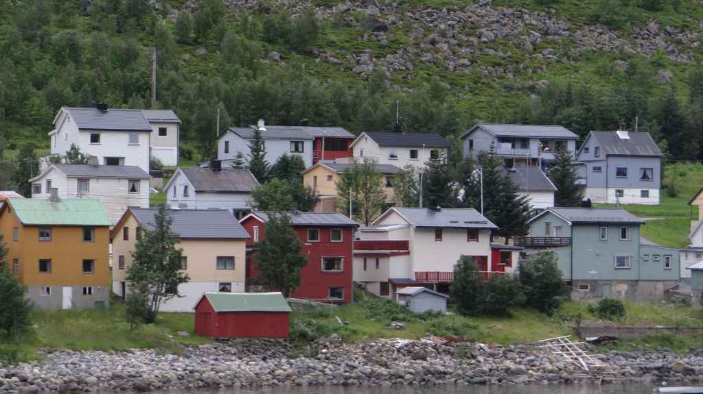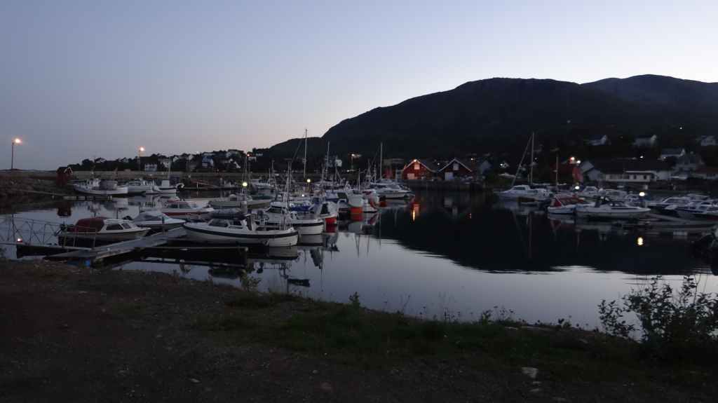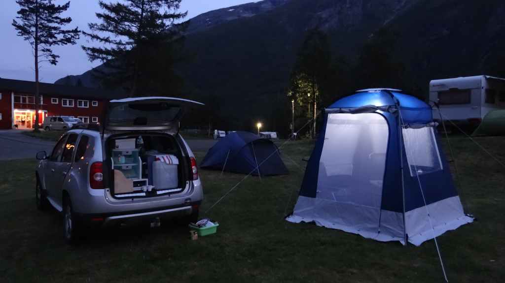 Nouvelle journée de transition sous un ciel encore bien gris. Fjords, ferries, encore et encore… En fin d’après-midi, nous arrivons à l’auberge de jeunesse de Sunndalsora. Vu la météo menaçante, nous pensions dormir dans un rorbu, mais la visite de 2 d’entre eux nous poussent à monter la tente, au pied de containers-appartements, là pour les ouvriers d’un chantier de creusement d’un tunnel. Nous avons, malgré tout, une jolie vue nocturne sur cette petite ville industrielle.