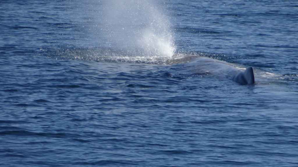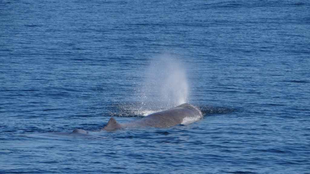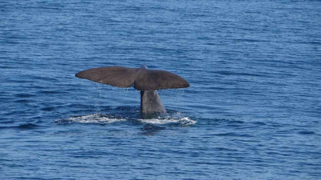 On doit un être une cinquantaine de personnes à bord. On s’éloigne de terre jusqu’à un canyon sous-marin où vont se nourrir les cachalots. On patiente près de 2 heures avant le premier moment inoubliable, magique : un geyser sort de la surface… GRANDIOSE !!!