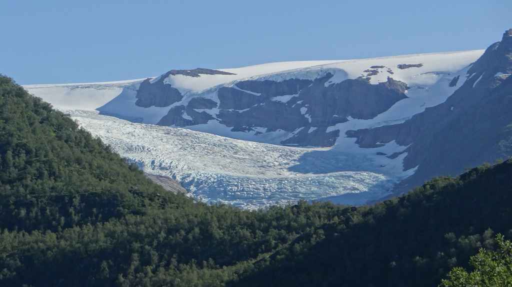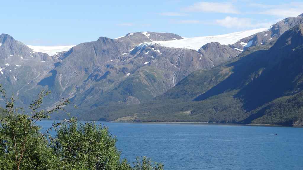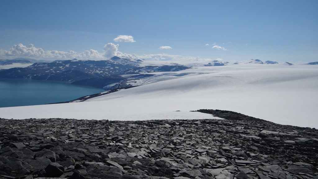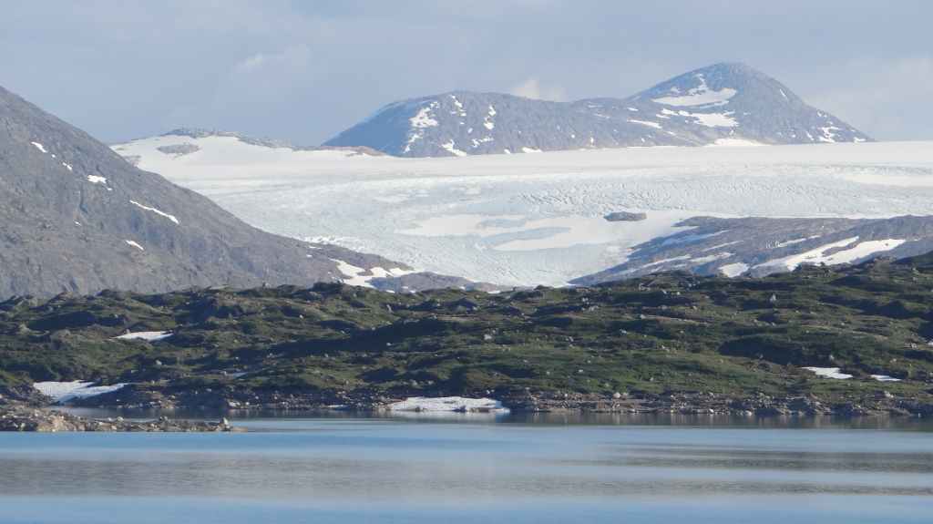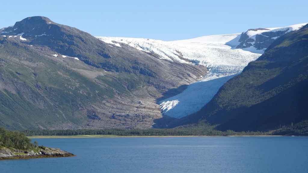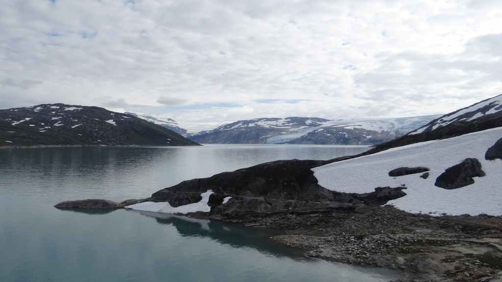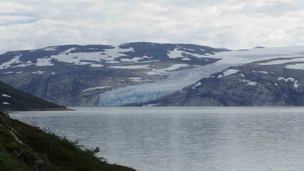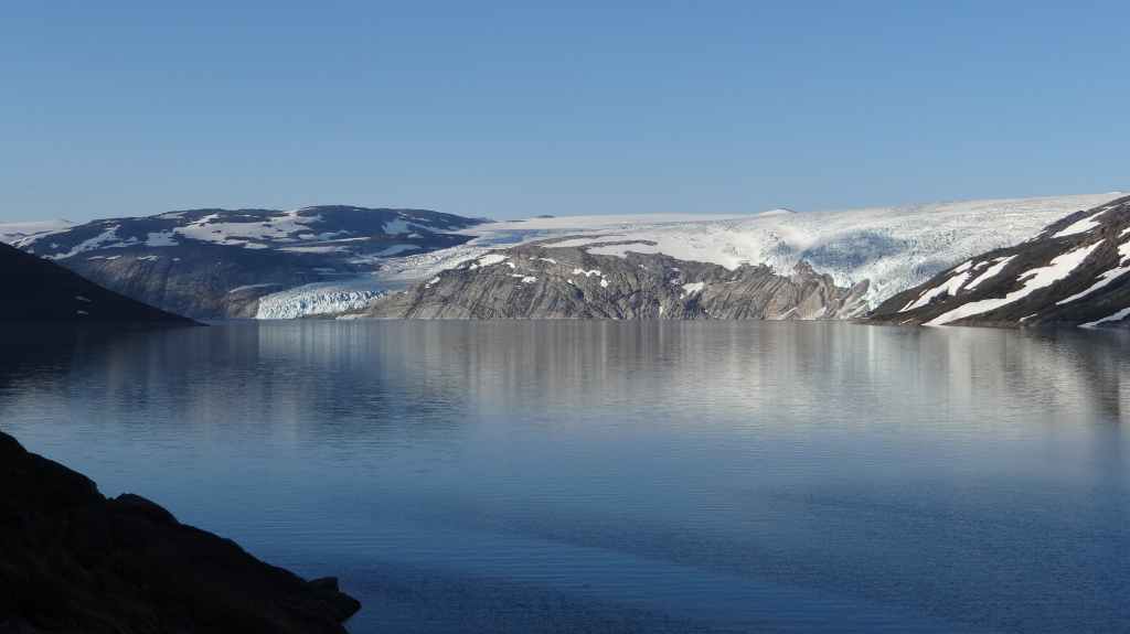 Ce matin, c’est grand beau : temps idéal pour gravir notre modeste sommet glaciaire de 1250 m d’altitude. Après avoir longuement admirer les glaciers bleutés plongeants dans le lac, nous commençons notre ascension. Nous prenons pied sur un long névé à 600 m d’altitude puis sur le glacier à l’altitude de Levier (750 m). Nous nous équipons même si les crevasses sont quasiment absentes, mais mieux vaut jouer la prudence ! La montée est plus longue qu’il n’y parait et nous arrivons au sommet pour le repas de midi. Le panorama est splendide : vue sur le deuxième plus grand glacier norvégien, sur la mer, sur les lacs… Déjà, il faut penser à redescendre, avec regrets.