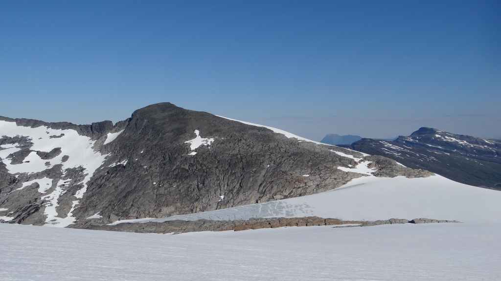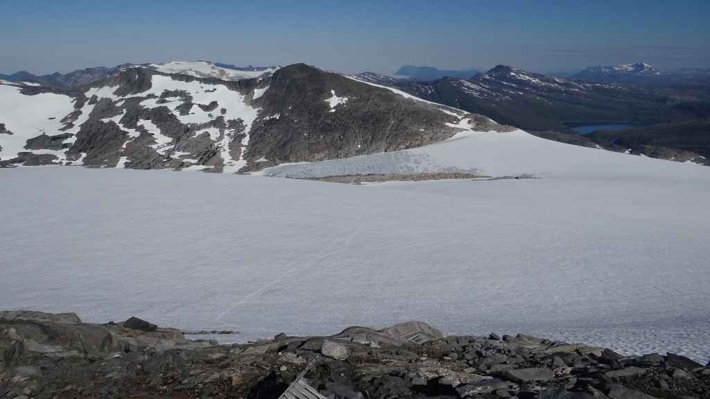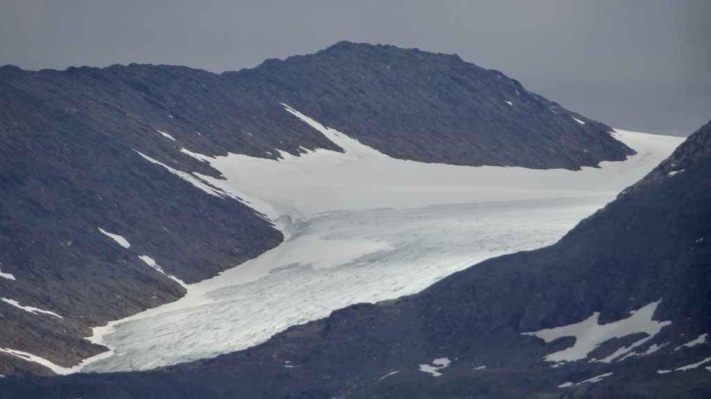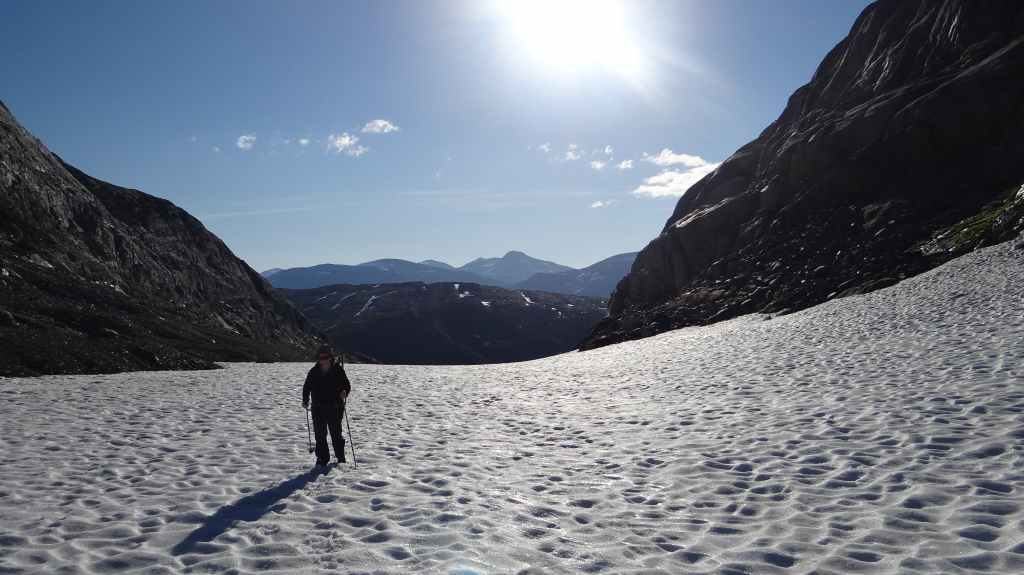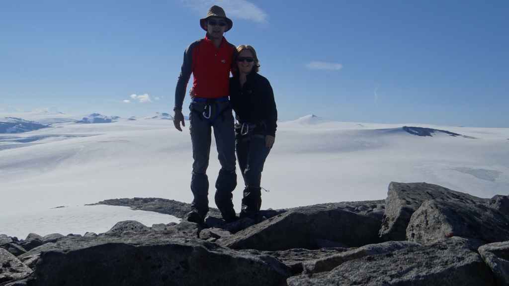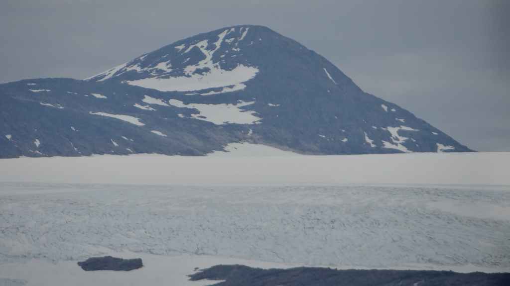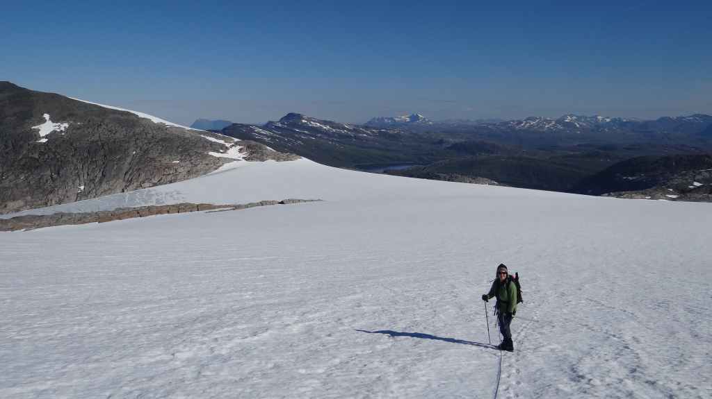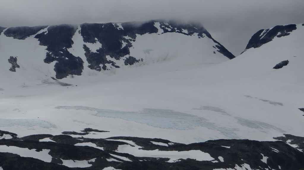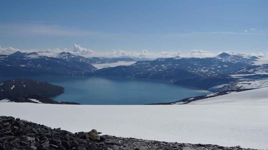 Ce matin, c’est grand beau : temps idéal pour gravir notre modeste sommet glaciaire de 1250 m d’altitude. Après avoir longuement admirer les glaciers bleutés plongeants dans le lac, nous commençons notre ascension. Nous prenons pied sur un long névé à 600 m d’altitude puis sur le glacier à l’altitude de Levier (750 m). Nous nous équipons même si les crevasses sont quasiment absentes, mais mieux vaut jouer la prudence ! La montée est plus longue qu’il n’y parait et nous arrivons au sommet pour le repas de midi. Le panorama est splendide : vue sur le deuxième plus grand glacier norvégien, sur la mer, sur les lacs… Déjà, il faut penser à redescendre, avec regrets.