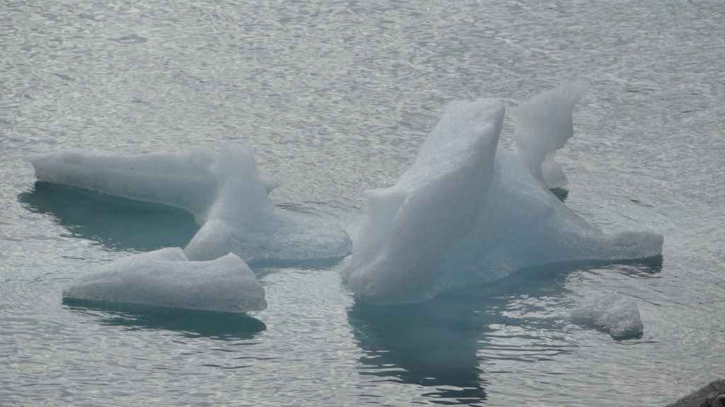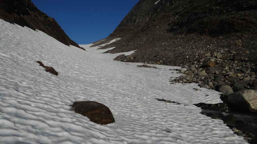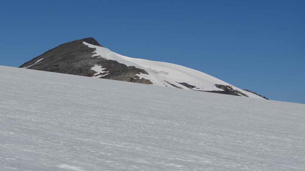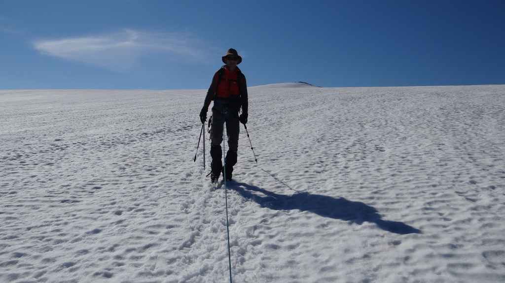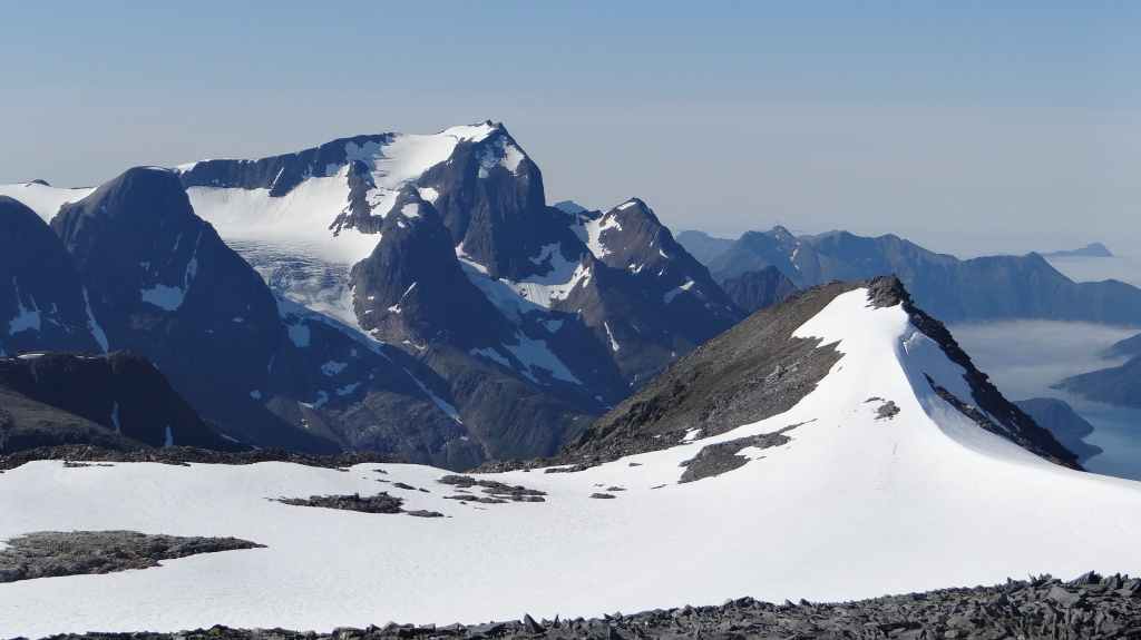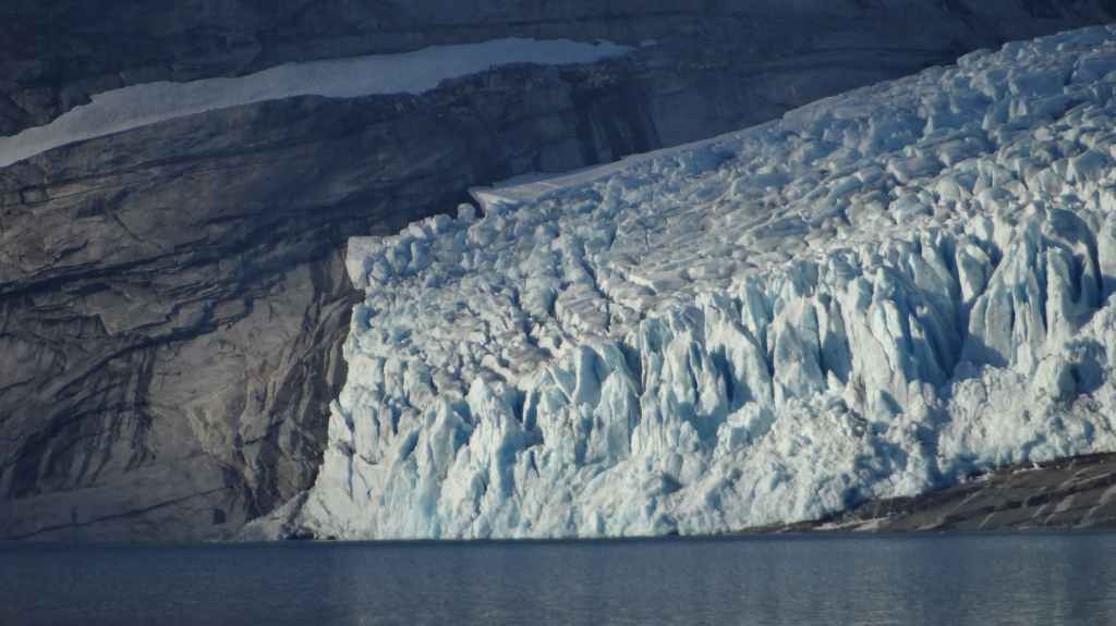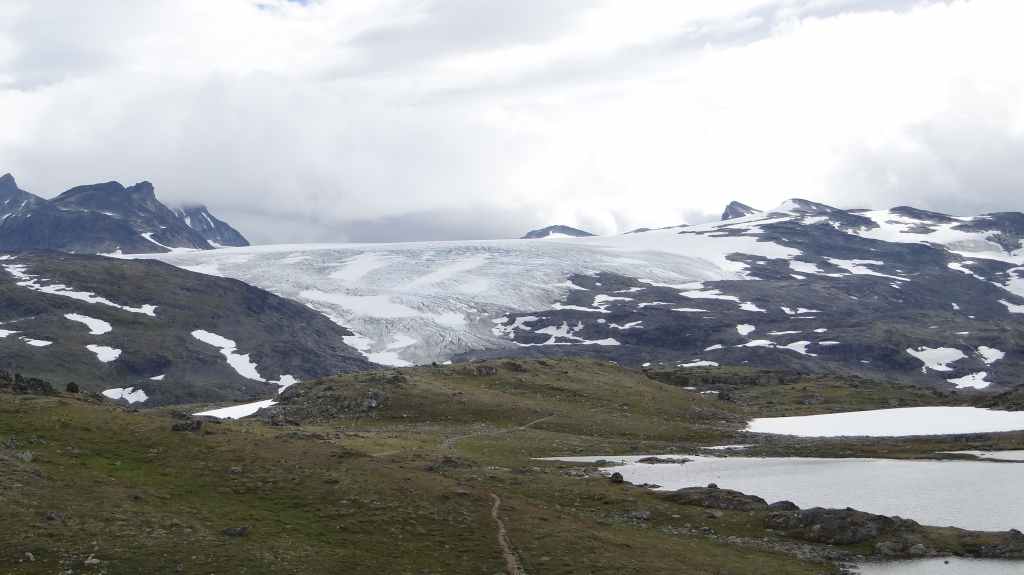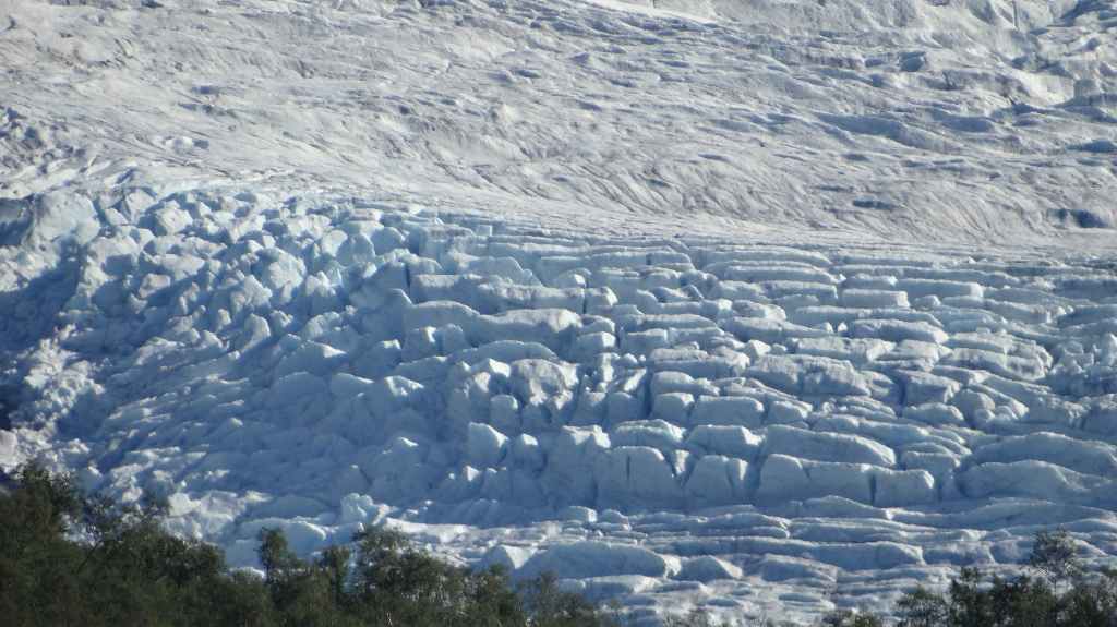 Ce matin, c’est grand beau : temps idéal pour gravir notre modeste sommet glaciaire de 1250 m d’altitude. Après avoir longuement admirer les glaciers bleutés plongeants dans le lac, nous commençons notre ascension. Nous prenons pied sur un long névé à 600 m d’altitude puis sur le glacier à l’altitude de Levier (750 m). Nous nous équipons même si les crevasses sont quasiment absentes, mais mieux vaut jouer la prudence ! La montée est plus longue qu’il n’y parait et nous arrivons au sommet pour le repas de midi. Le panorama est splendide : vue sur le deuxième plus grand glacier norvégien, sur la mer, sur les lacs… Déjà, il faut penser à redescendre, avec regrets.