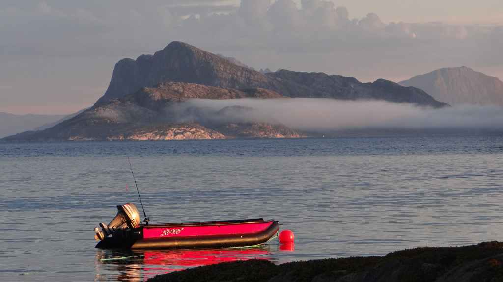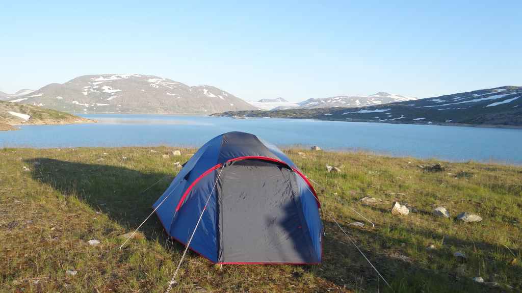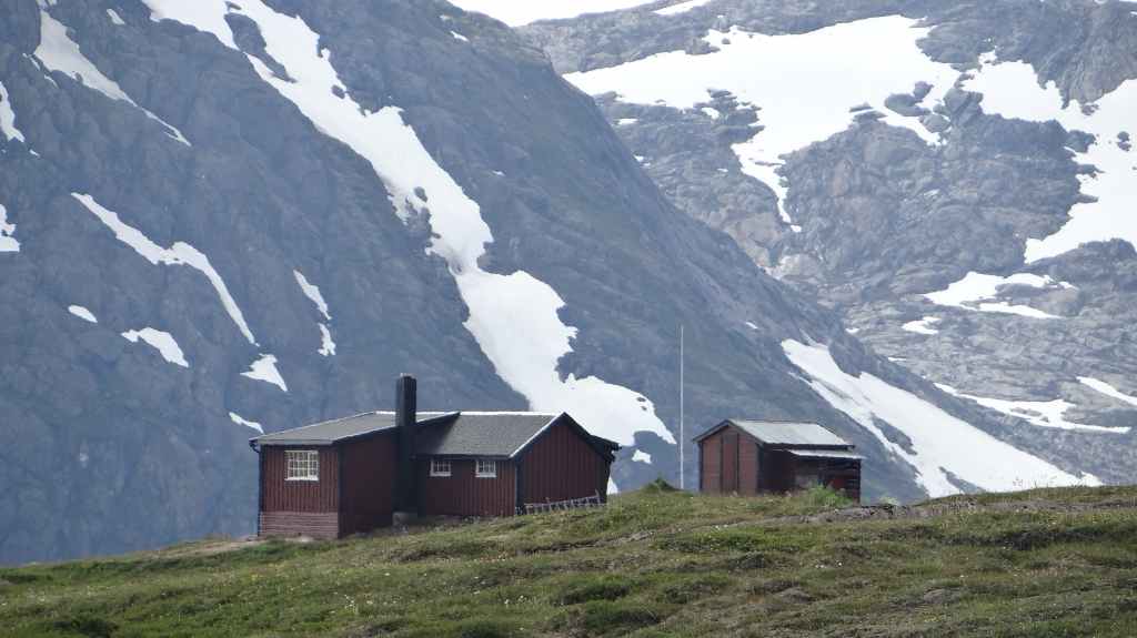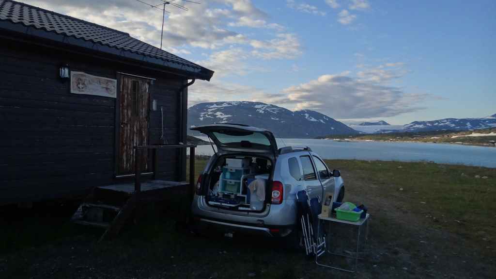 Ce soir, nous pensons dormir en bord de mer, alors nous redescendons vers Glomfjorden, non sans être aller repérer le départ de notre randonnée glaciaire du lendemain. Mais en bas, le brouillard et l’humidité recouvrent le littoral et rien ne nous permet d’installer notre tente, alors nous remontons au bord du lac. Nous jetons un œil dans le refuge mais les 2 lits paraissent occupés, alors nous montons la tente et l’abri, ce dernier devant nous protéger des moustiques. Un peu plus tard, le refuge est libéré, et nous nous empressons de l’occuper à notre tour.