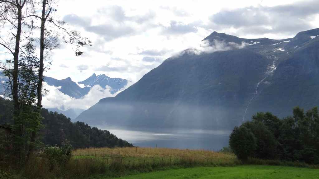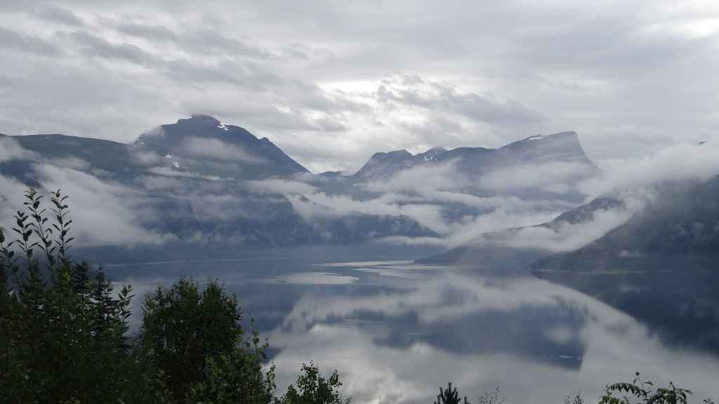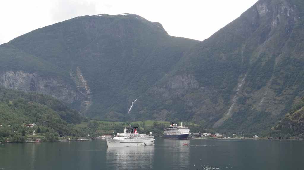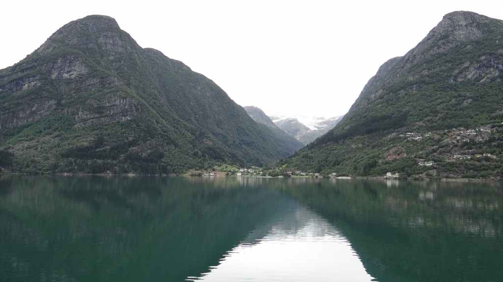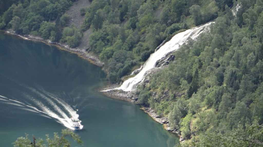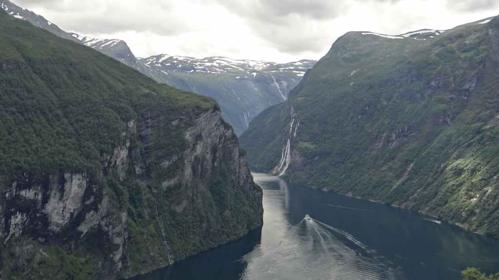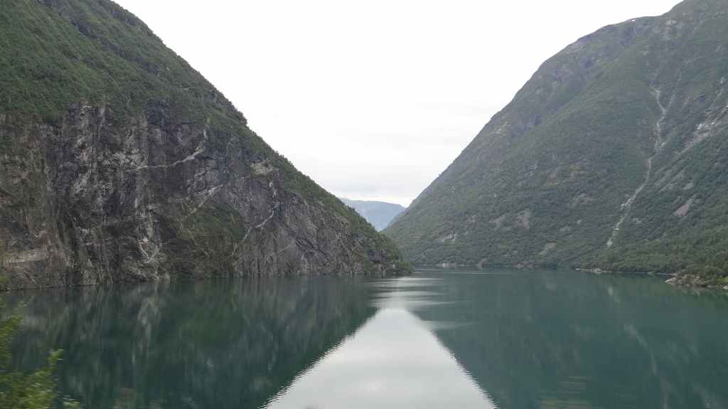 Nouveau passage de col avant de redescendre vers le plus célèbre des fjords, le Geiranger. Celui-ci est étroitement encaissé entre des pentes à-pics. Mais la grisaille ambiante casse un peu la magie du lieu, fréquenté par les paquebots.
