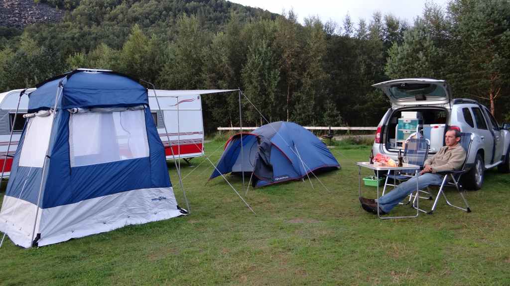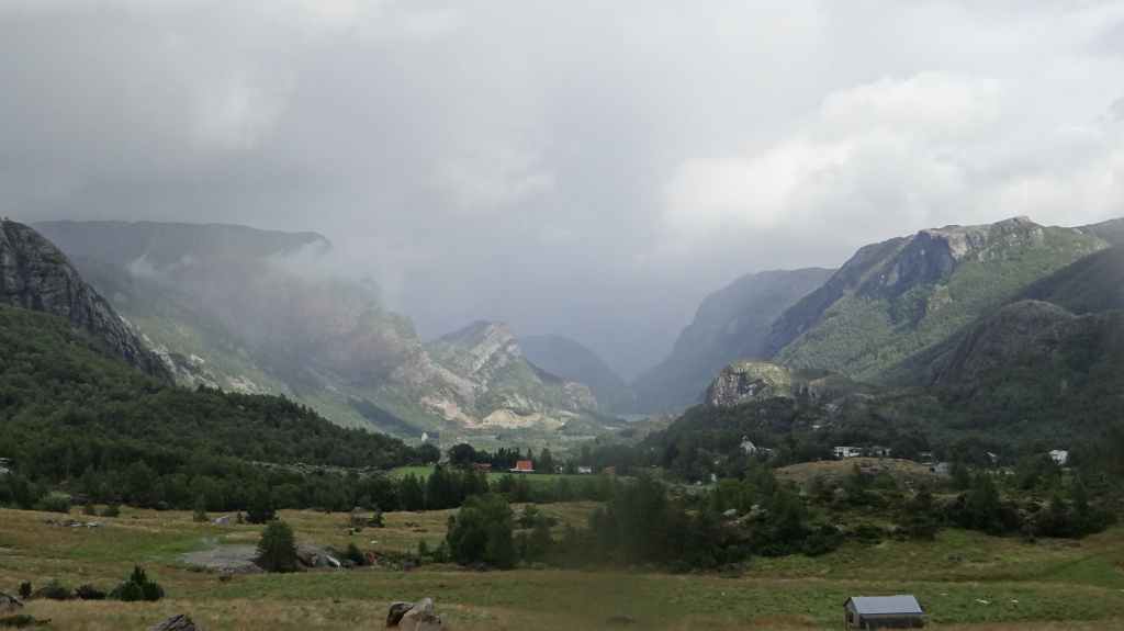 Après la traversée du fjord, on repart plein sud en utilisant une route étroite mais fréquentée tout de même par les poids lourds : leur croisement est parfois difficile et long. : la vitesse moyenne s’en ressent. On arrive à Oddal où l’on espère trouver une bouteille de Camping-Gaz pour le frigo, mais rien ! Alors on continue notre chemin sous un ciel capricieux. En approchant de la côte ouest, les fortes averses se font plus nombreuse et quand on arrive au camping proche du célèbre Preikestolen, le sol est gorgé d’eau. On trouve tout de même un « îlot » pour s’installer. Malgré le prix extrêmement élevé (40 €), il n’y a pas de salle à manger pour se protéger de la pluie, alors on monte l’abri.