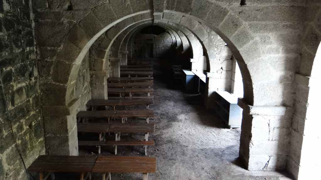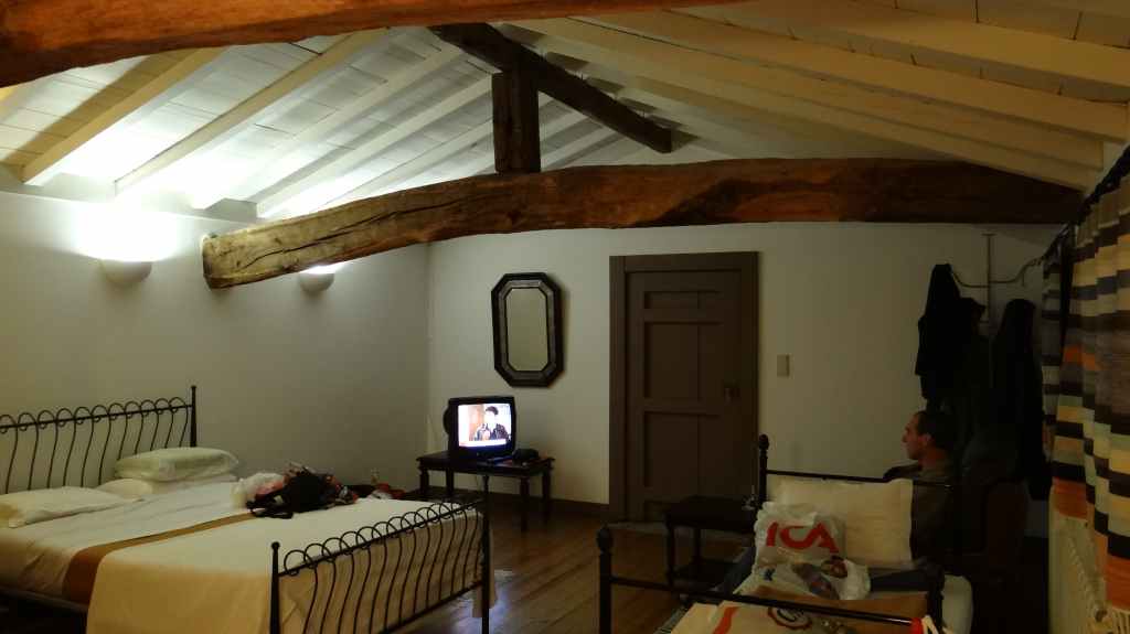 Une bruine toute bretonne se met à tomber. On prend donc la route pour Santa Isabel à environ 80 km. Il nous faudra 2 heures pour rejoindre le hameau. Villages et virages qui s’enchaînent, automobilistes du dimanche très « mous ». Il va falloir nous habituer à une moyenne de 40 km/h. Après quelques efforts et un peu de retard, on trouve notre logis, mais fermé à clés, et personne autour. On tape donc à une porte. On dame âgée nous ouvre et comprend notre problème. Elle appelle son fils, qui parle un peu français. Il connait la responsable et nous emmène chez elle, tout en discutant. Il est routier et passe toutes les semaines vers Besançon… le monde est petit ! On accède enfin à notre studio au premier étage, d’un vieux bâtiment. C’est très sympa. il y a même la TV mais en portugais… Tout est prévu pour le petit-déjeuner, et c’est comme à l’hôtel, avec les draps et serviettes de bain. 2 lavabos et 2 WC non fermés (!!!), et la douche. Une kitchenette dans un placard.
