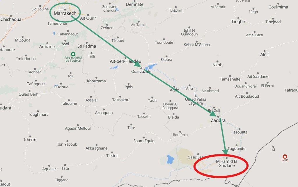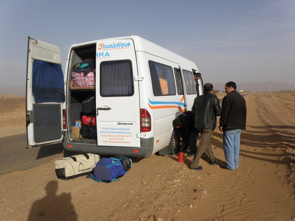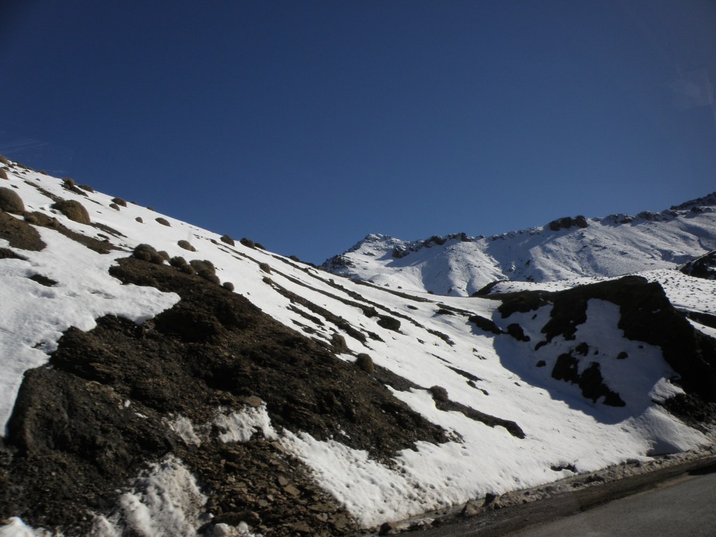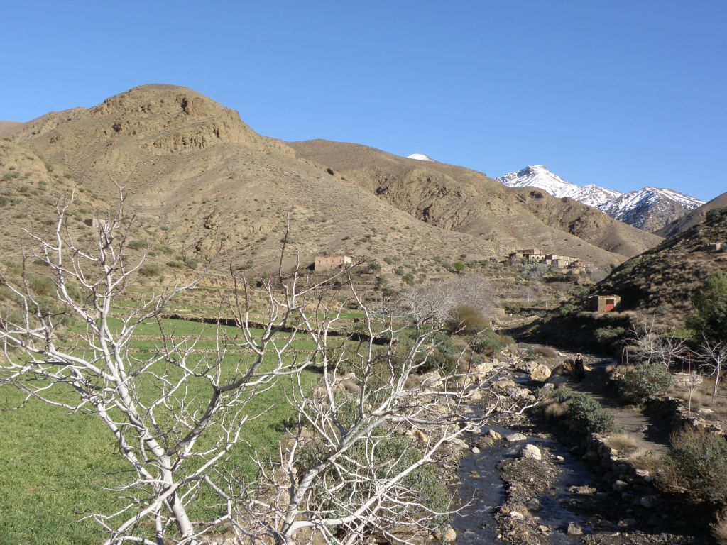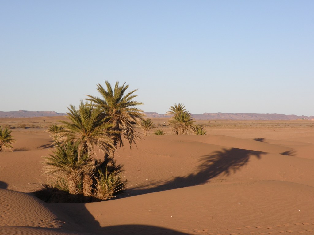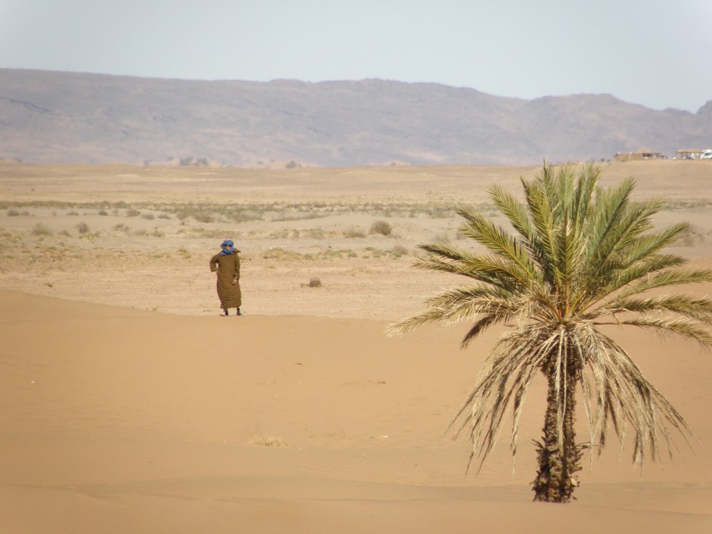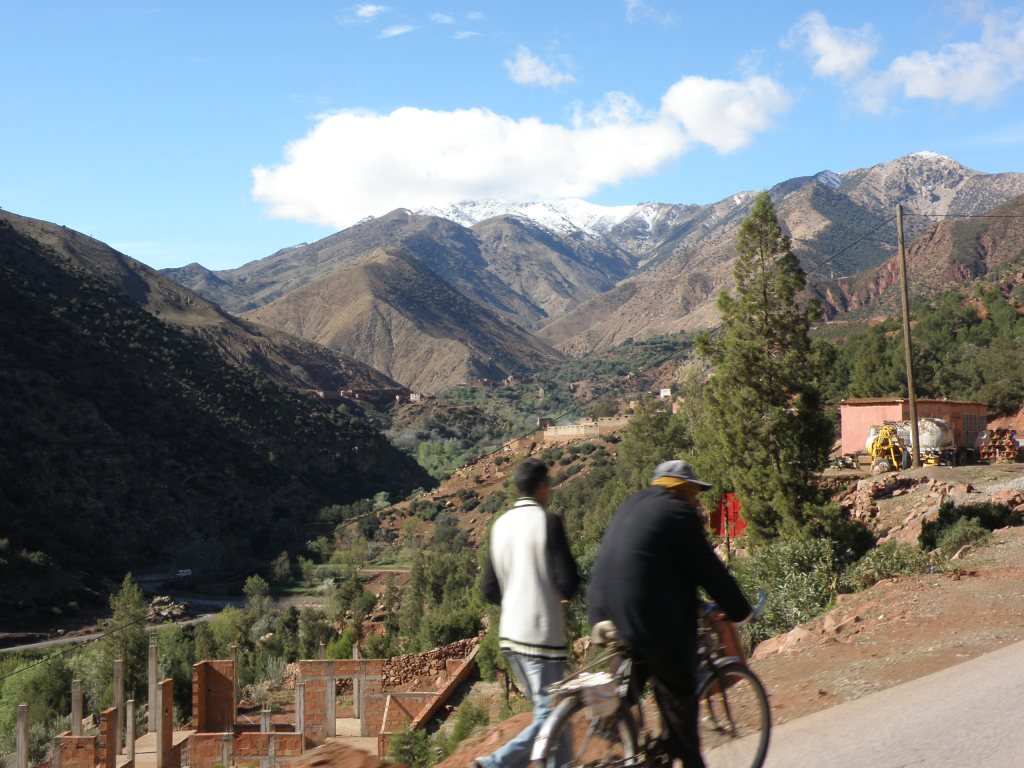 Petit-déjeuner et départ à 8h00 dans 2 minibus pour rejoindre M’Hamid à 450 km de Marrakech. La route est longue mais nous traversons de magnifiques paysages. Nous grimpons le col Tiscka dans l’Atlas à 2260 m d’altitude. La neige est encore présente. De l’autre côté, c’est déjà l’approche du désert à Ouarzazate puis Zagora.