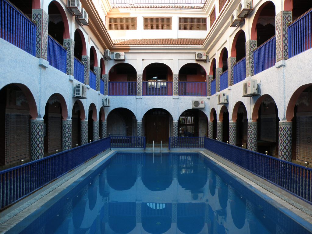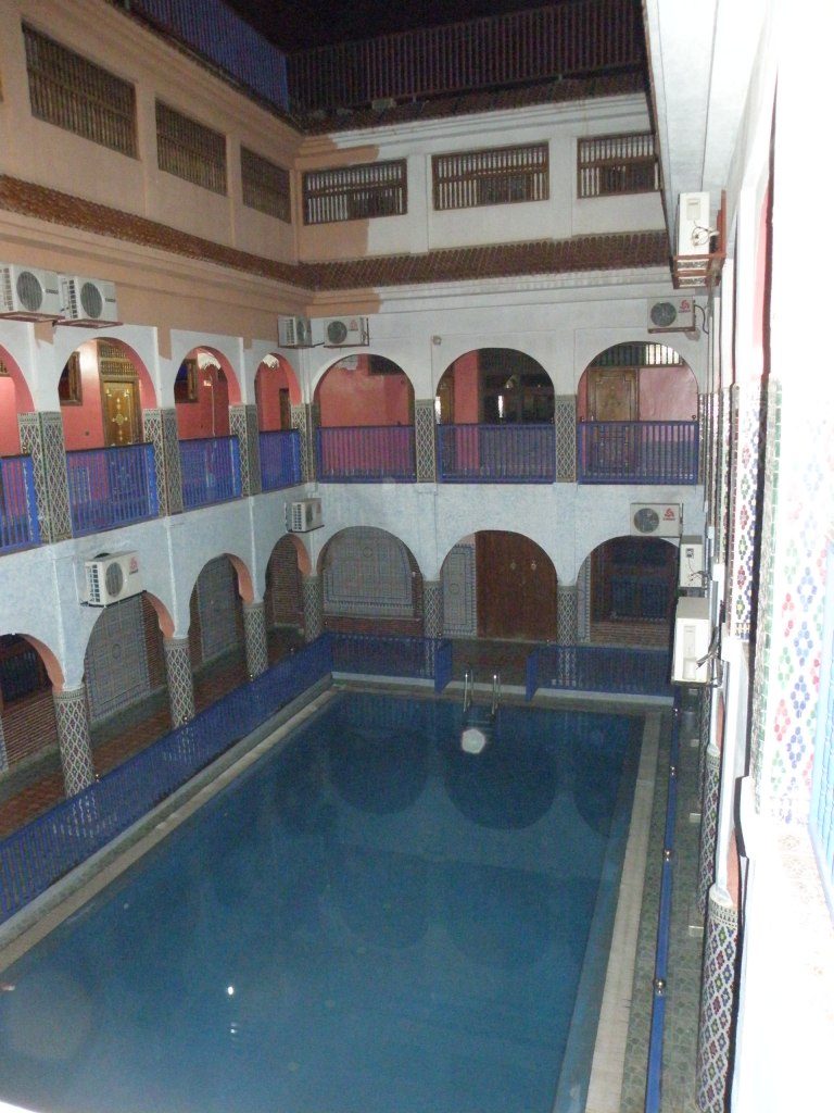 On décolle de Lyon Saint-Exupéry vers 17h15 avec 1 heure de retard. Après un voyage sans encombre, malgré quelques tours gratuits au-dessus de Marrakech, l’atterrissage se fait en douceur. Nos guides Lahcen et Hussein ainsi que « l’intendant » Saïd nous attendent dans le hall de l’aéroport. Ils nous conduisent à l’hôtel Riad Moulay Said situé au centre-ville. C’est un très bel hôtel et l’accueil de nos est très sympathique.