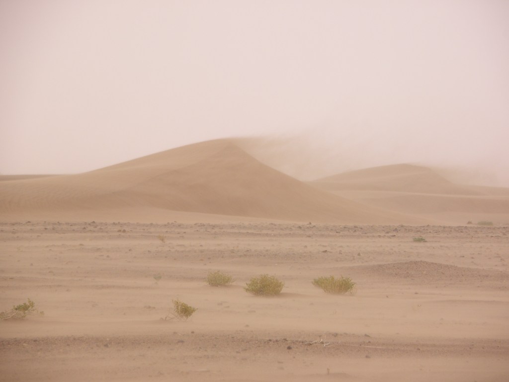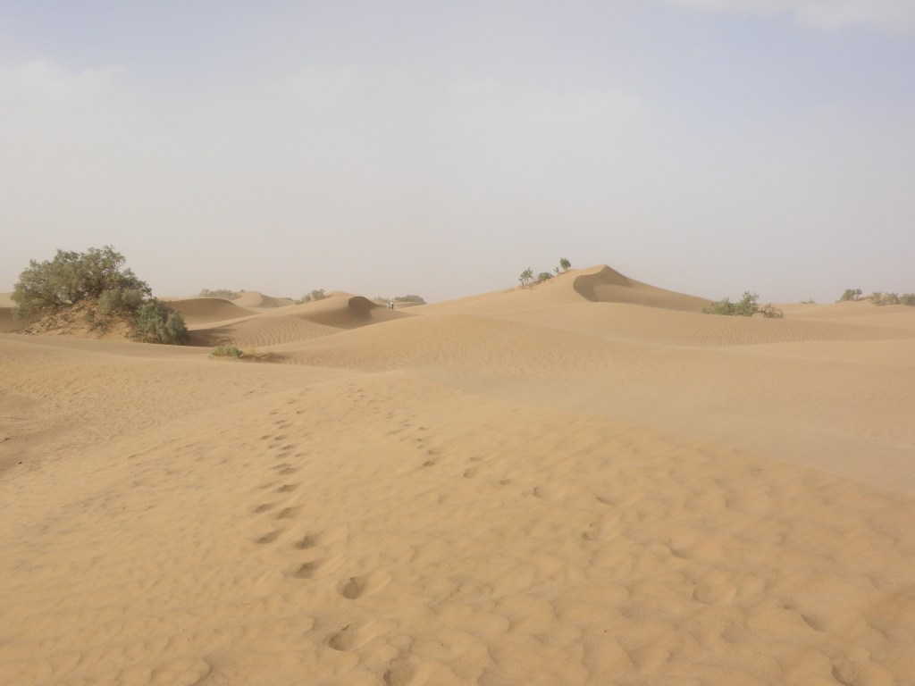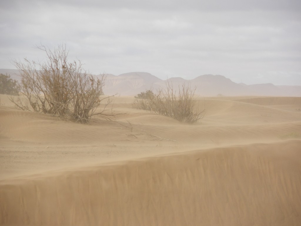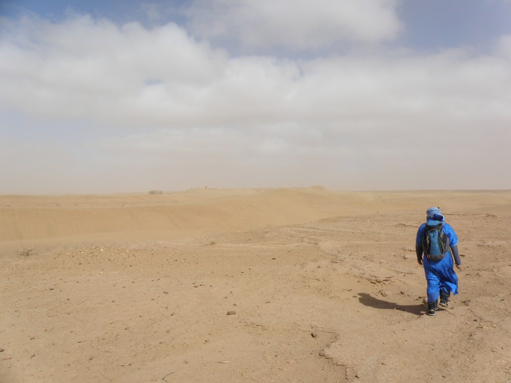 Le ciel est un peu gris et le vent se lève en cours de matinée pour souffler en tempête un peu plus tard. Pas de coupure à midi et nous filons contre le vent et le sable jusqu’à 14h30 pour enfin prendre notre repas à l’abri des tentes…
