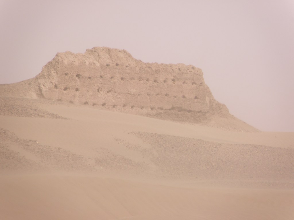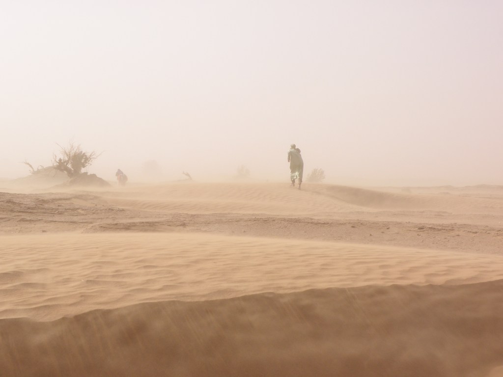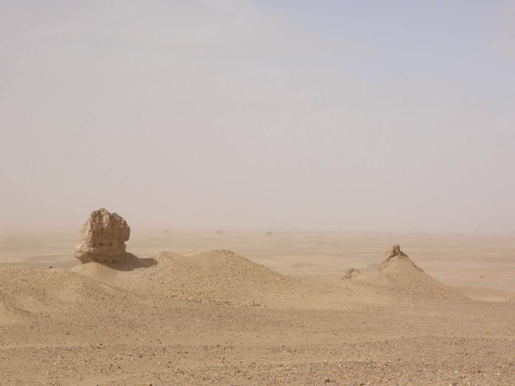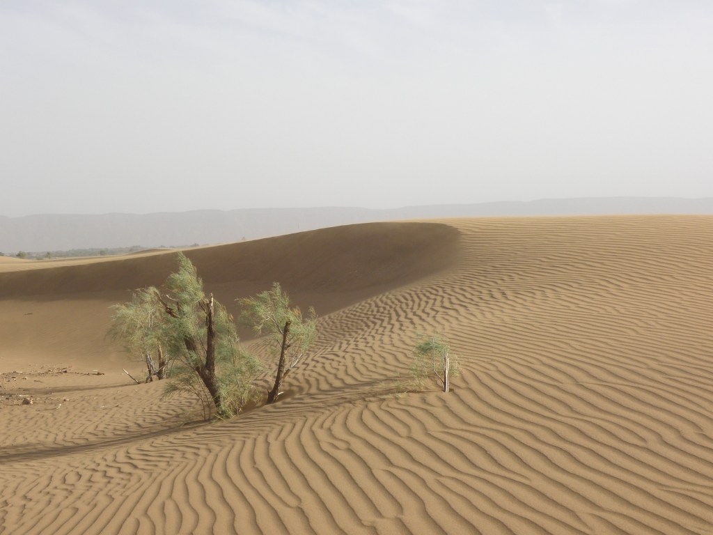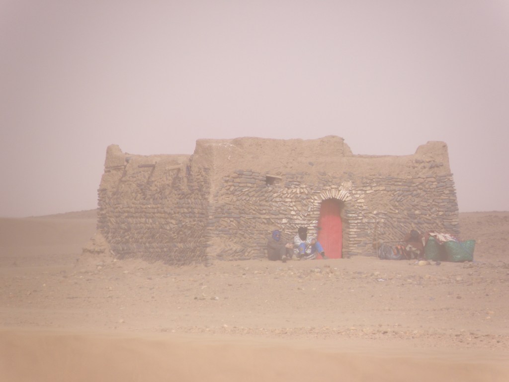 Le ciel est un peu gris et le vent se lève en cours de matinée pour souffler en tempête un peu plus tard. Pas de coupure à midi et nous filons contre le vent et le sable jusqu’à 14h30 pour enfin prendre notre repas à l’abri des tentes…