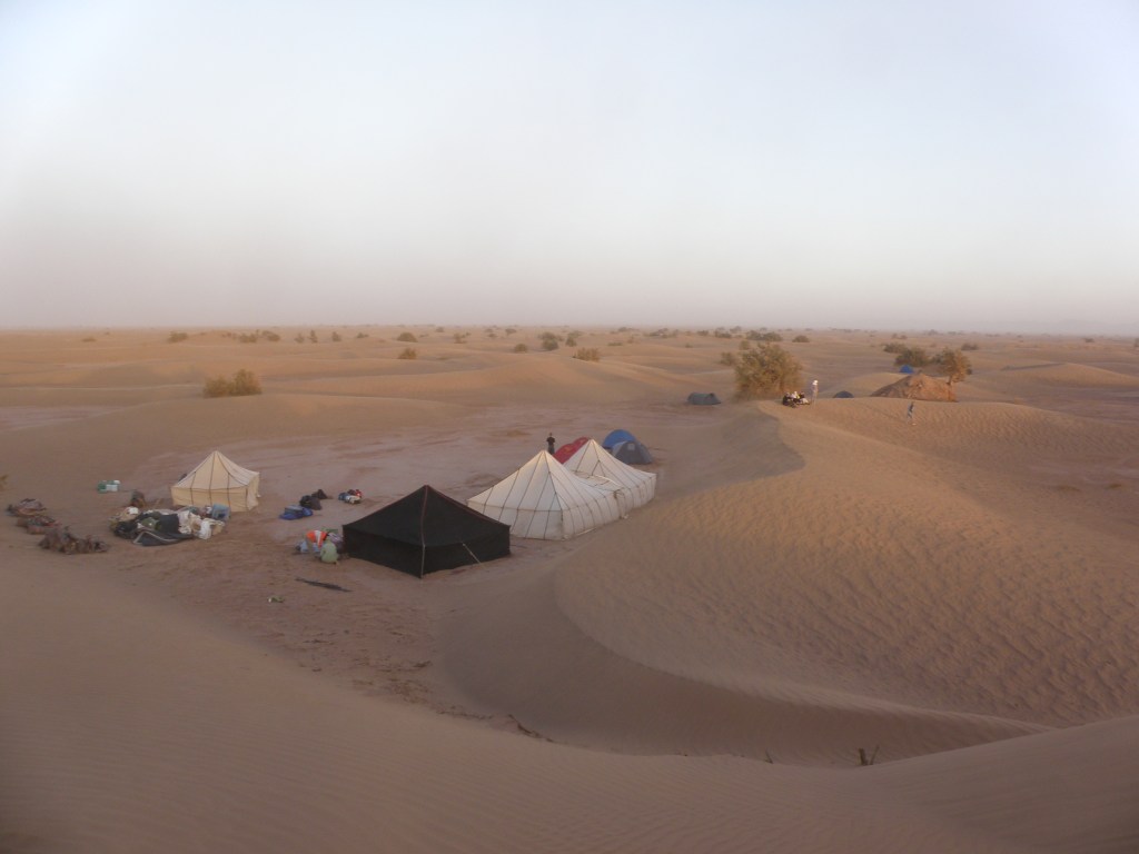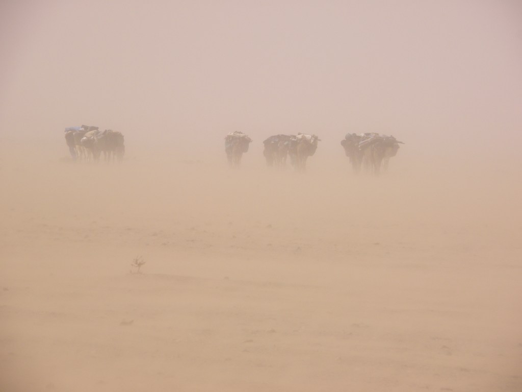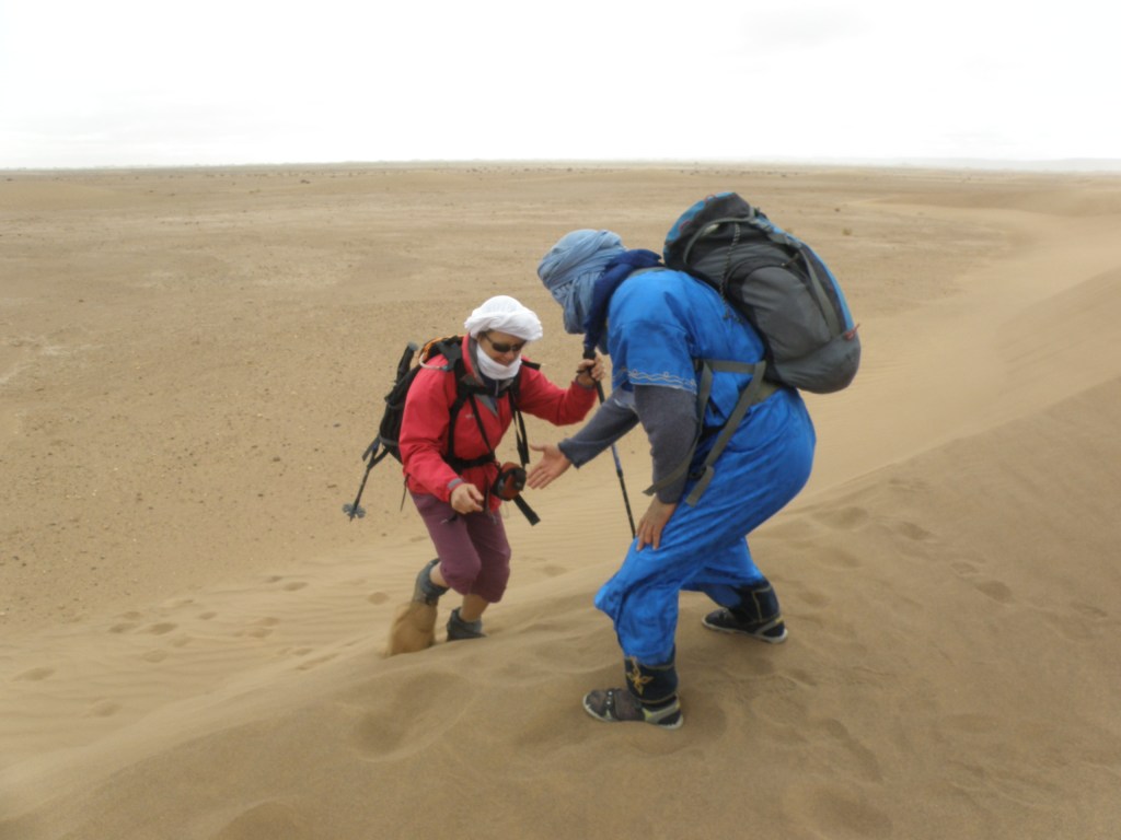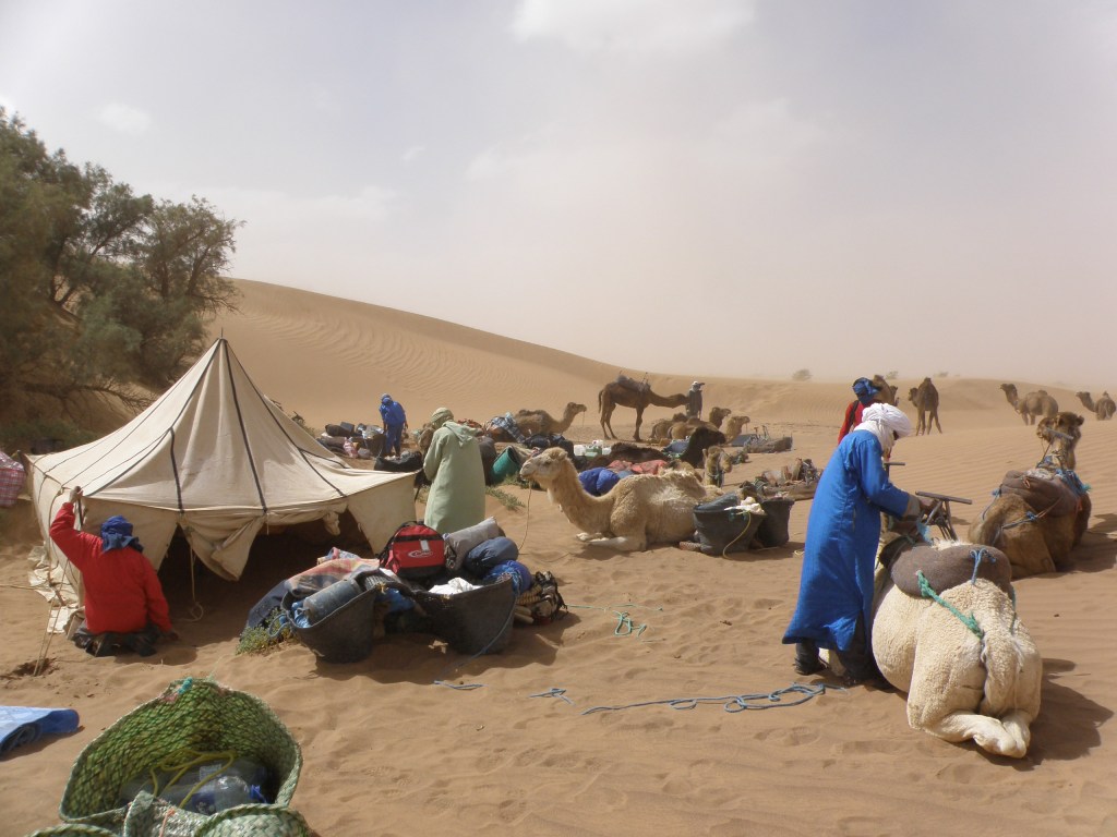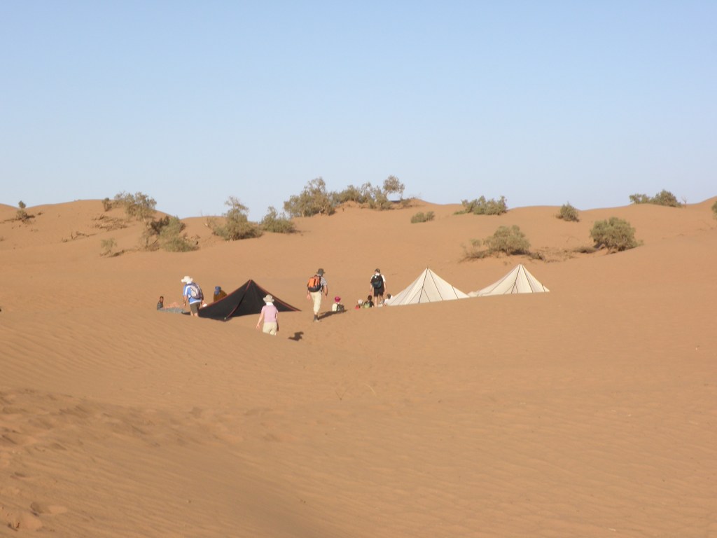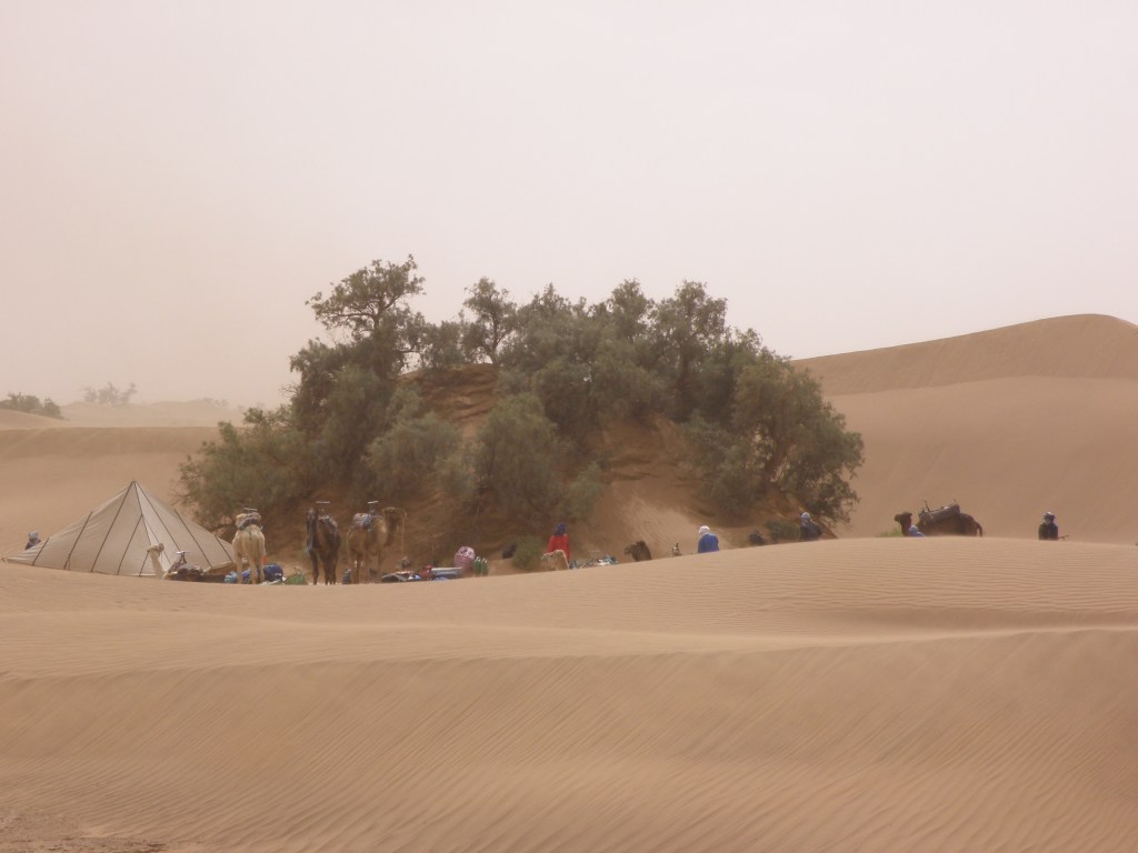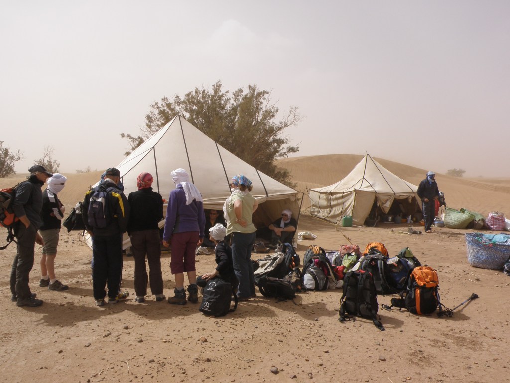 La tempête de sable reprend de plus belle et nos chèches nous sont bien utiles. A midi, chameliers et cuisiniers arrivent à monter 2 tentes pour le repas : une pour la cuisine, une autres pour la salle à manger. Comme pour tous les repas, les 2 groupes se rejoignent. L’après-midi environ 2 heures de marche sont nécessaires pour rejoindre le campement déjà monté par les chameliers, mais le manque de visibilité dû à la tempête perturbe l’orientation de nos guides pour trouver le point exact du camp. Après un petit moment d’hésitation, tout rentre dans l’ordre et on se réfugie à l’abri des tentes… On doit monter nos petites tentes dômes pour la nuit et ce n’est pas si évident que ça avec le vent…
