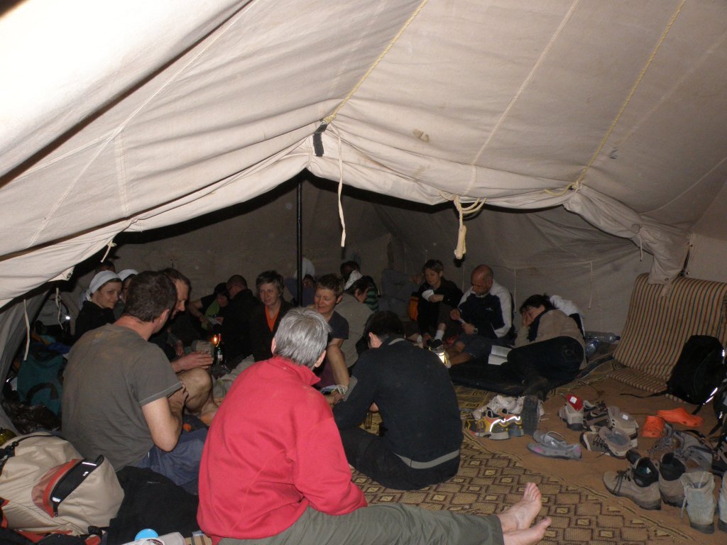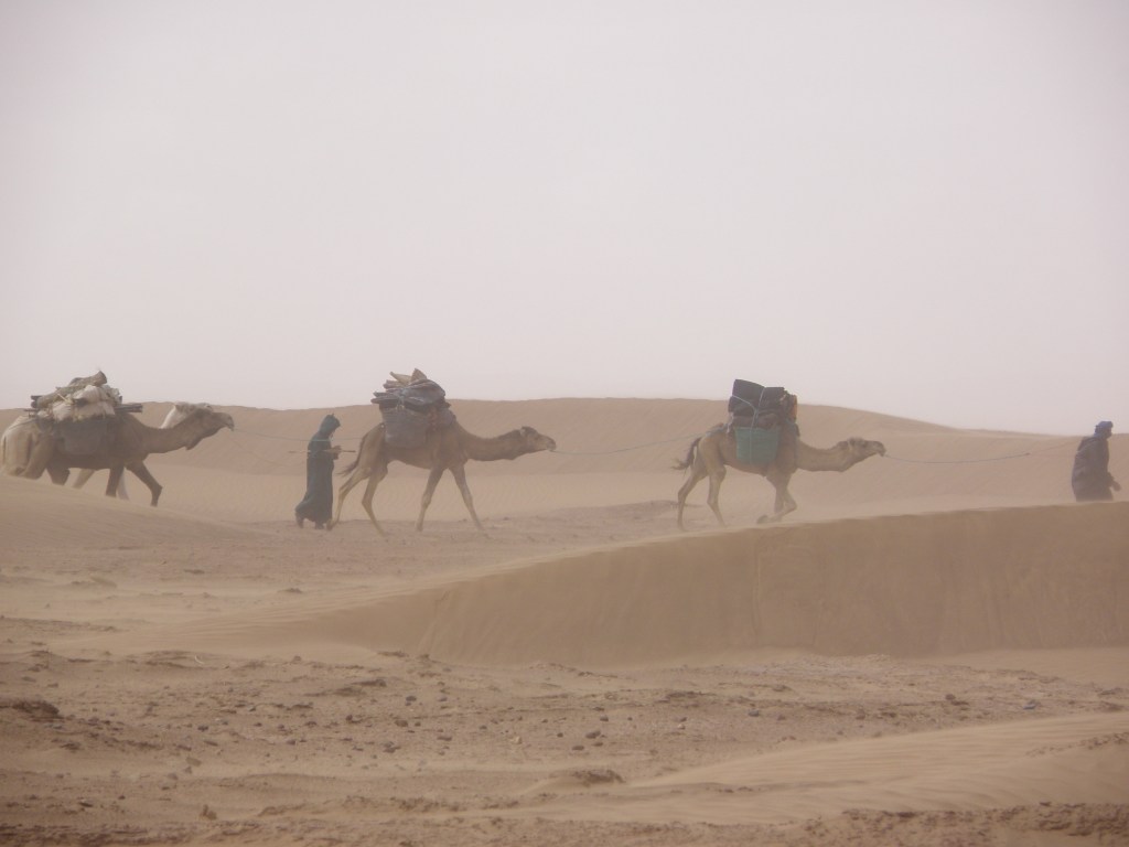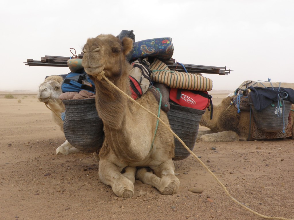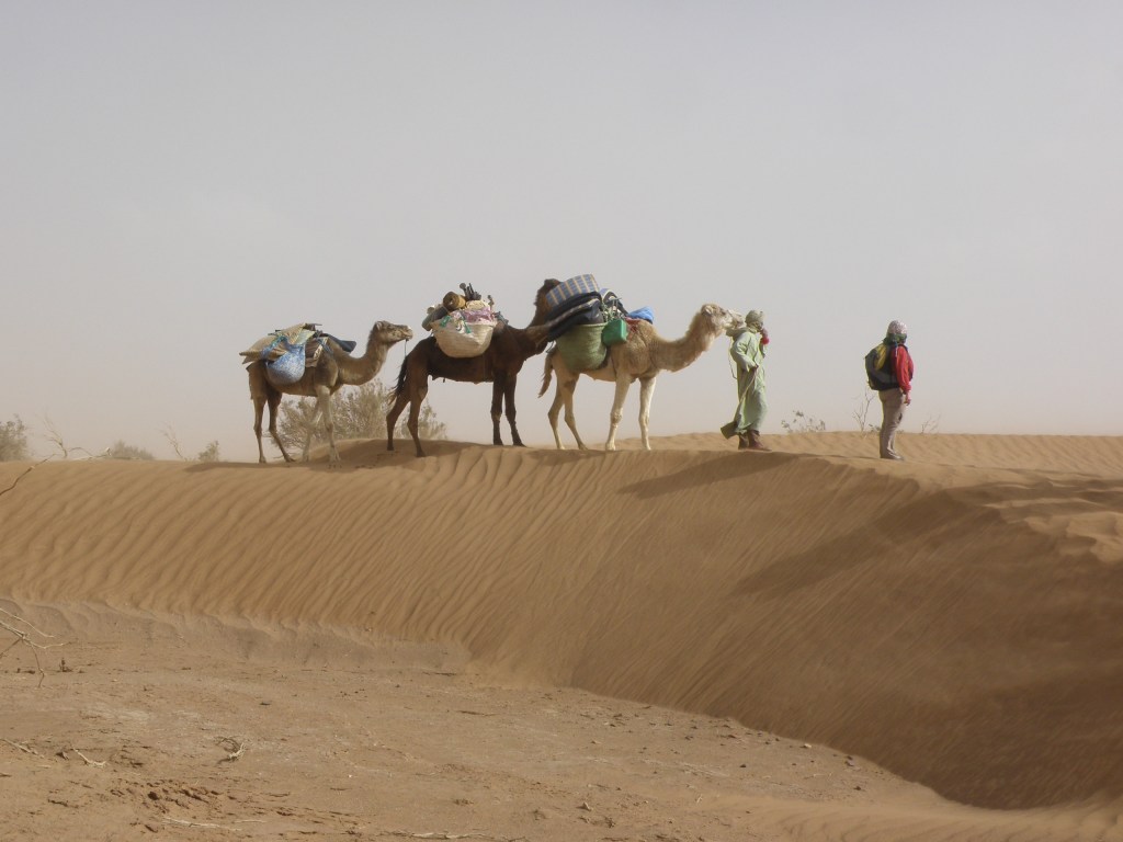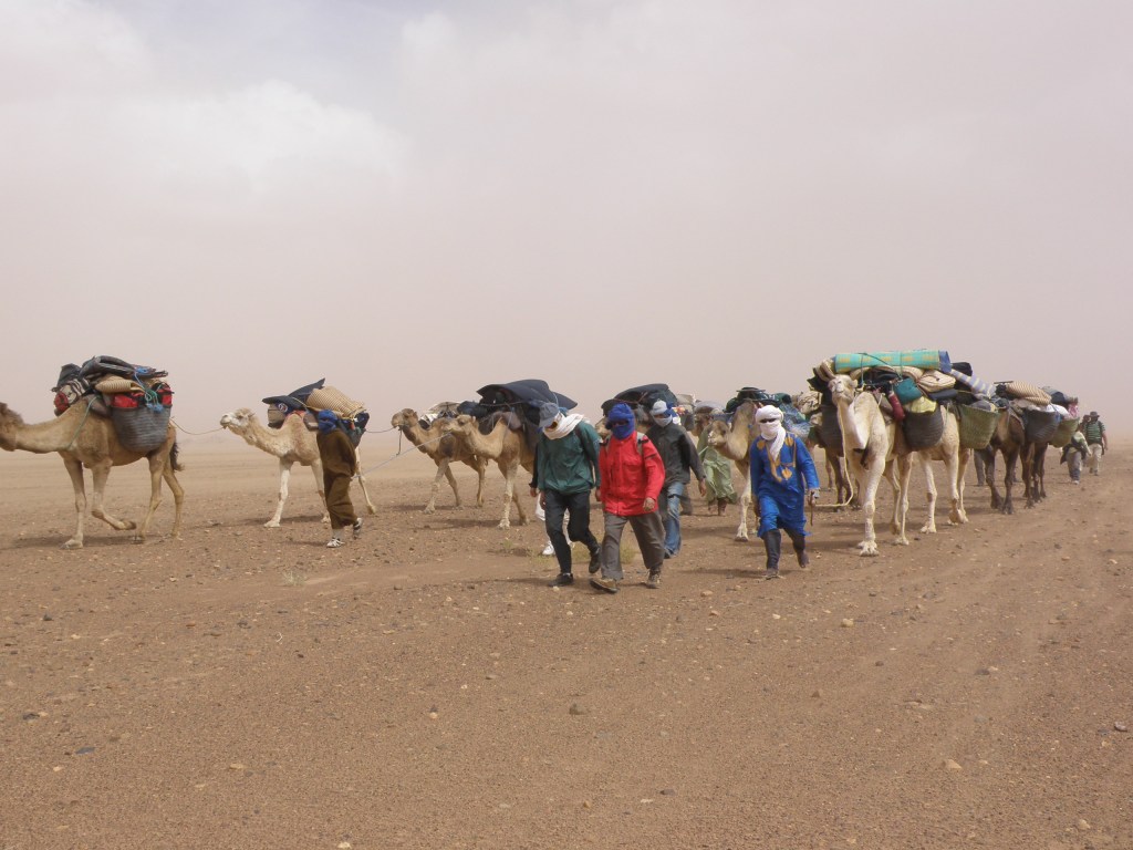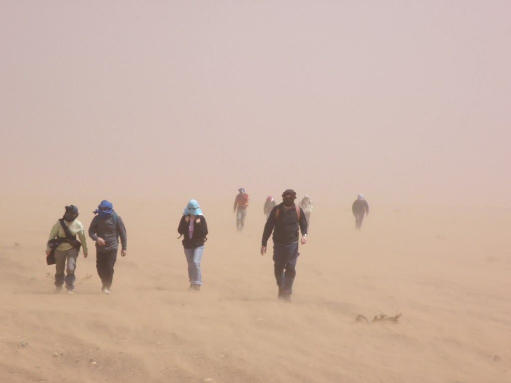 La tempête de sable reprend de plus belle et nos chèches nous sont bien utiles. A midi, chameliers et cuisiniers arrivent à monter 2 tentes pour le repas : une pour la cuisine, une autres pour la salle à manger. Comme pour tous les repas, les 2 groupes se rejoignent. L’après-midi environ 2 heures de marche sont nécessaires pour rejoindre le campement déjà monté par les chameliers, mais le manque de visibilité dû à la tempête perturbe l’orientation de nos guides pour trouver le point exact du camp. Après un petit moment d’hésitation, tout rentre dans l’ordre et on se réfugie à l’abri des tentes… On doit monter nos petites tentes dômes pour la nuit et ce n’est pas si évident que ça avec le vent…