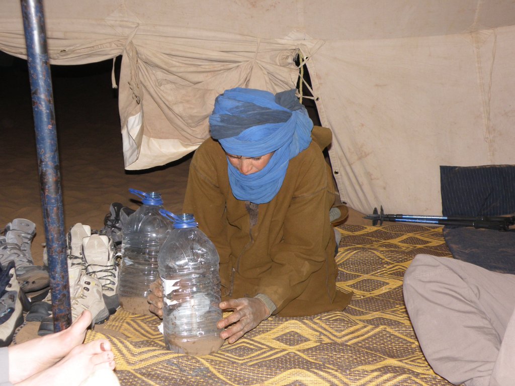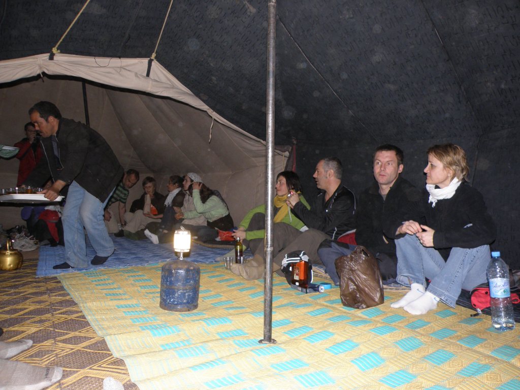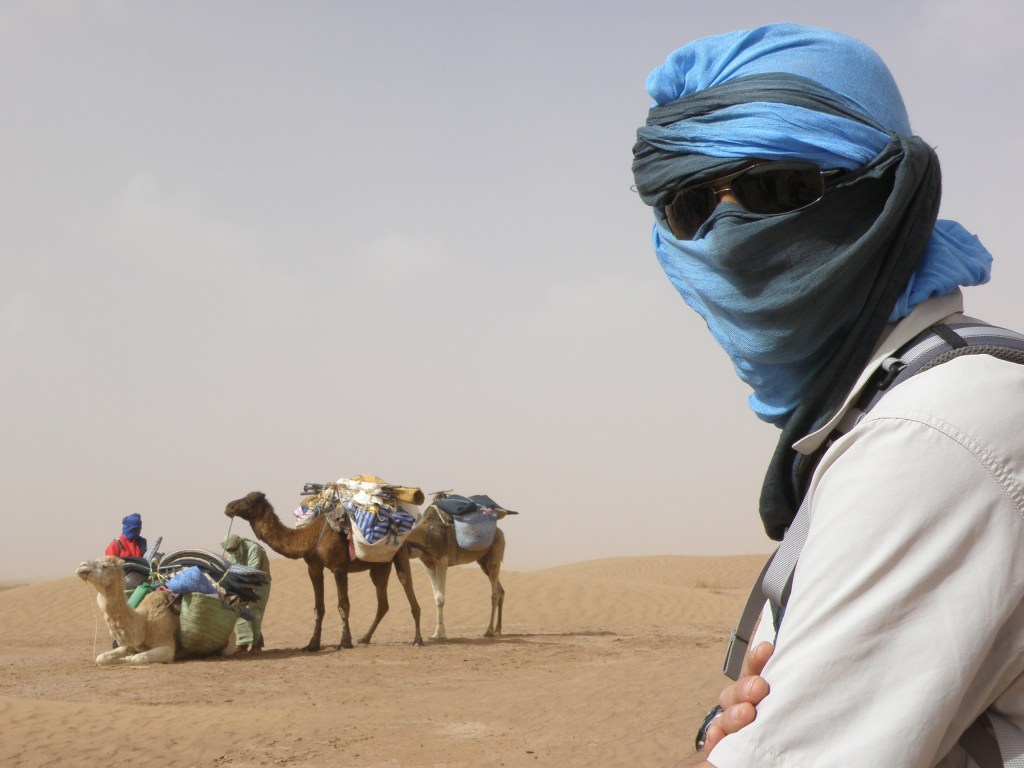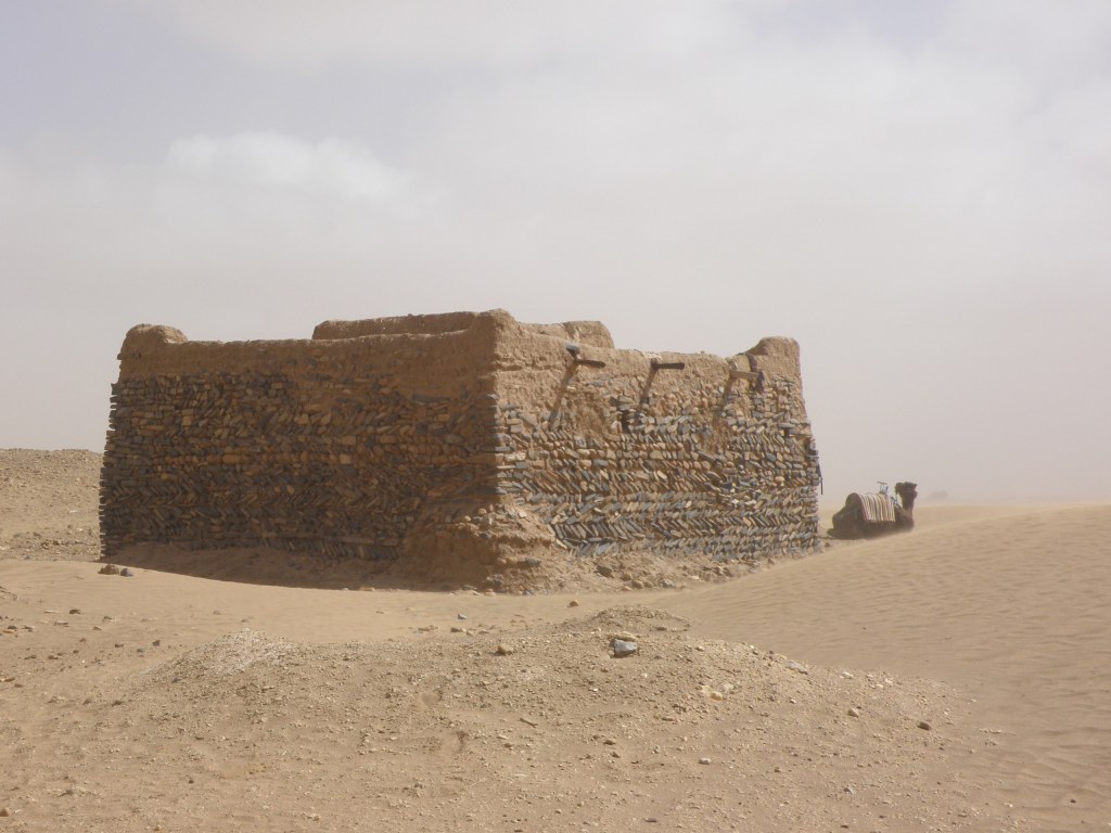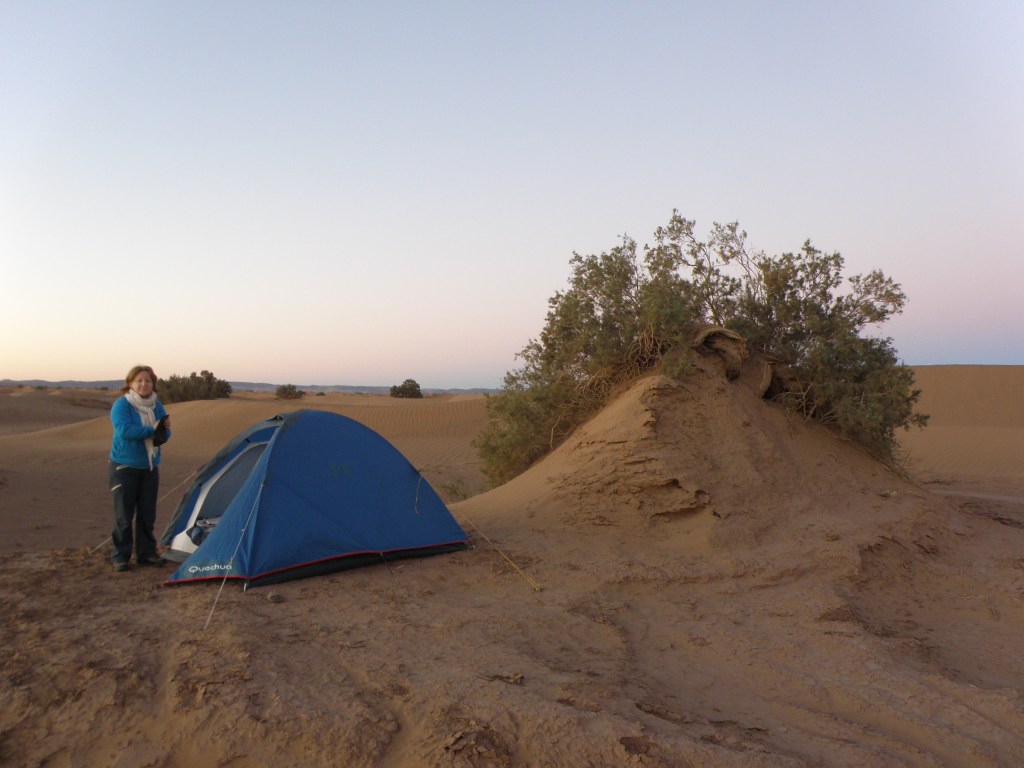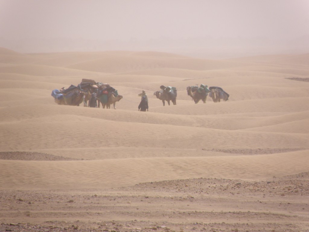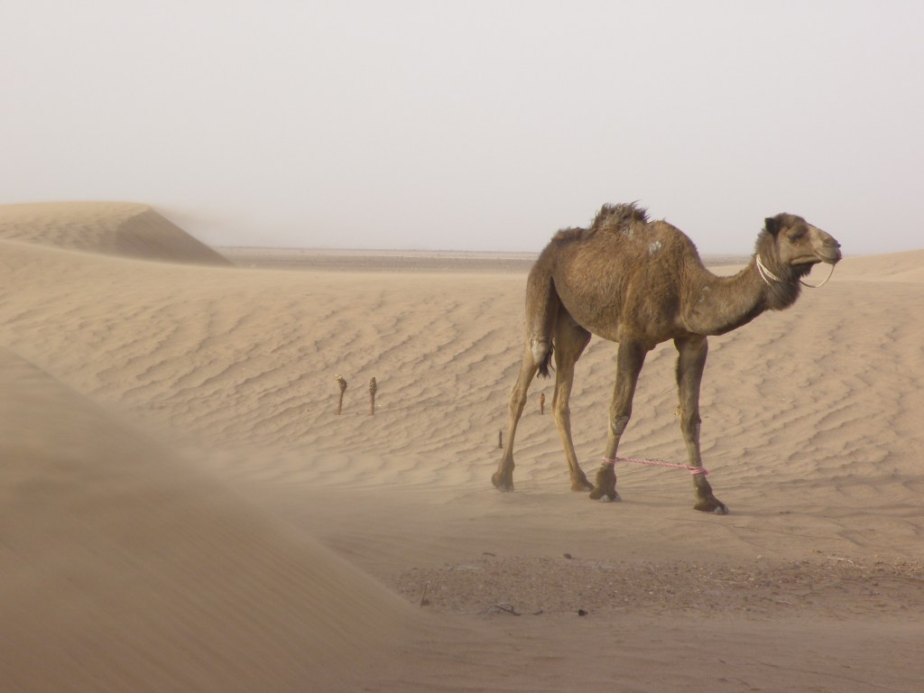 La tempête de sable reprend de plus belle et nos chèches nous sont bien utiles. A midi, chameliers et cuisiniers arrivent à monter 2 tentes pour le repas : une pour la cuisine, une autres pour la salle à manger. Comme pour tous les repas, les 2 groupes se rejoignent. L’après-midi environ 2 heures de marche sont nécessaires pour rejoindre le campement déjà monté par les chameliers, mais le manque de visibilité dû à la tempête perturbe l’orientation de nos guides pour trouver le point exact du camp. Après un petit moment d’hésitation, tout rentre dans l’ordre et on se réfugie à l’abri des tentes… On doit monter nos petites tentes dômes pour la nuit et ce n’est pas si évident que ça avec le vent…