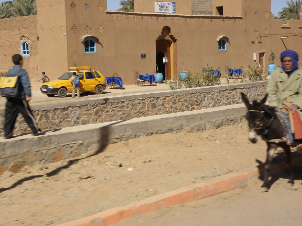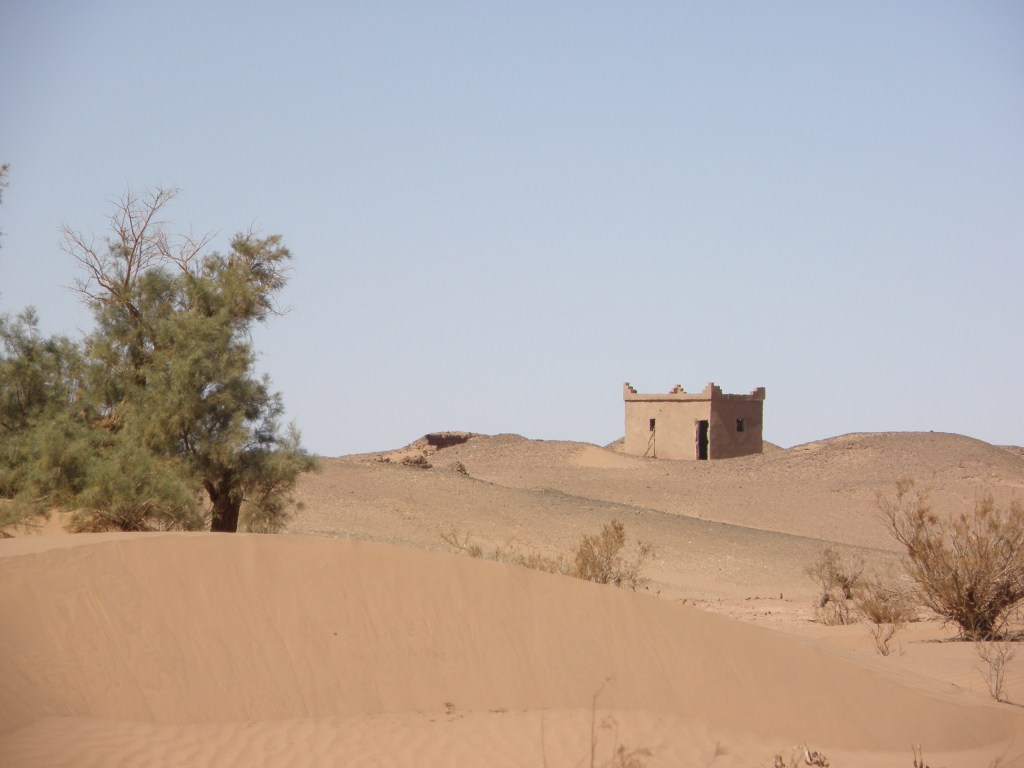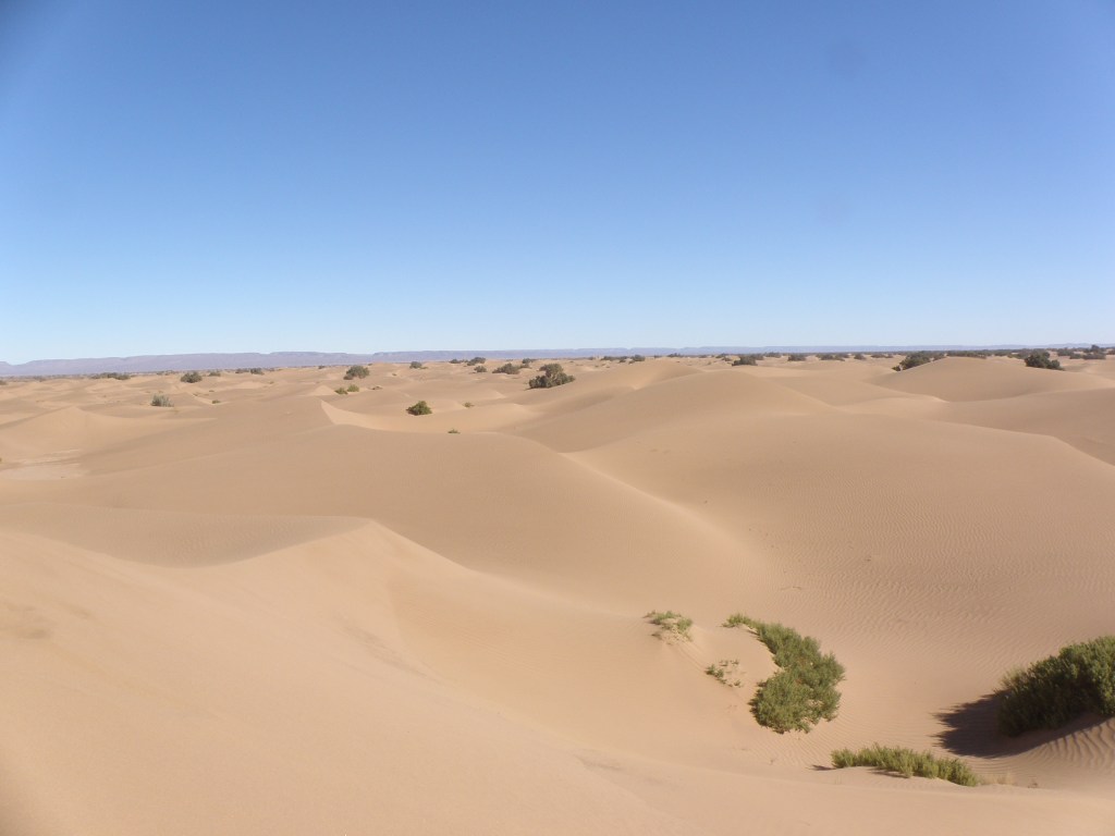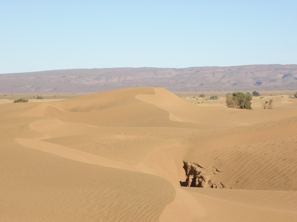 Ça y est, nous y sommes : le groupe est partagé en 2. 15 d’un côté avec Lahcen et 12 de l’autre avec Hussein. Nous faisons partie des 12… nous traversons un petit village à moitié en ruine puis pénétrons le désert… On alterne les dunes et leur sable mou avec des plateaux plus durs.
