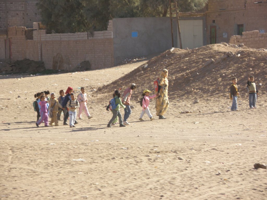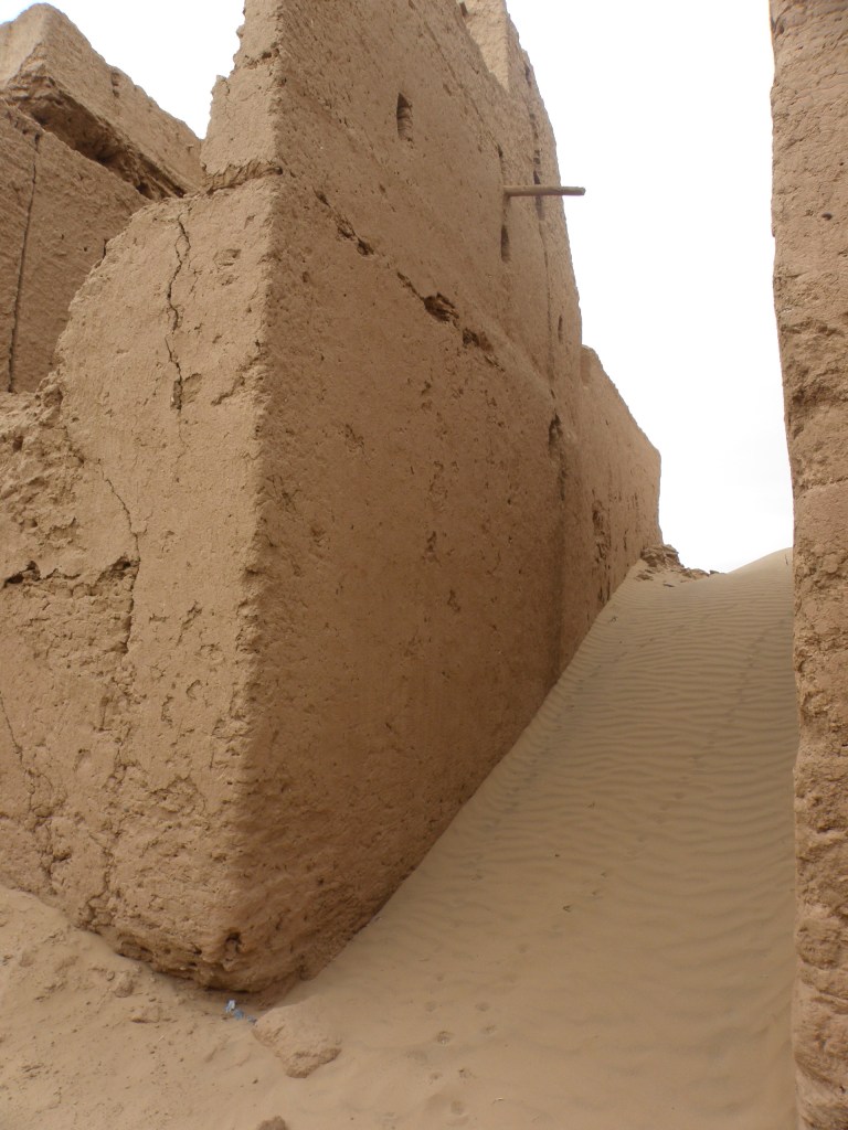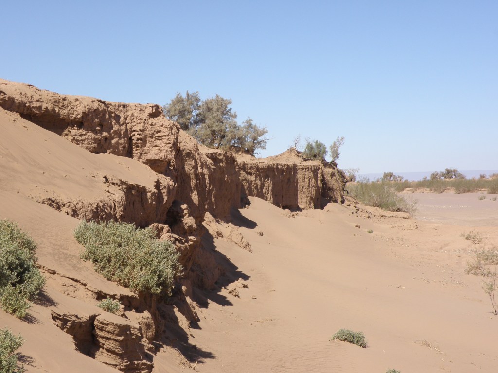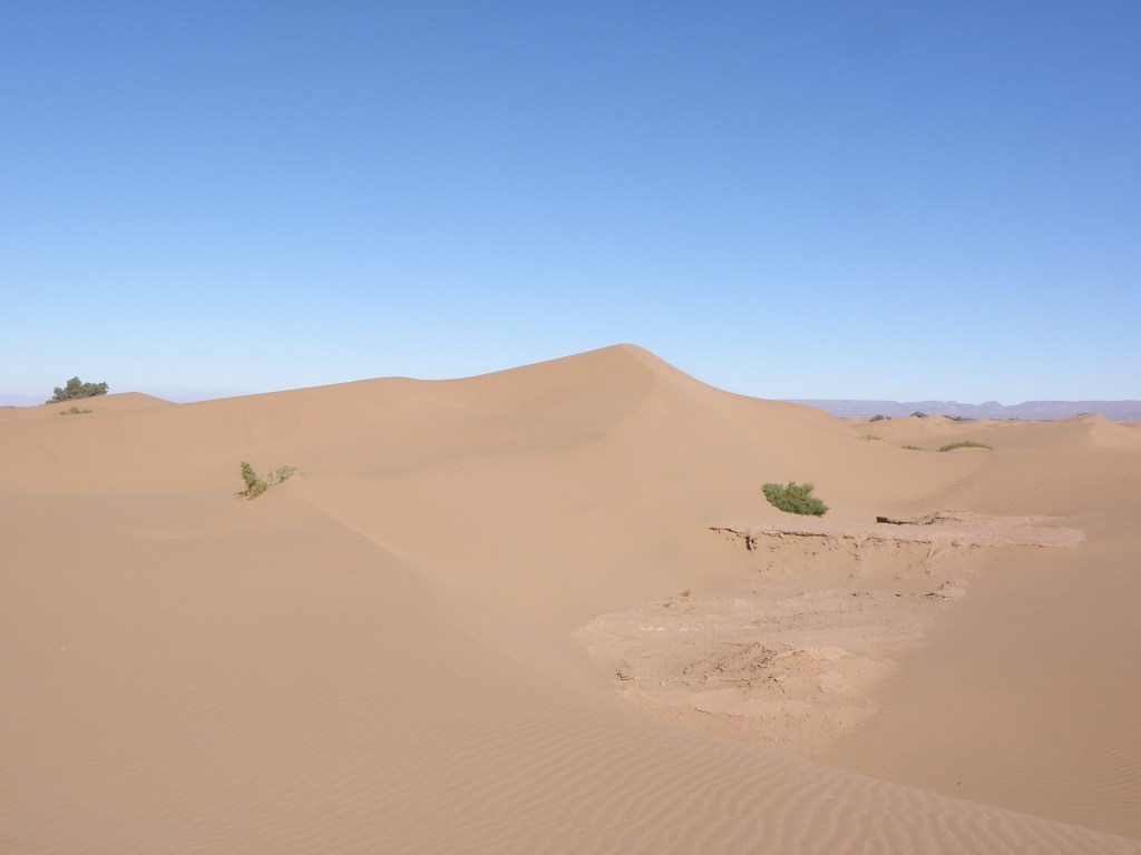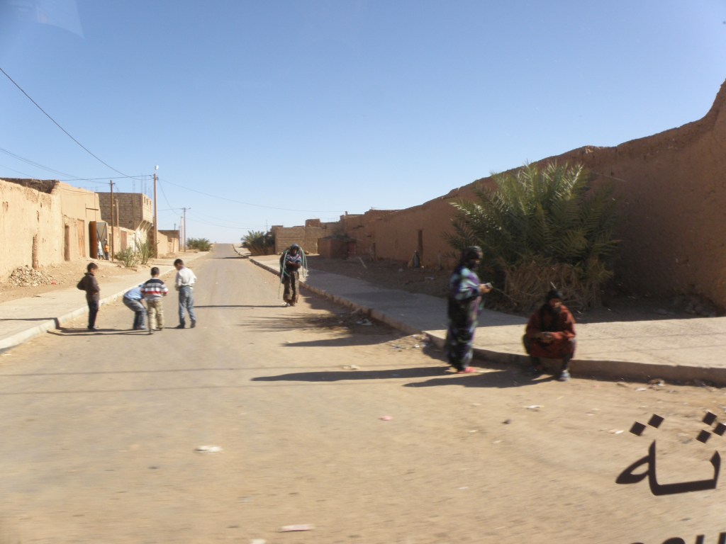 Ça y est, nous y sommes : le groupe est partagé en 2. 15 d’un côté avec Lahcen et 12 de l’autre avec Hussein. Nous faisons partie des 12… nous traversons un petit village à moitié en ruine puis pénétrons le désert… On alterne les dunes et leur sable mou avec des plateaux plus durs.