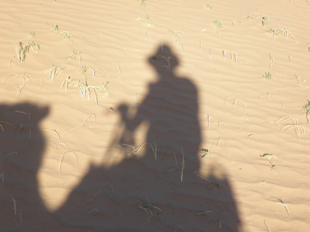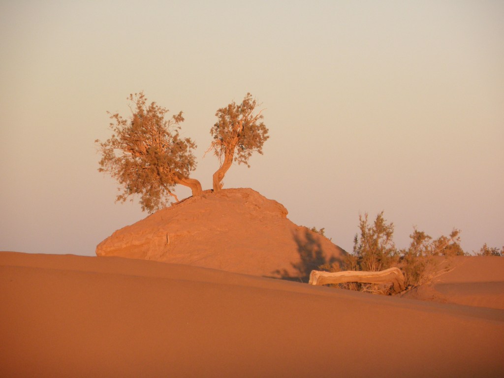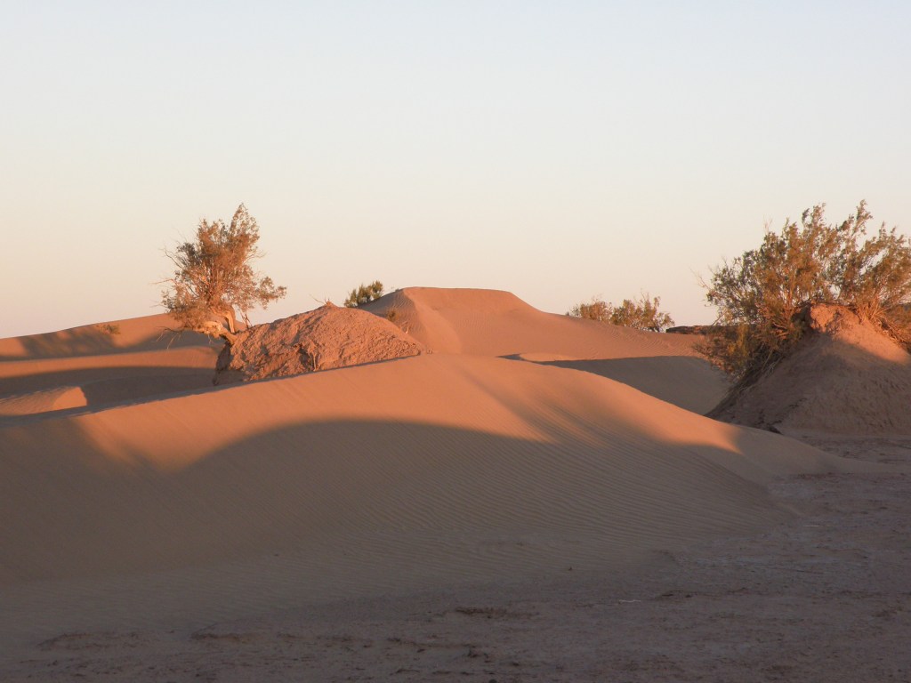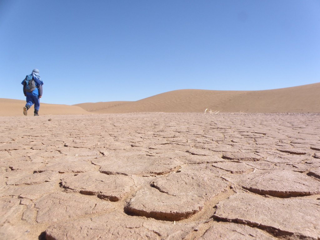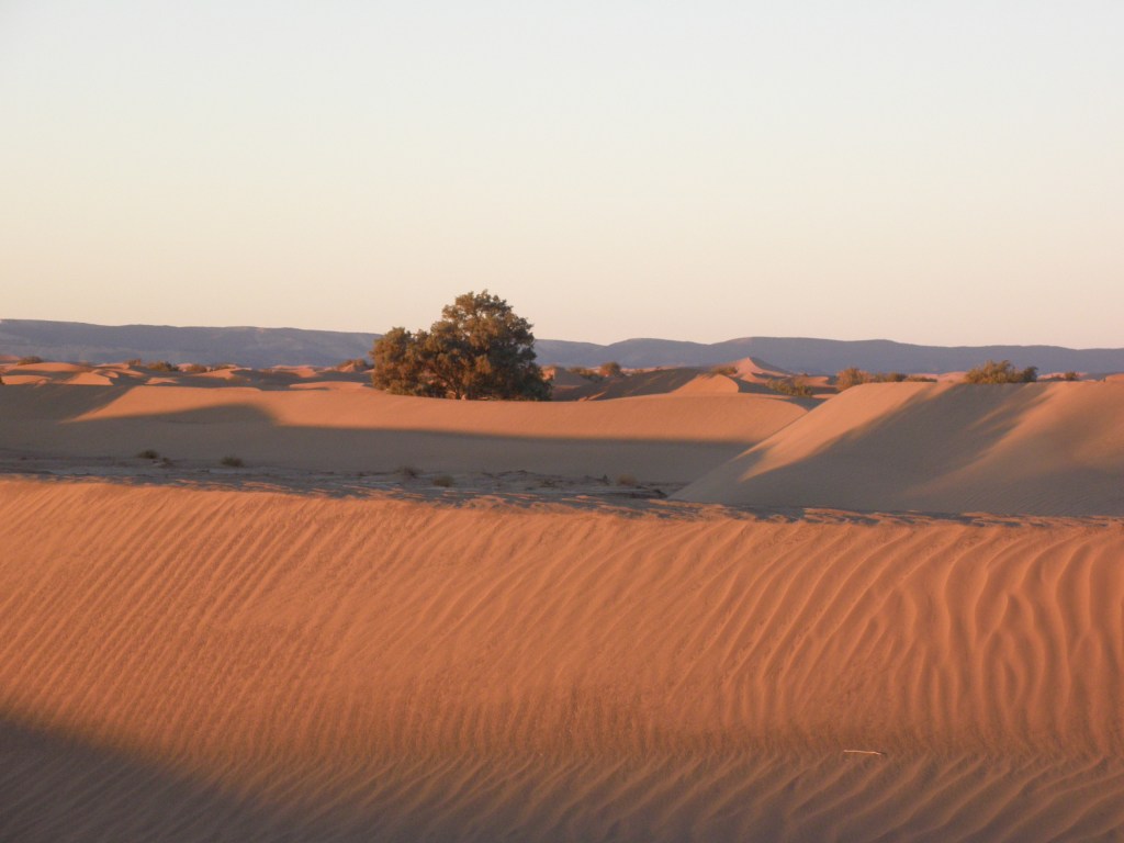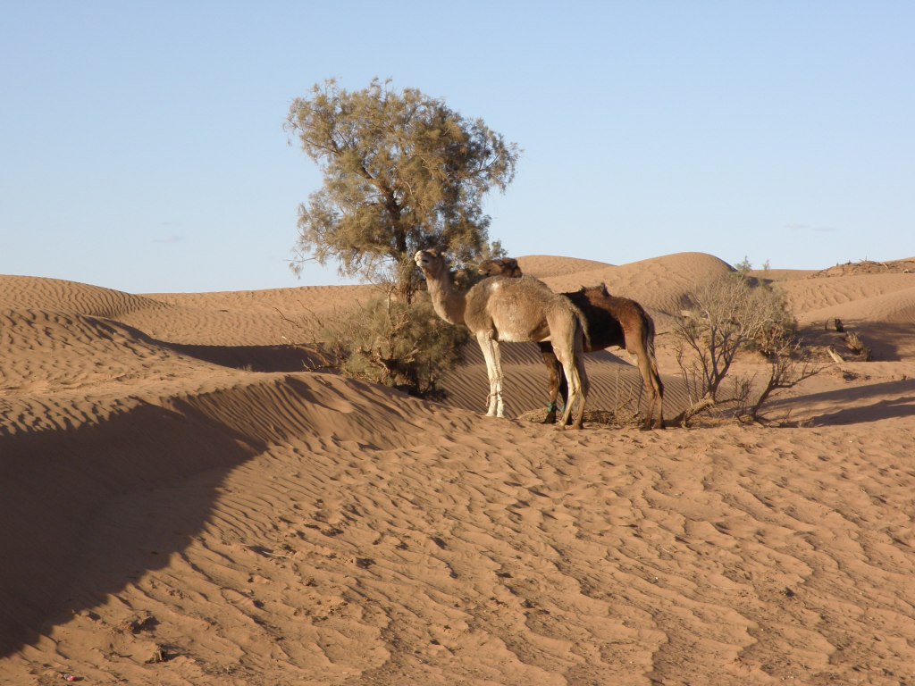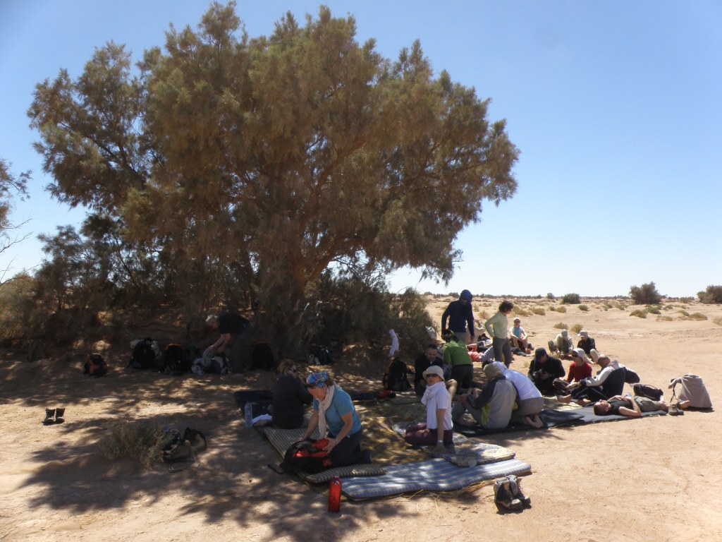 Après un magnifique lever de soleil, nous repartons pour une nouvelle étape de désert. Les paysages sont peu variés mais la végétation change de temps à autre et surtout, la visibilité est désormais excellente et nous permet de voir très loin à chaque montée de dune. On peu également observer les traces d’animaux dans le sable, comme on les verrait sur la neige : coléoptères, rongeurs, fennec, chacal… En dehors du traditionnel tamaris, la végétation se compose aussi de lacalutropis (son lait peut rendre aveugle), datorale (plante hallucinogène), acacia, houria et quelques autres fleurs.