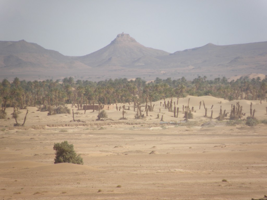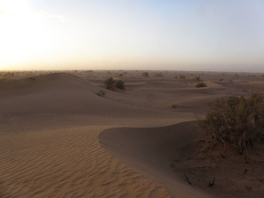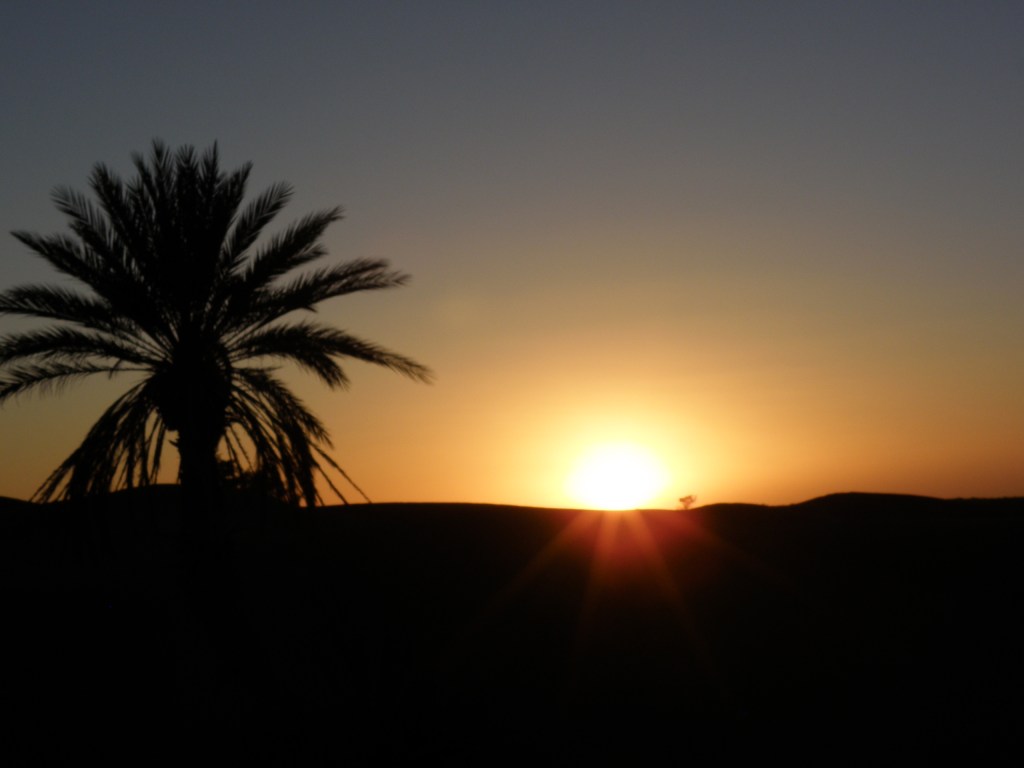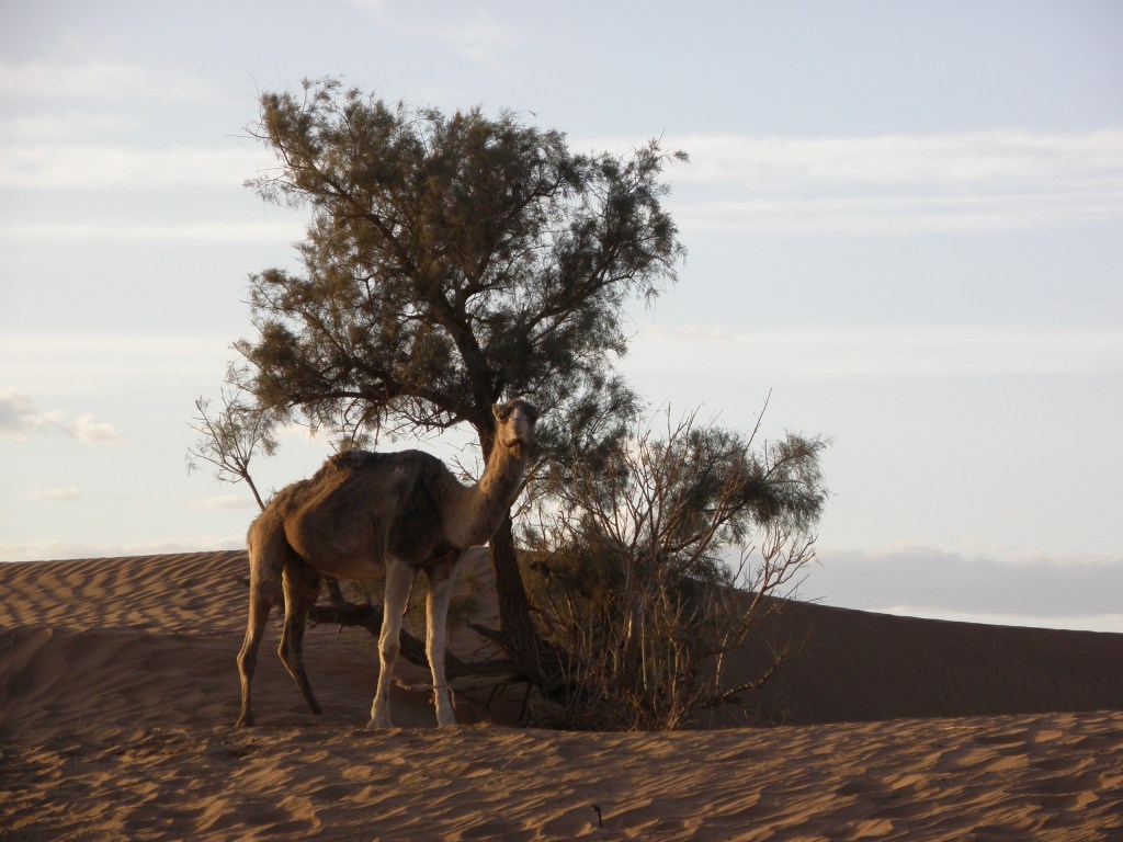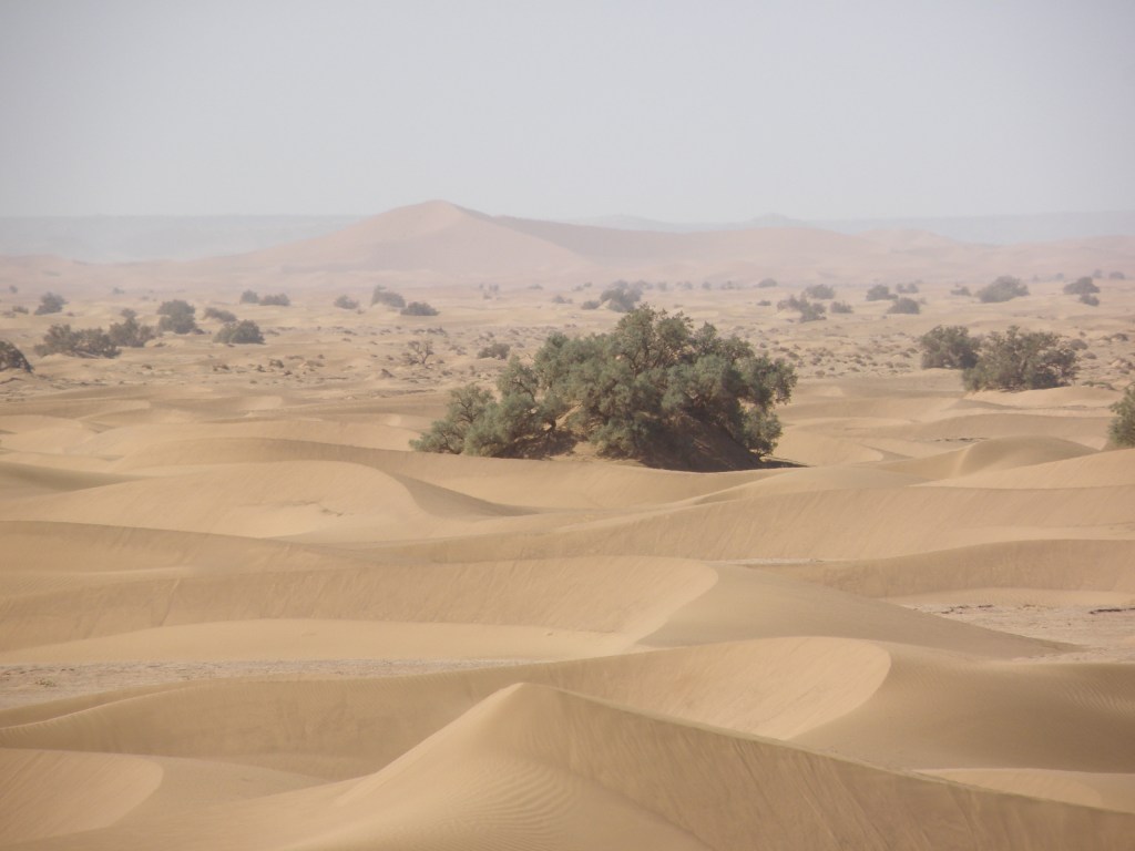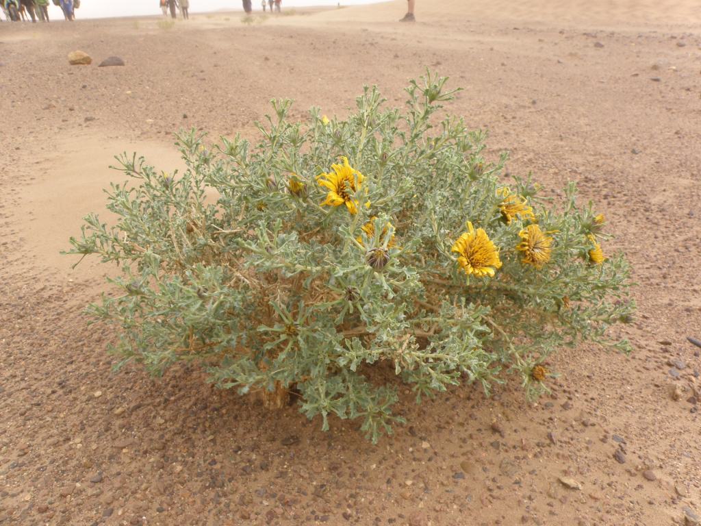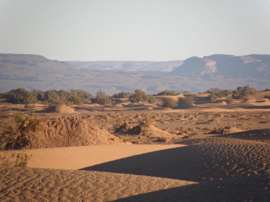 Après un magnifique lever de soleil, nous repartons pour une nouvelle étape de désert. Les paysages sont peu variés mais la végétation change de temps à autre et surtout, la visibilité est désormais excellente et nous permet de voir très loin à chaque montée de dune. On peu également observer les traces d’animaux dans le sable, comme on les verrait sur la neige : coléoptères, rongeurs, fennec, chacal… En dehors du traditionnel tamaris, la végétation se compose aussi de lacalutropis (son lait peut rendre aveugle), datorale (plante hallucinogène), acacia, houria et quelques autres fleurs.