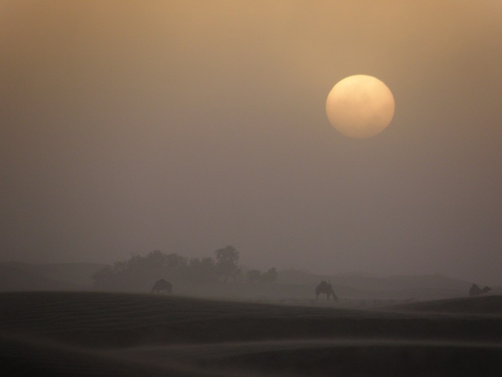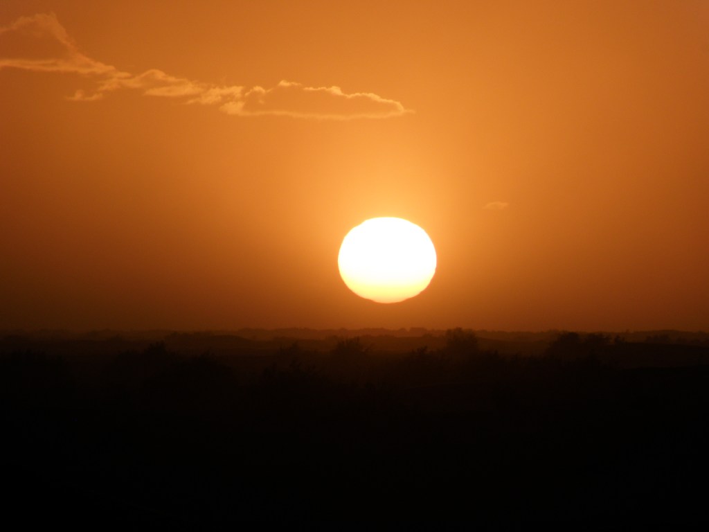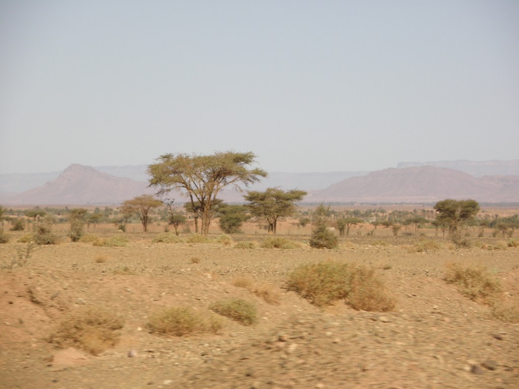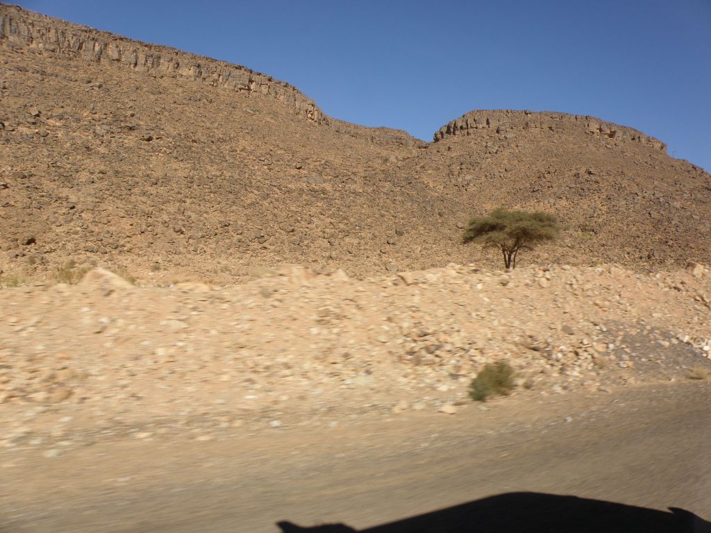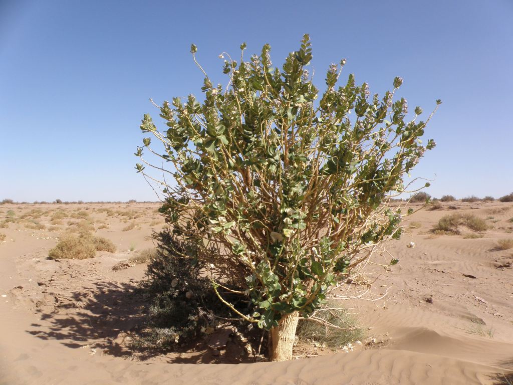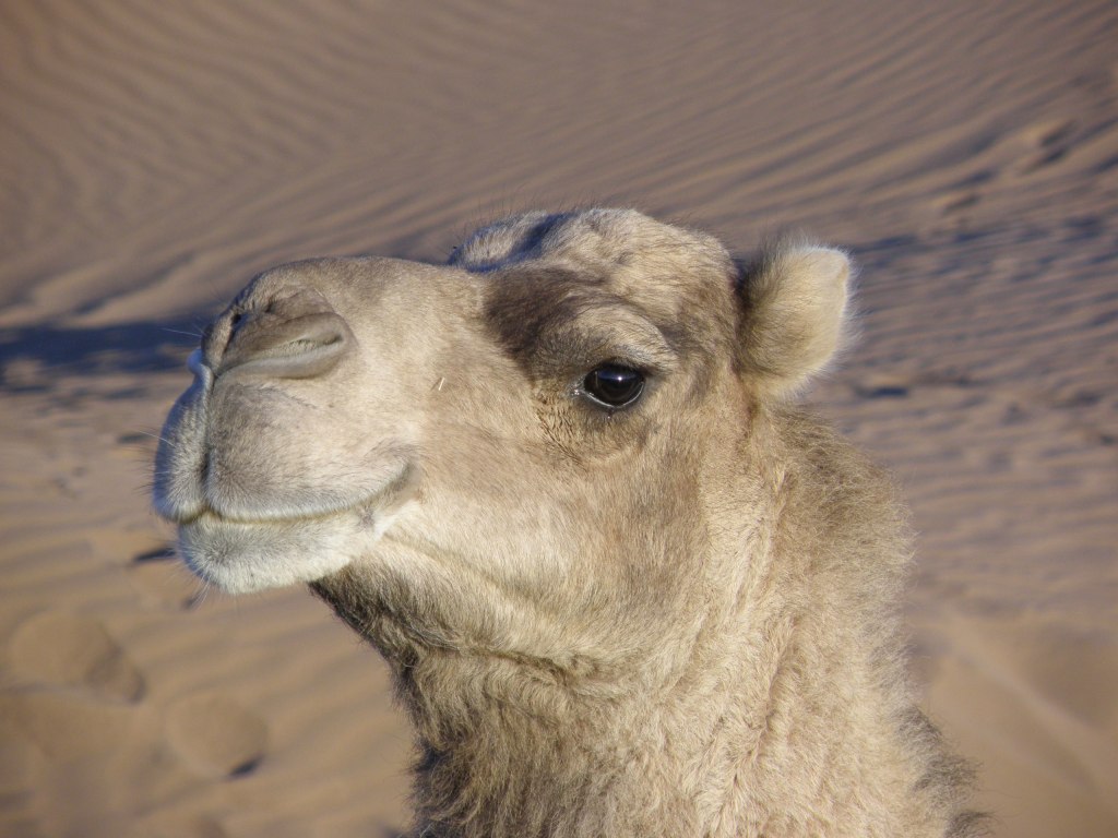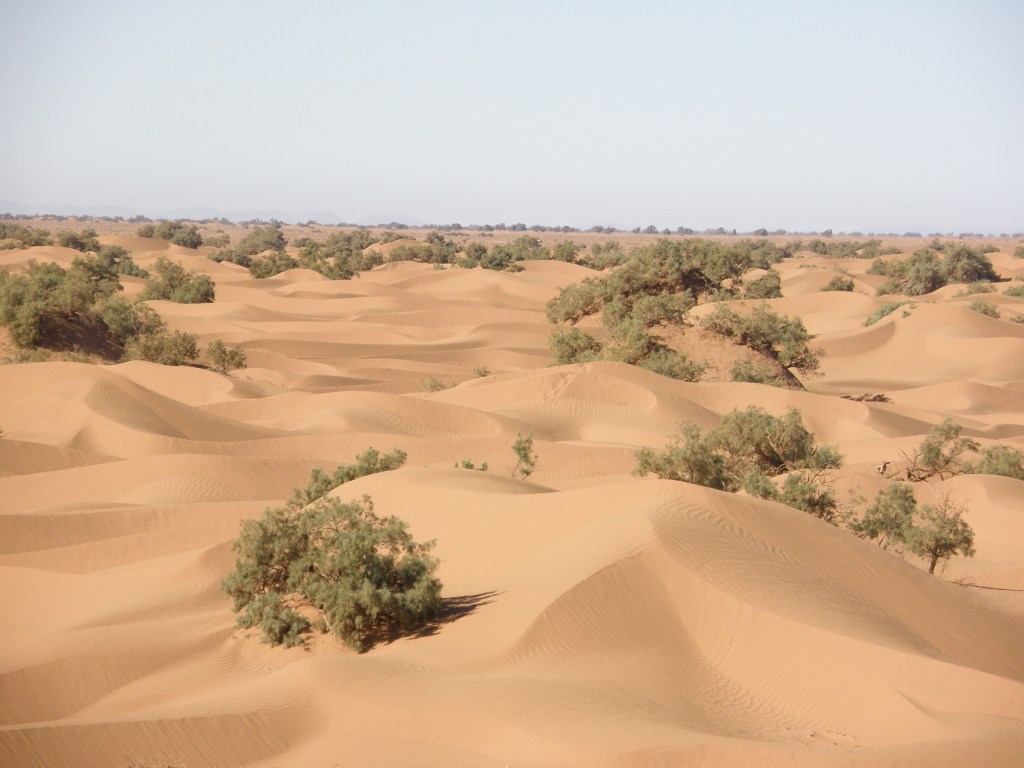 Après un magnifique lever de soleil, nous repartons pour une nouvelle étape de désert. Les paysages sont peu variés mais la végétation change de temps à autre et surtout, la visibilité est désormais excellente et nous permet de voir très loin à chaque montée de dune. On peu également observer les traces d’animaux dans le sable, comme on les verrait sur la neige : coléoptères, rongeurs, fennec, chacal… En dehors du traditionnel tamaris, la végétation se compose aussi de lacalutropis (son lait peut rendre aveugle), datorale (plante hallucinogène), acacia, houria et quelques autres fleurs.
