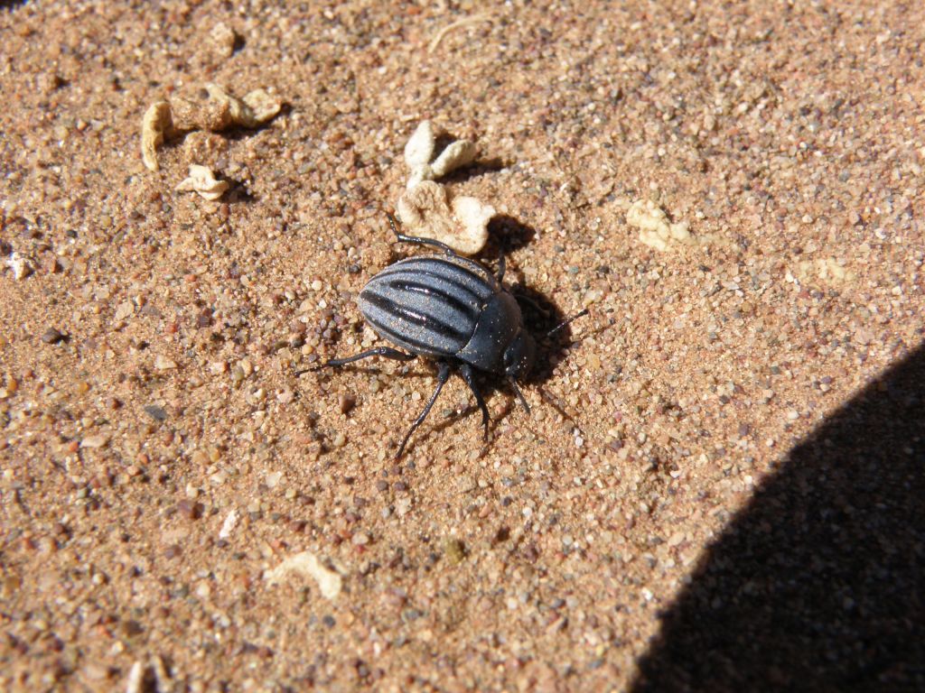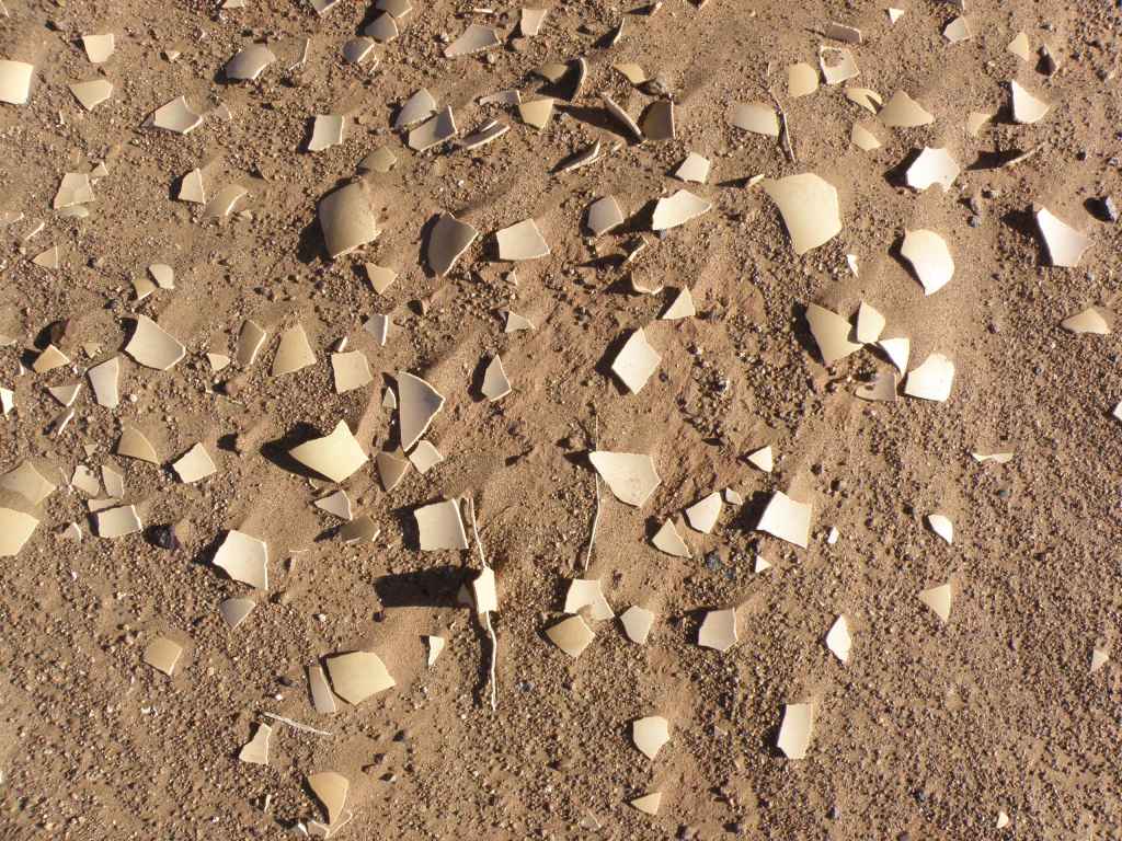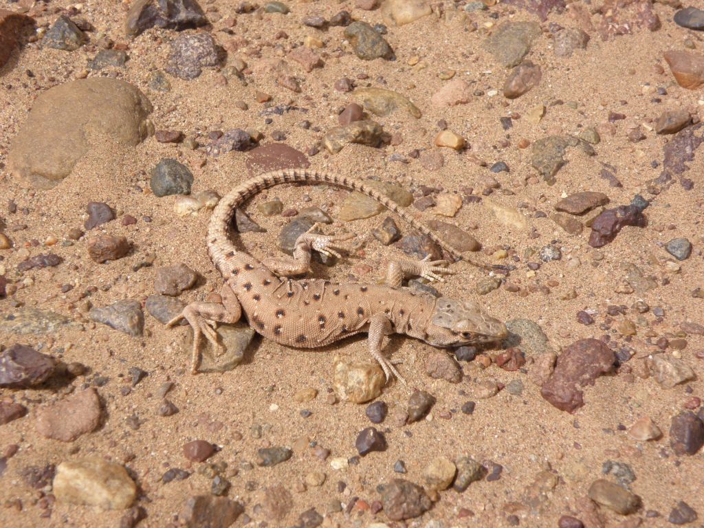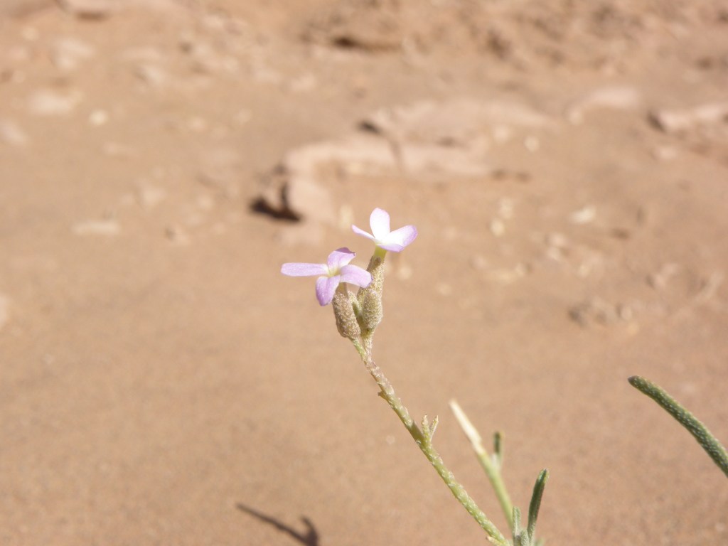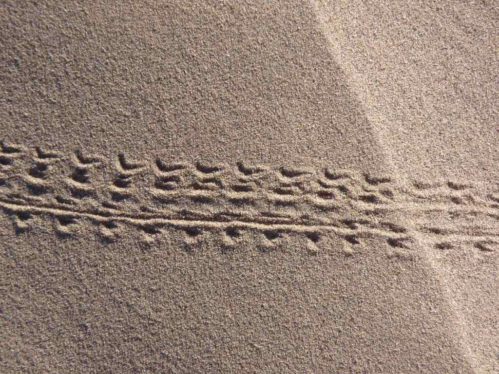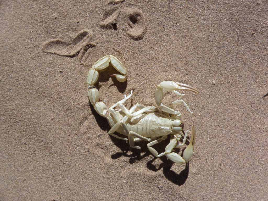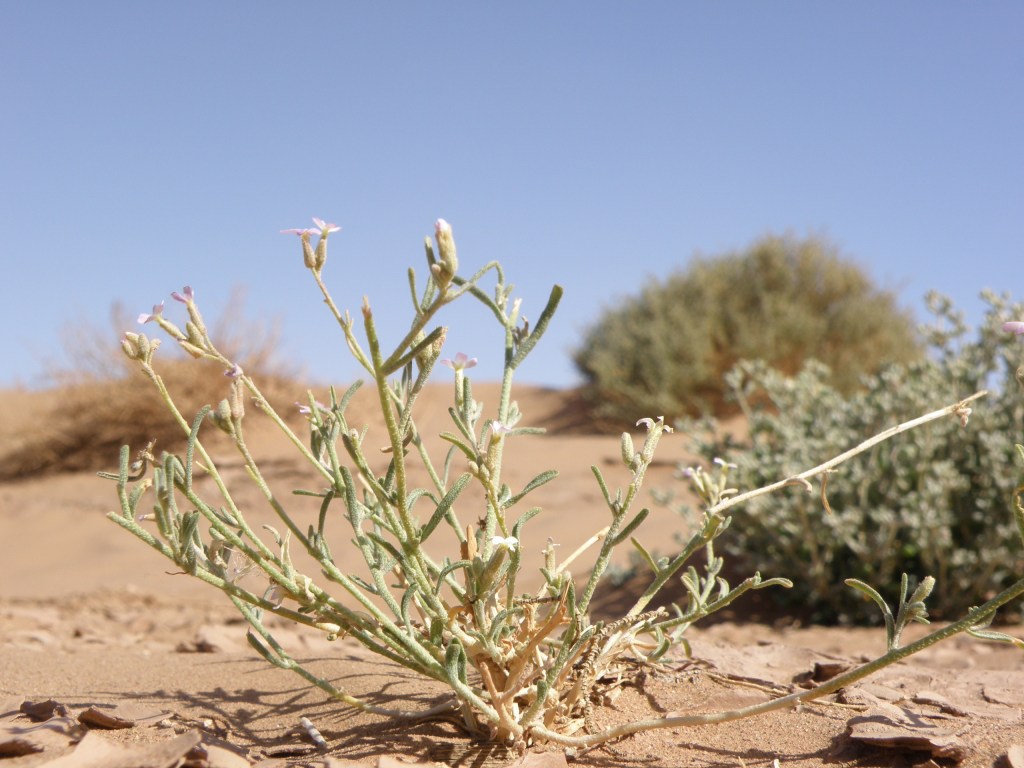 Après un magnifique lever de soleil, nous repartons pour une nouvelle étape de désert. Les paysages sont peu variés mais la végétation change de temps à autre et surtout, la visibilité est désormais excellente et nous permet de voir très loin à chaque montée de dune. On peu également observer les traces d’animaux dans le sable, comme on les verrait sur la neige : coléoptères, rongeurs, fennec, chacal… En dehors du traditionnel tamaris, la végétation se compose aussi de lacalutropis (son lait peut rendre aveugle), datorale (plante hallucinogène), acacia, houria et quelques autres fleurs.