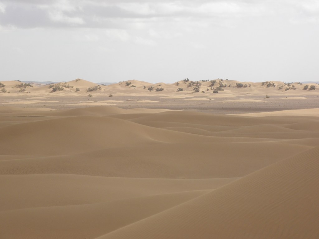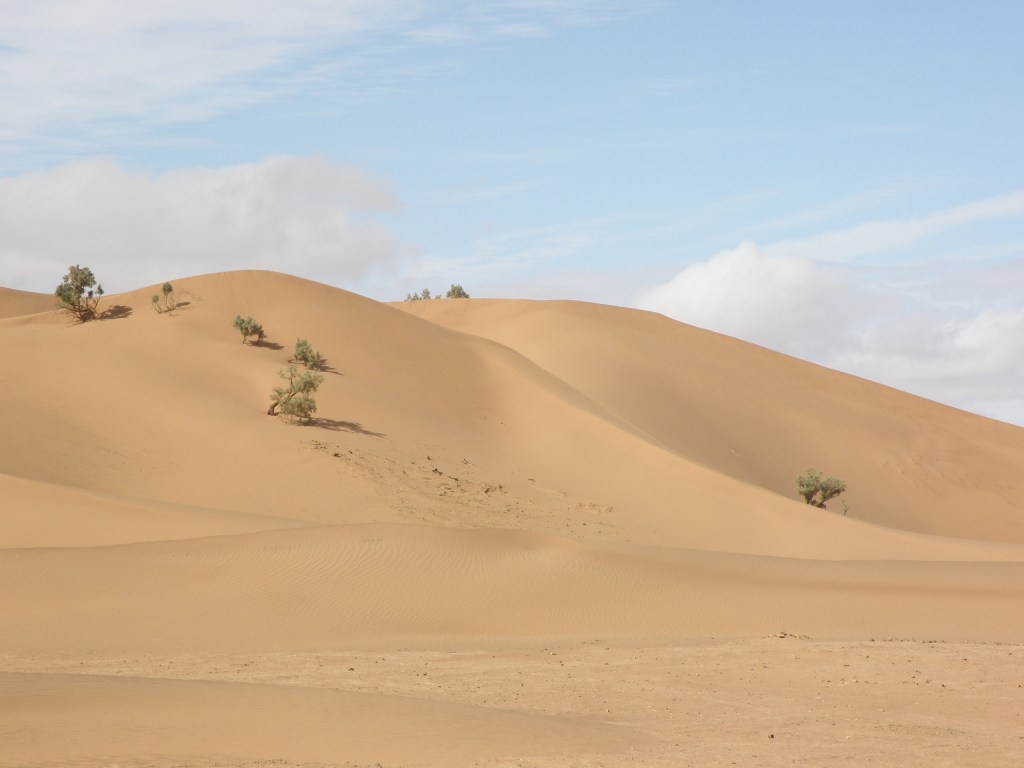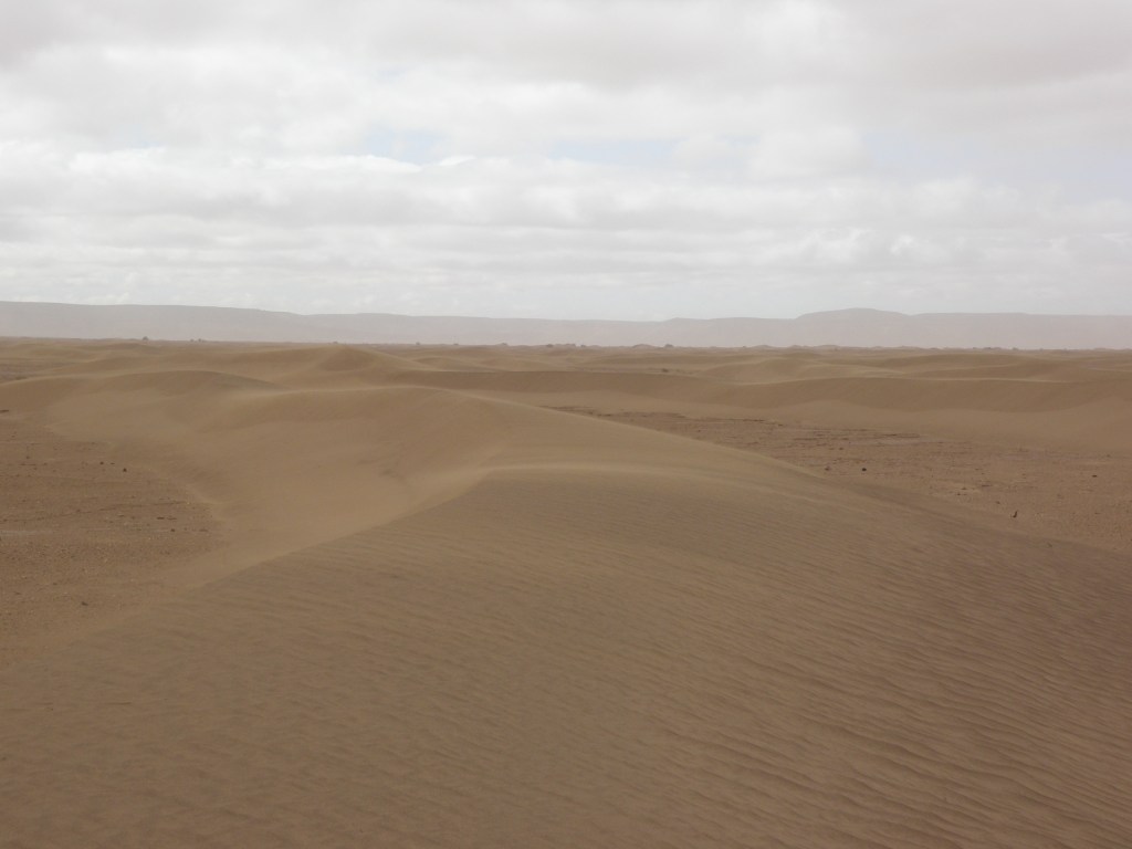 Comme tous les matins, petit-déjeuner à 7h00 pour un départ à 8h00. Le soleil est présent malgré la pluie de la nuit et quelques nuages lointains. Mais le vent reprend du poil de la bête au fur et à mesure que la matinée passe. Le rythme de marche est très correct et on enchaîne les dunes.
