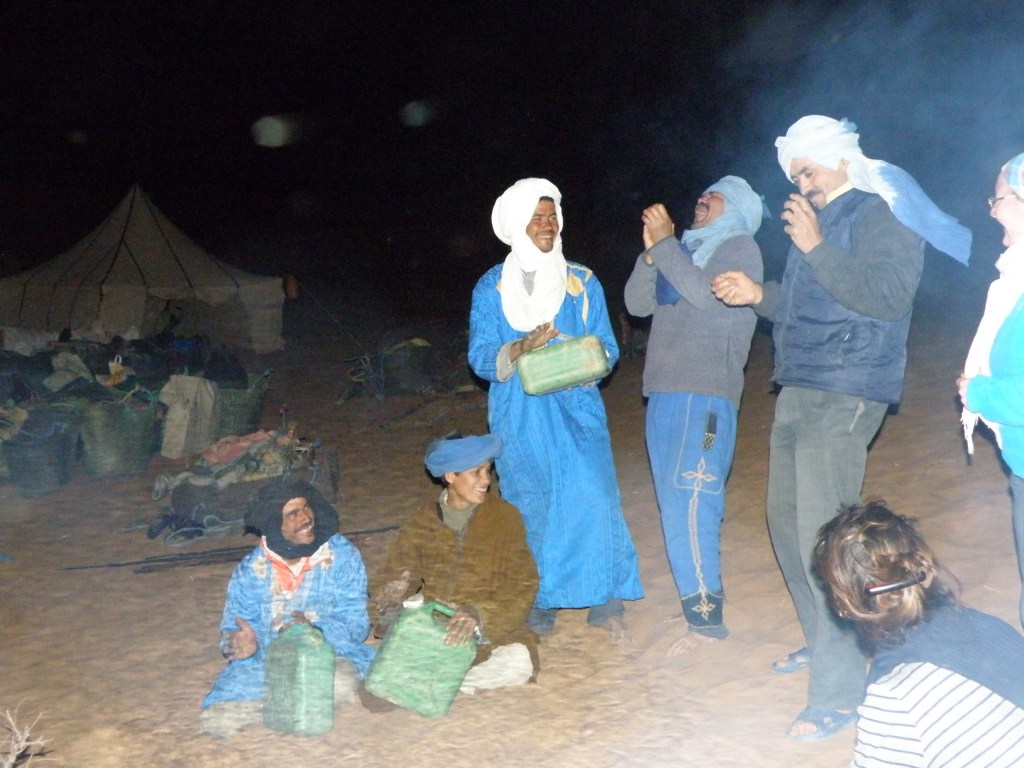 On rejoint le camp après 1h30 de marche. Nos cuisiniers nous ont préparé de beaux plats de beignets. Dans la soirée, une partie de cette équipe nous offre un petit concert de chants et danses traditionnels berbères autour du feu qui a servi à la cuisson du pain. Très sympathique !