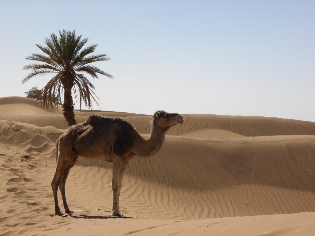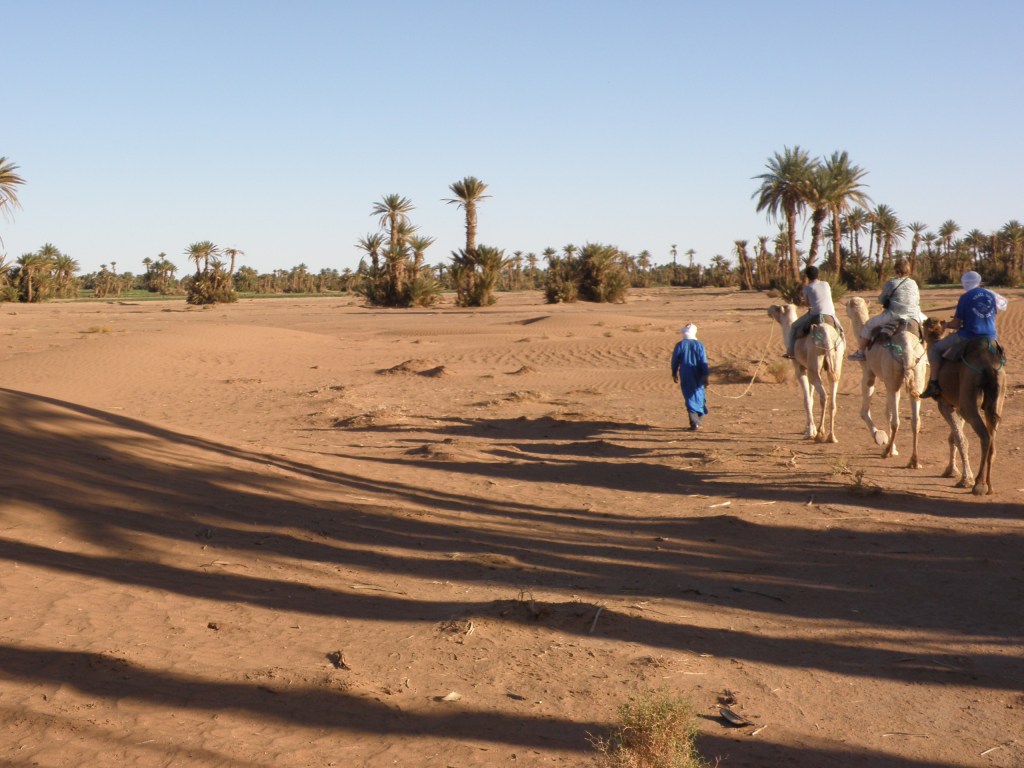 Après le repas de midi près du Drâa à sec, nous apercevons la palmeraie de M’Hamid. Au camp et après le thé, nous rejoignons les dromadaires pour un baptême !