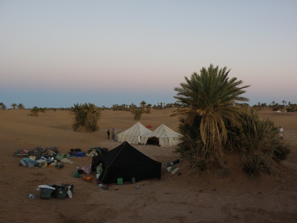 Encore 80 km, et une crevaison, et nous nous arrêtons près des chameliers qui nous attendent dans une oasis. Il nous faut un quart d’heure de marche pour rejoindre le campement.