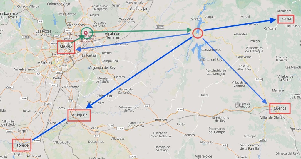 Mal aiguillés, à la sortie de l’avion, on récupère nos bagages 1 heure plus tard ; reste à trouver le loueur de voitures. Après renseignement, Auto Europe, sous loue les voitures chez des loueurs plus connus. Ici, c’est Europcar. Nous prenons donc possession de notre VW Polo. Après quelques hésitations, nous prenons la route de Guadalajara où l’on fait quelques courses, puis de Sacedon, au bord du lac artificiel de Embalse de Entrepeñas.