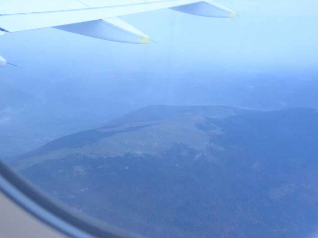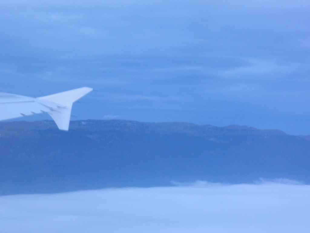 Lever à 3 heures du matin. Il nous faut 1h45 pour rejoindre l’aéroport Cointrin de Genève. On décolle à l’heure. Une fois sortis des nuages bas, on aperçoit au lever du jour, les sommets du Jura sud (Reculet, Crêt de la Neige, Grand crêt d’Eau…). Puis on traverse de nouvelles couches de nuages, en étant parfois bien secoués par les turbulences. On ne verra plus le sol jusqu’à l’atterrissage à Madrid, qui a lieu sous une petite pluie.