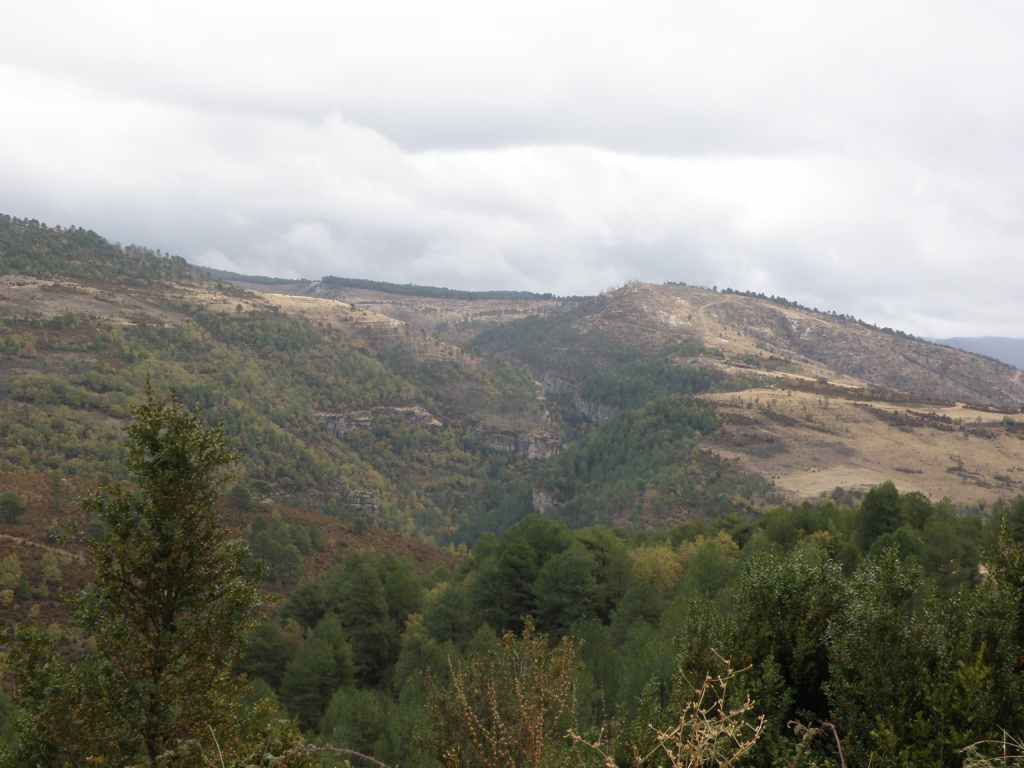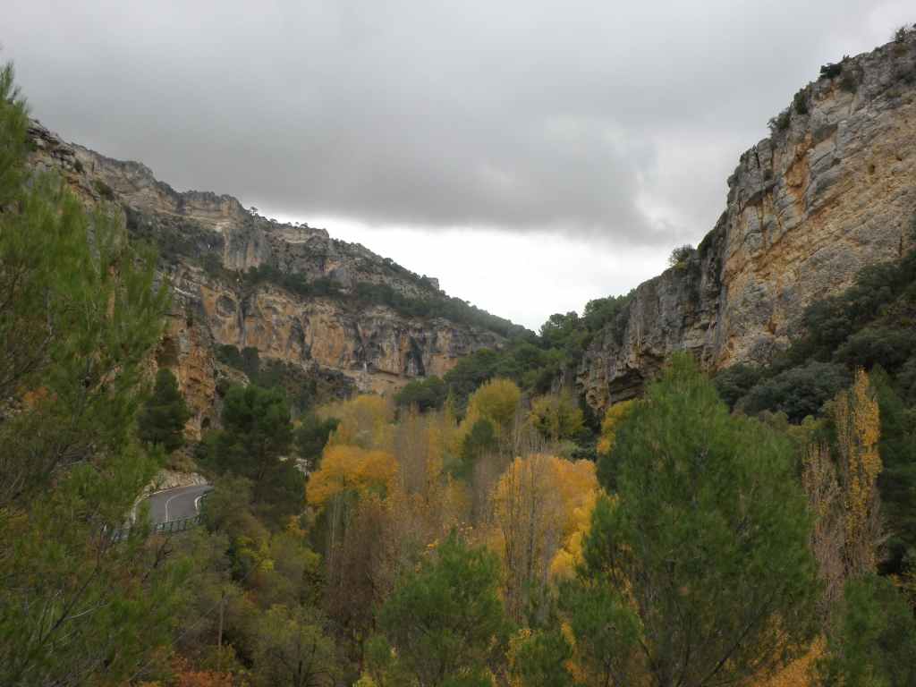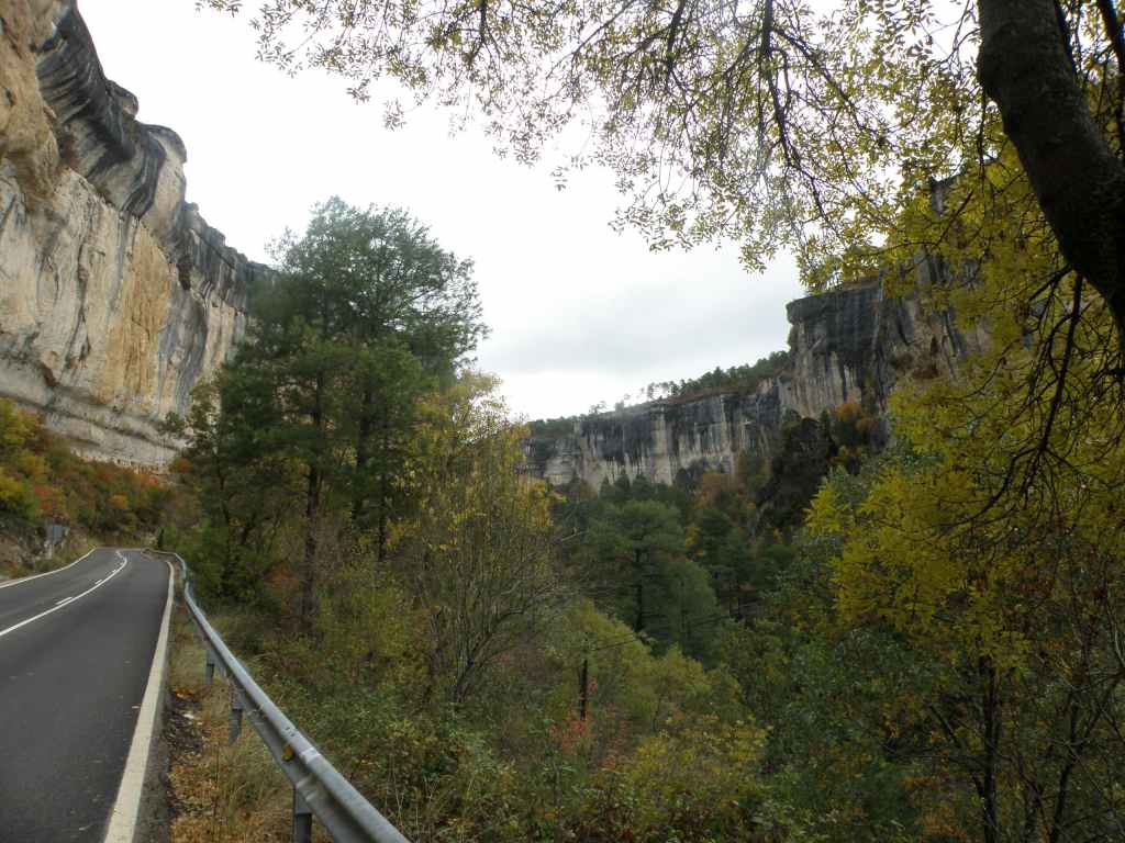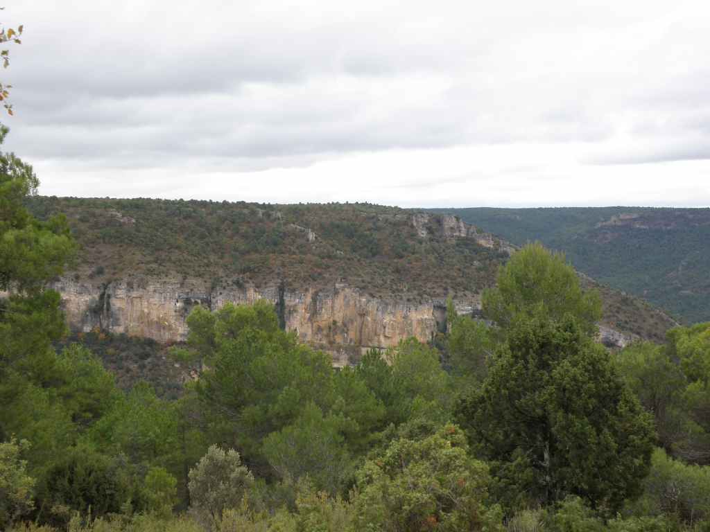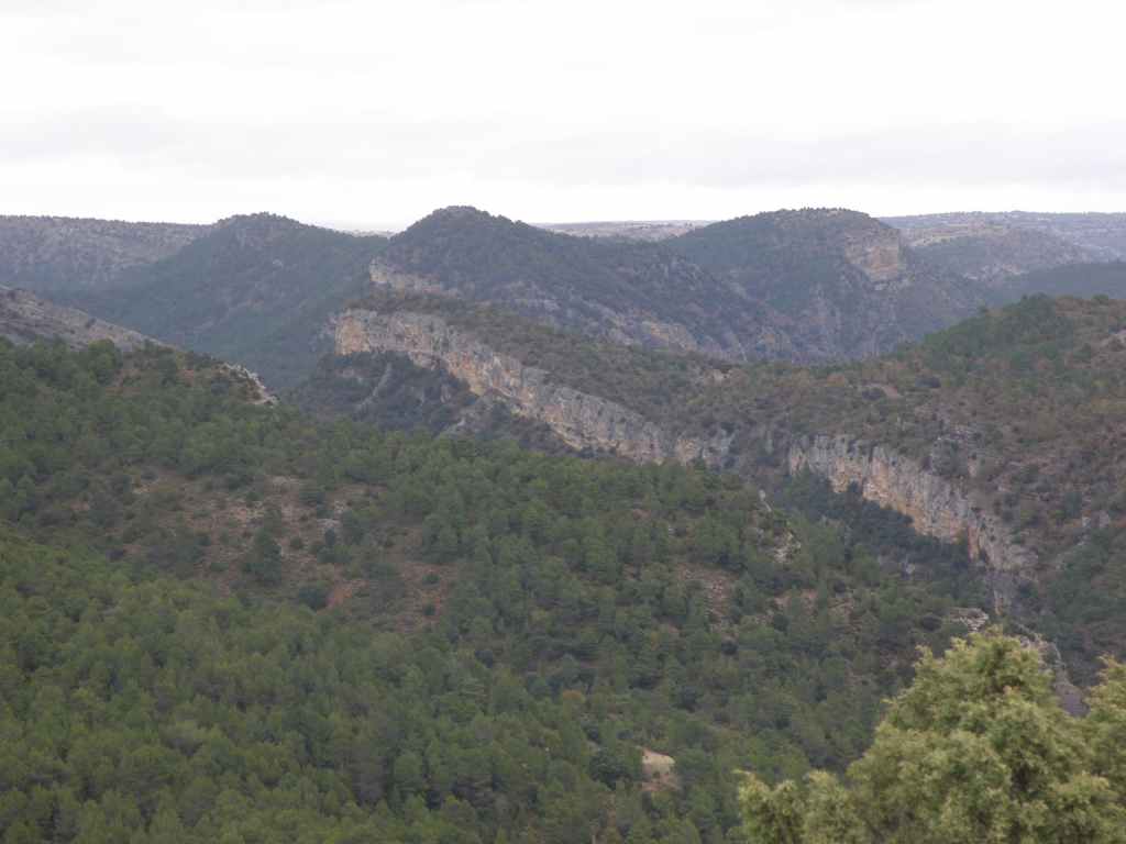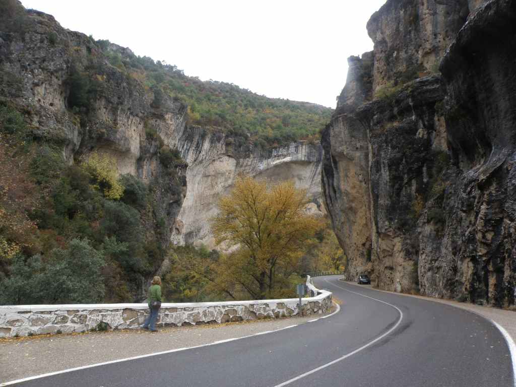 La pluie s’est calmée mais le ciel reste chargé toute la matinée. Nous avons prévu une excursion en voiture dans les montagnes à l’est de Sacedon : la Serrania de Cuenca. Le sommet culmine à 1839 m, mais nous n’irons pas jusque-là. Au pied de ce sommet nait le Tage (Tajo), un des plus gros fleuves d’Espagne. Nous faisons une petite halte dans le bourg de Priego puis empruntons les gorges d’Hoz de Beteta.