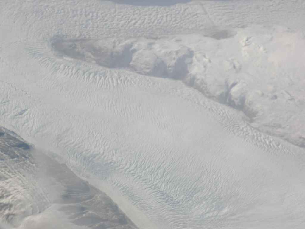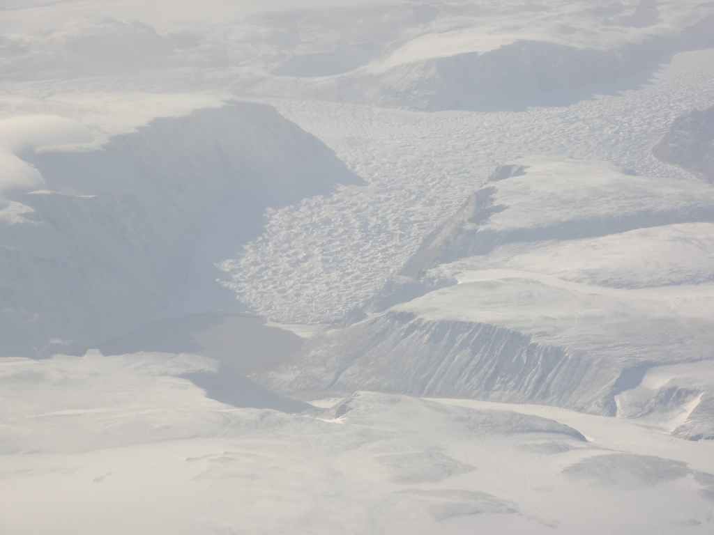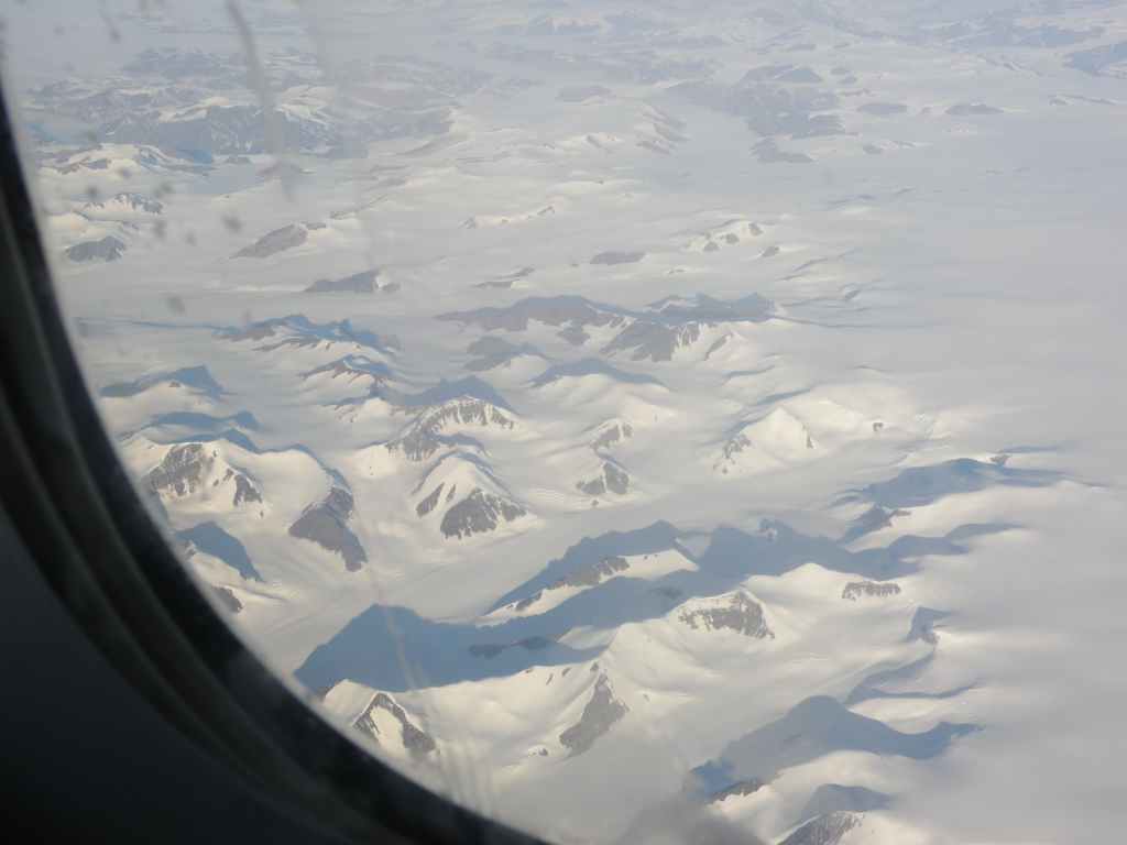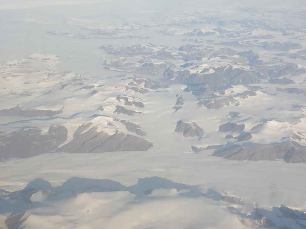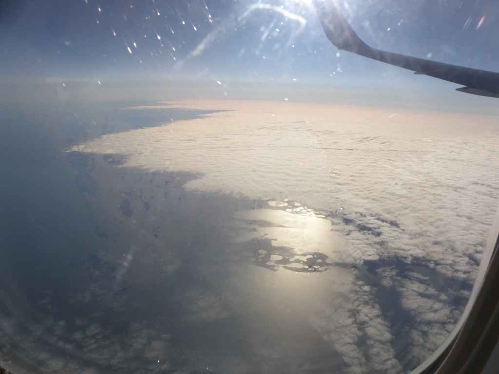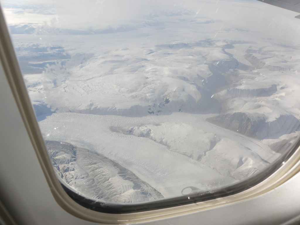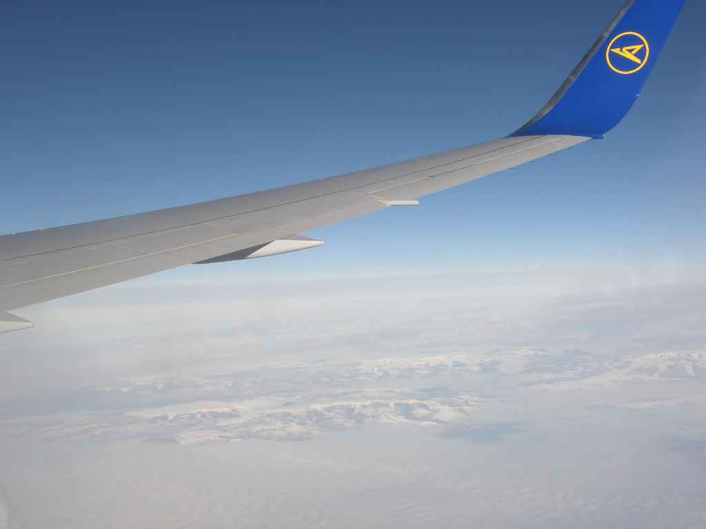 Départ à 4h00 pour rejoindre en voiture l’aéroport de Francfort en Allemagne. Nous arrivons vers 9h00 au parking. Navette jusqu’au terminal et décollage à 11h20. Nous volons plein nord sur l’ouest de la Norvège puis bifurquons vers l’ouest.