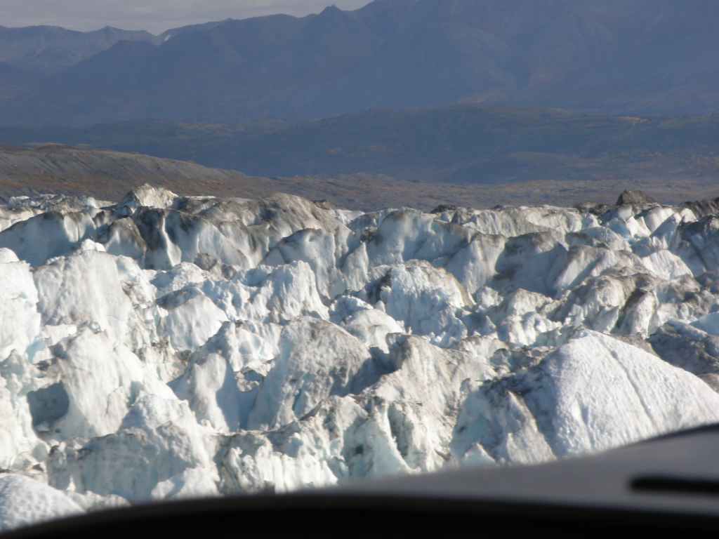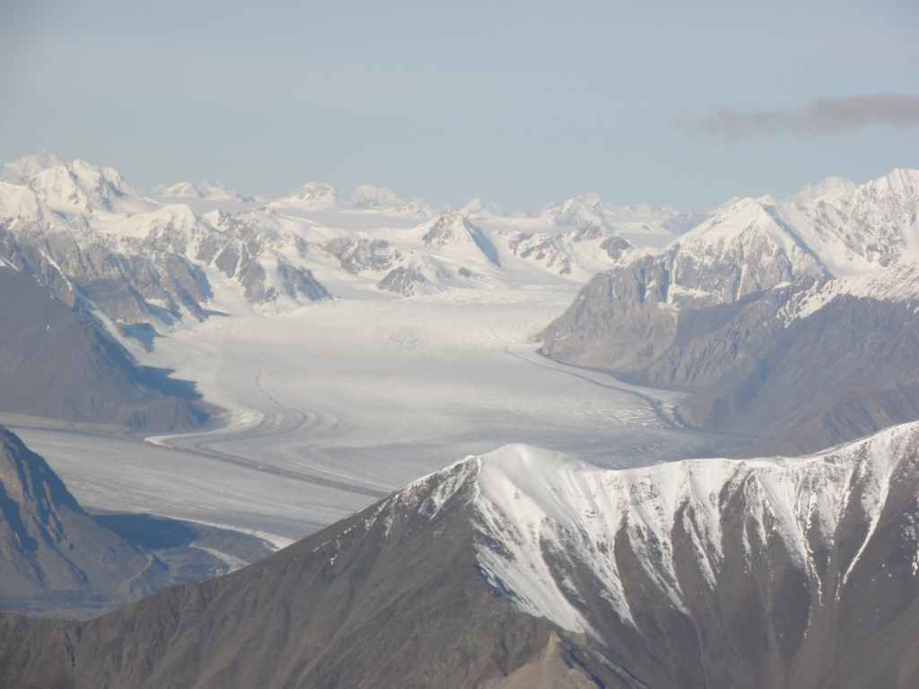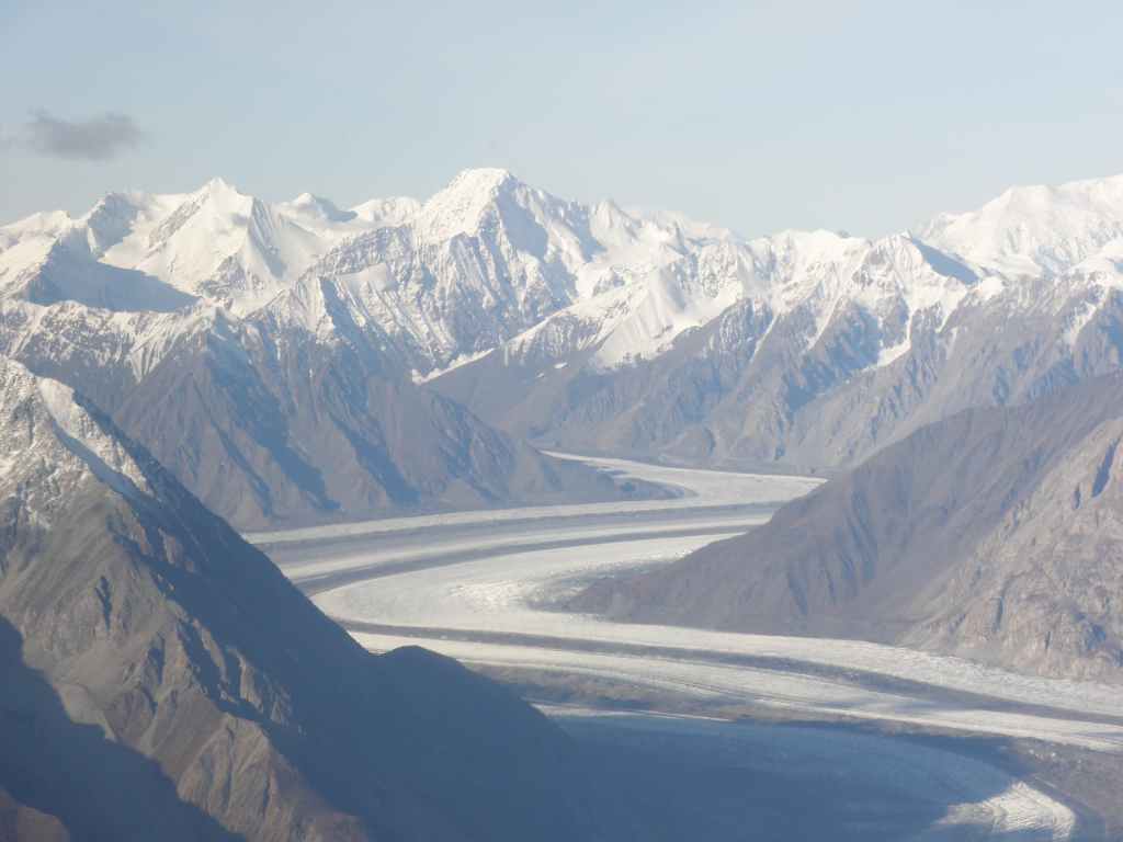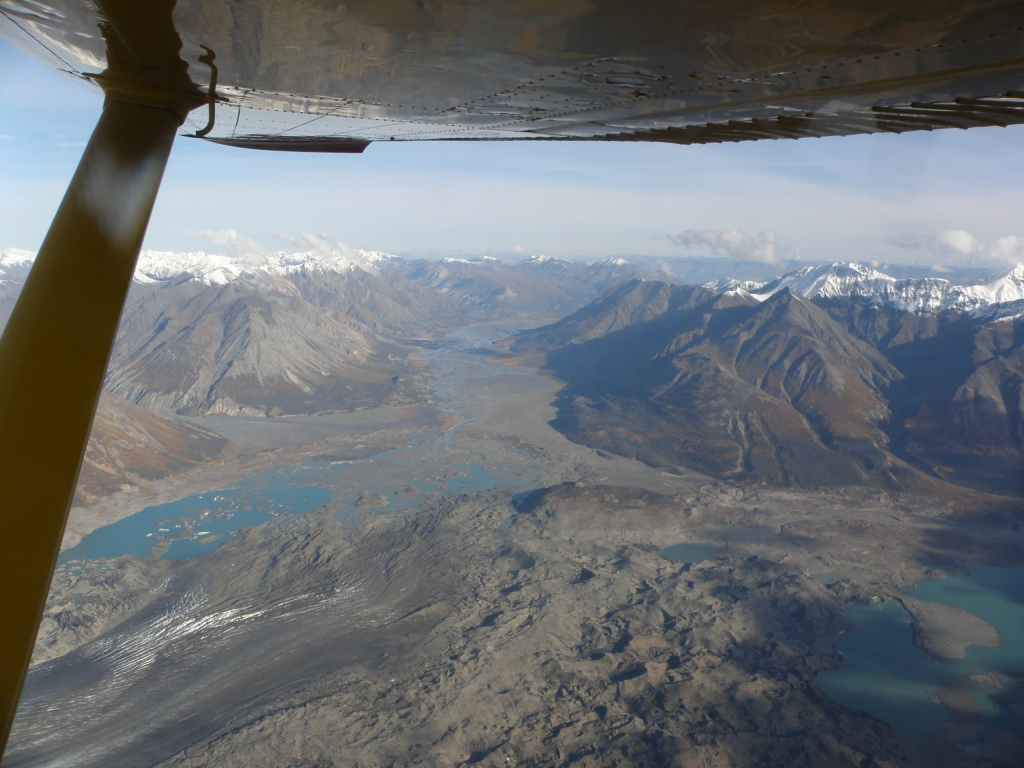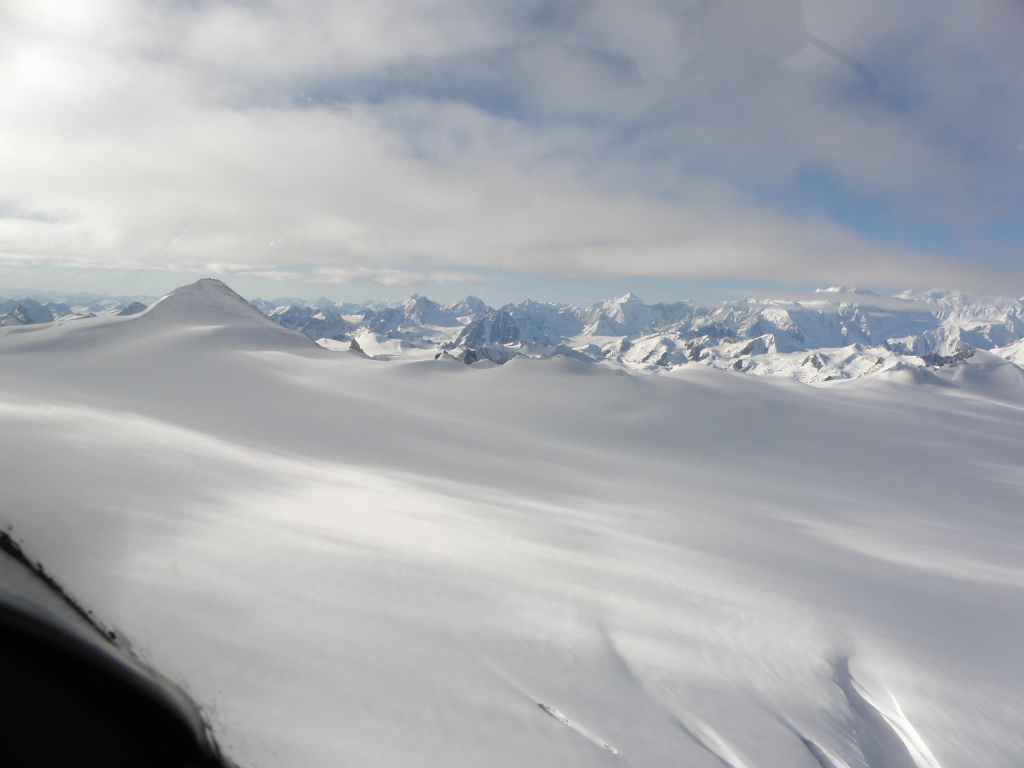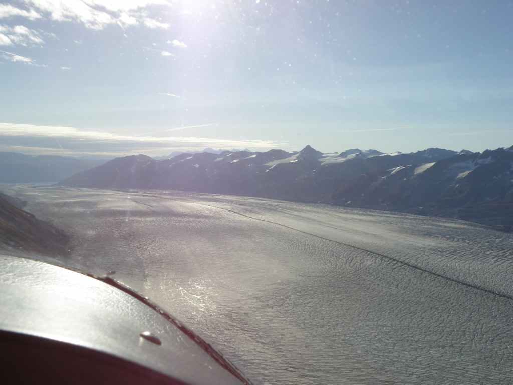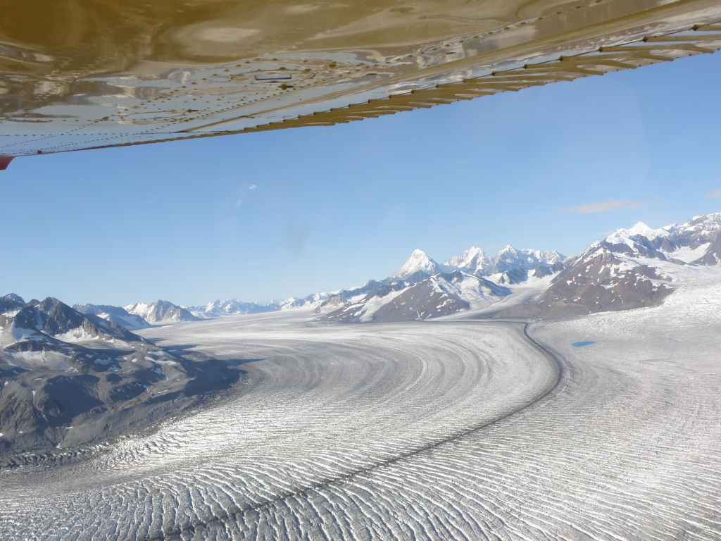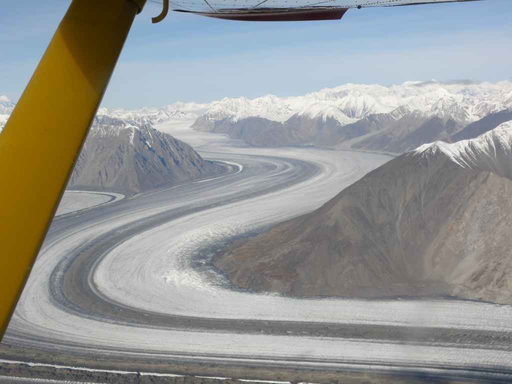 Nous nous rendons à l’aérodrome sous un ciel couvert malgré quelques éclaircies au loin. Nous ne sommes pas sûrs de prendre l’air mais le pilote est confiant et nous invite à monter dans son petit coucou. C’est notre premier vol dans ce type d’avion et je stresse un peu… Décollage et, et… peu de mots existent pour décrire ce que nous voyons. C’est grandiose, fantastique, exceptionnel !!! Nous survolons la plus grande surface glaciaire au monde, si on excepte les 2 pôles, sous un soleil éclatant. On aperçoit au loin le mont Logan et ses 5985 m. On fait du rase-motte au-dessus des crevasses des glaciers… c’est quelque chose ! 1 heure c’est trop court…
