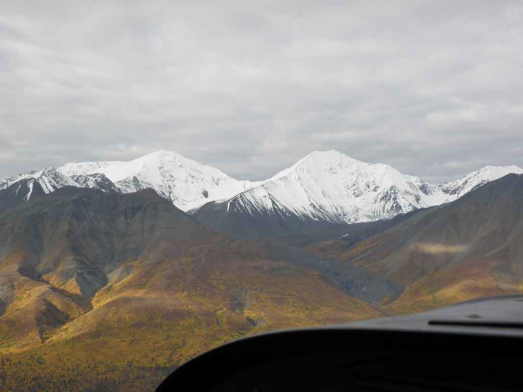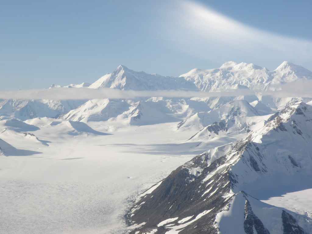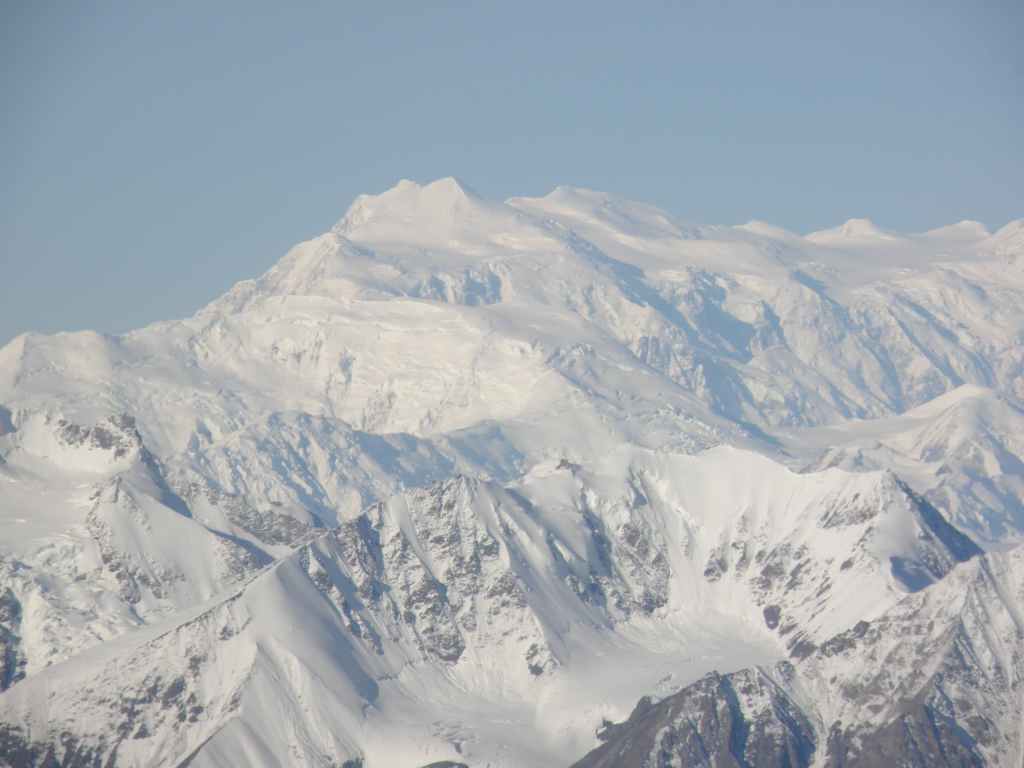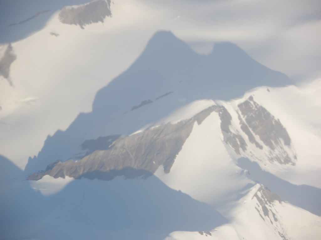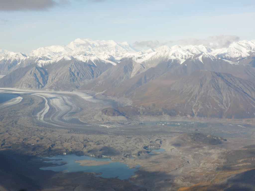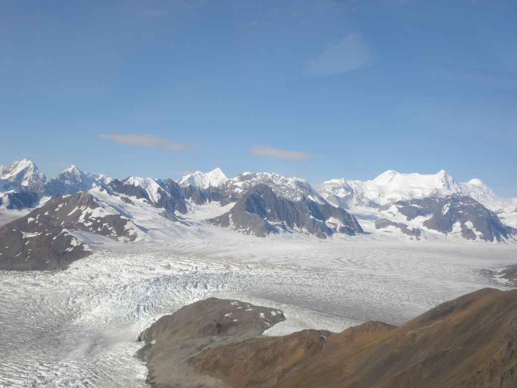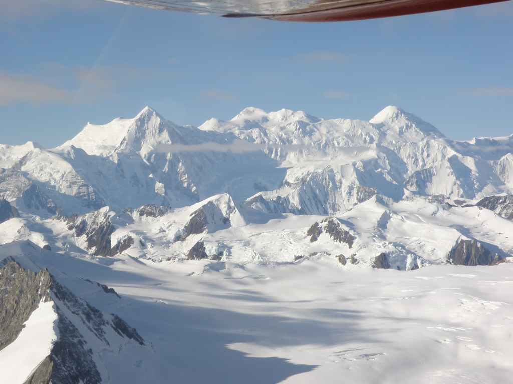 Nous nous rendons à l’aérodrome sous un ciel couvert malgré quelques éclaircies au loin. Nous ne sommes pas sûrs de prendre l’air mais le pilote est confiant et nous invite à monter dans son petit coucou. C’est notre premier vol dans ce type d’avion et je stresse un peu… Décollage et, et… peu de mots existent pour décrire ce que nous voyons. C’est grandiose, fantastique, exceptionnel !!! Nous survolons la plus grande surface glaciaire au monde, si on excepte les 2 pôles, sous un soleil éclatant. On aperçoit au loin le mont Logan et ses 5985 m. On fait du rase-motte au-dessus des crevasses des glaciers… c’est quelque chose ! 1 heure c’est trop court…