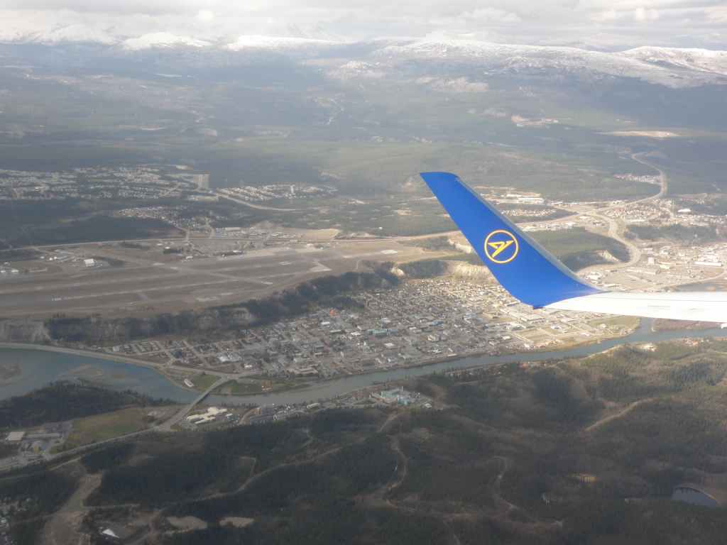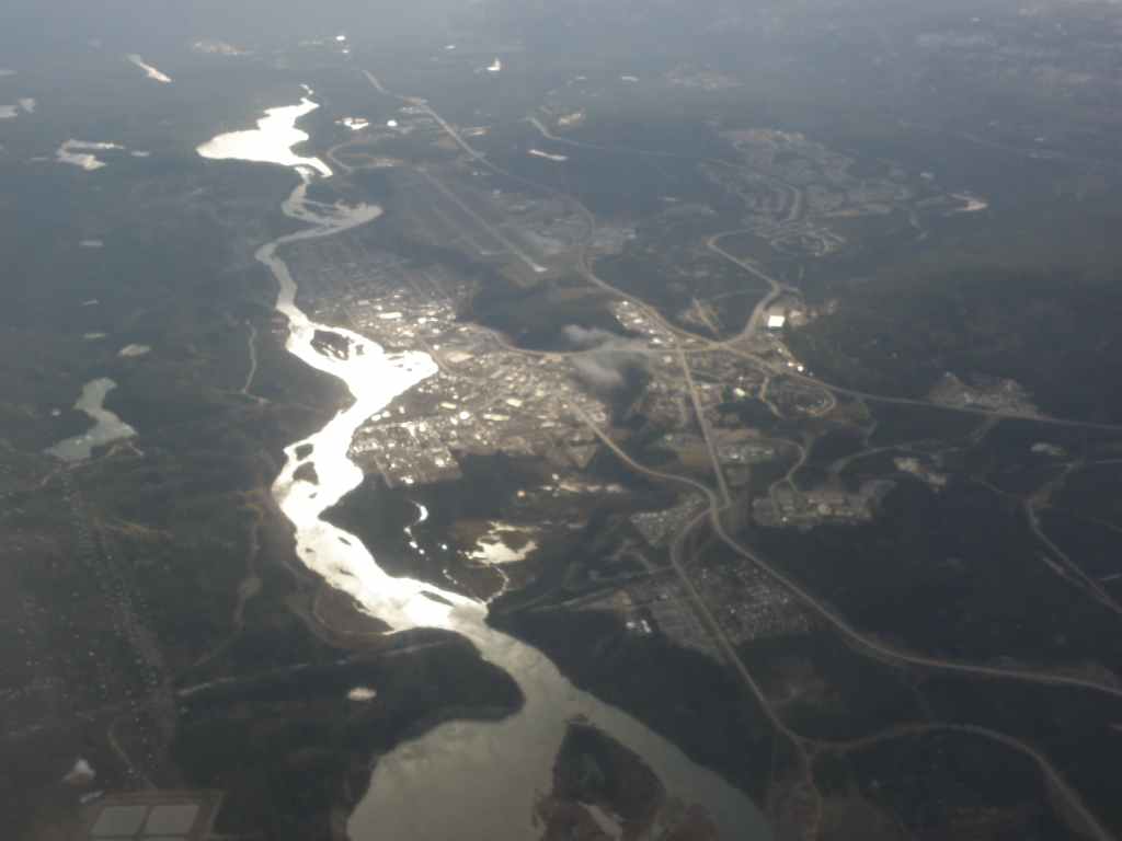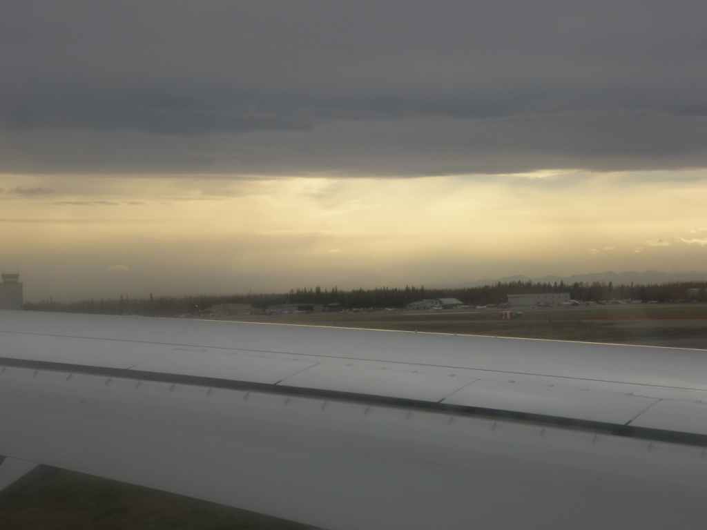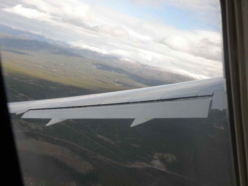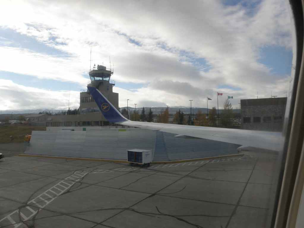 Réveil à 7 h pour boucler les valises, finir le ménage et vidanger les réservoirs. On arrive à l’agence à 9h45. Leur navette nous emmène à l’aéroport pour 10h30. Enregistrement des bagages. Passage des contrôles et puis décollage en direction de l’Alaska à 13h15 avec 20 mn de retard. On survole une zone de forêt encore en feu puis on arrive à Fairbanks à 14h30.