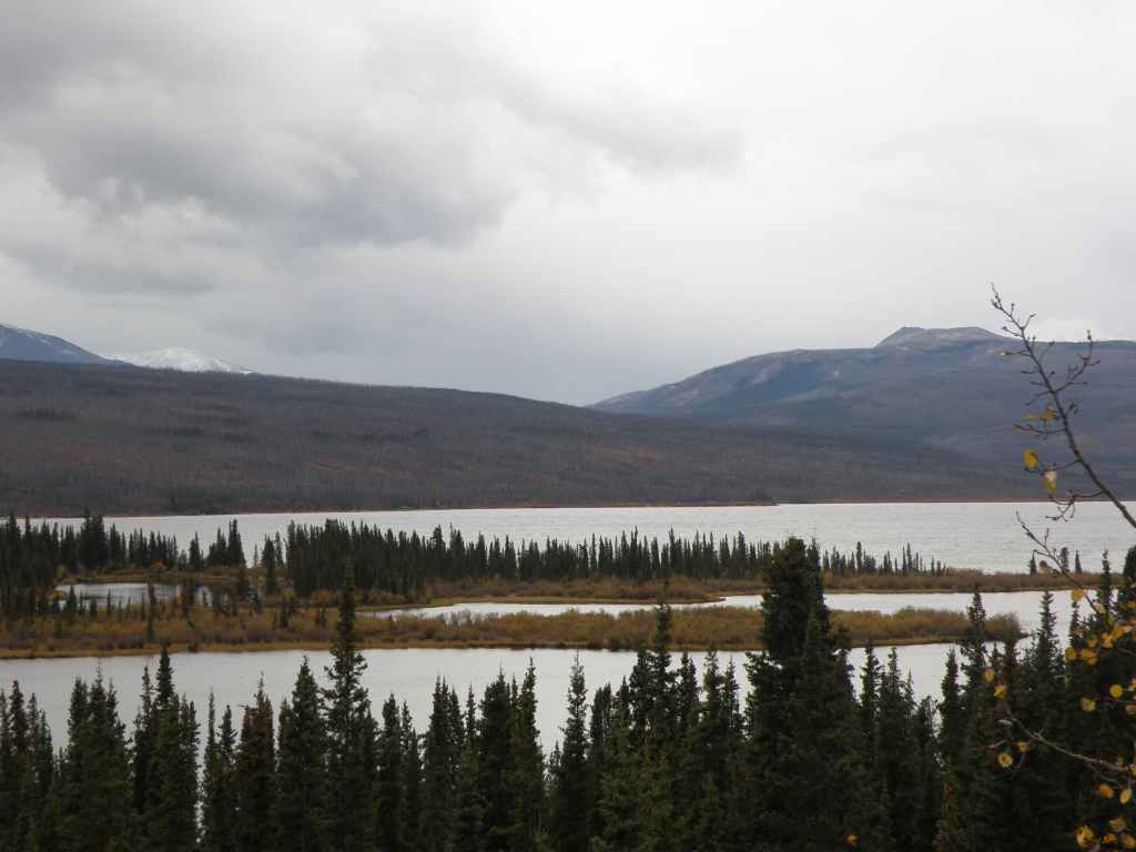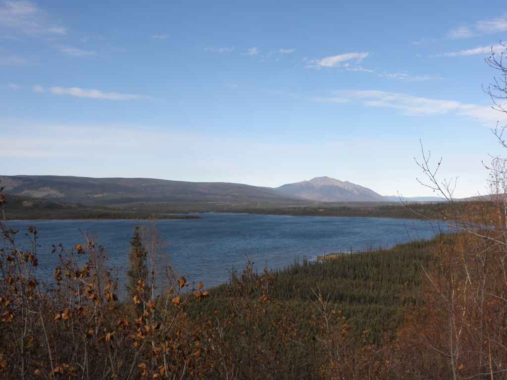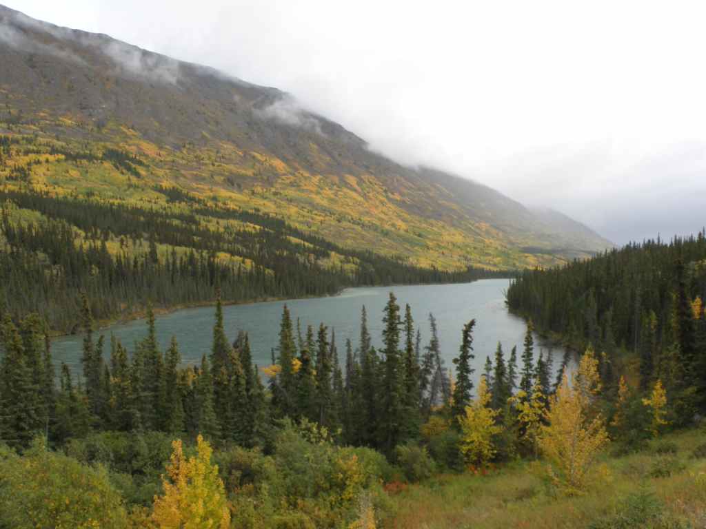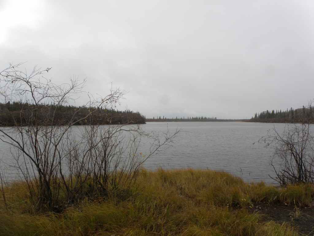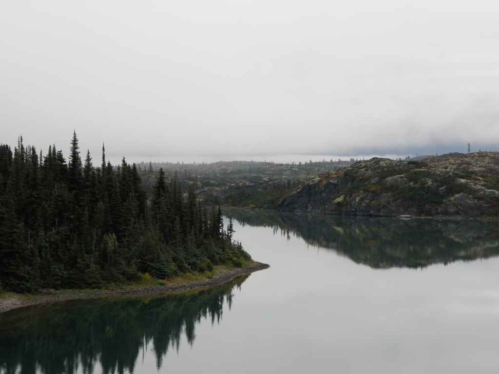 On passera par la Robert Campbell Highway théoriquement plus fréquentée mais avec un détour de 400 km ! La météo n’est pas super : brouillard et petite pluie. Mais cette route se réduit finalement sur une seule voie. Pas gênant car nous ne rencontrons qu’une demi-douzaine de voitures dans l’après-midi. Nous campons au bord du lac Simpson, en compagnie d’autres campeurs.