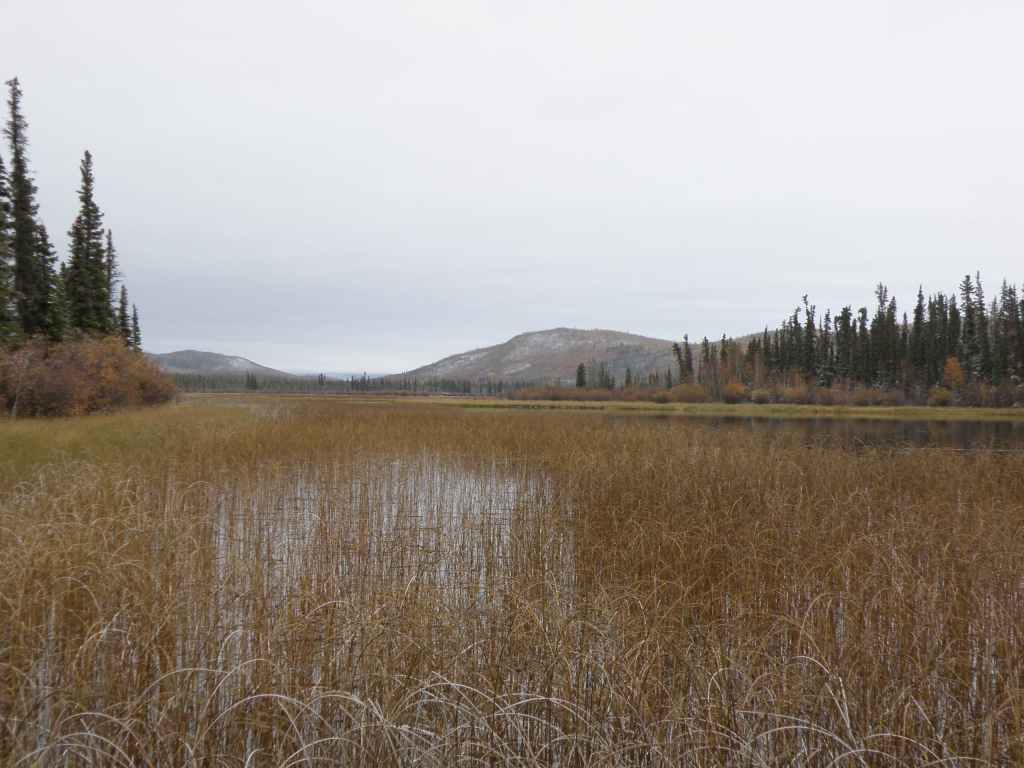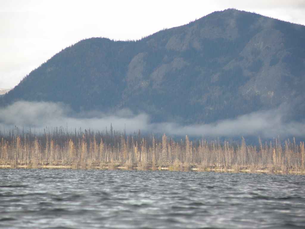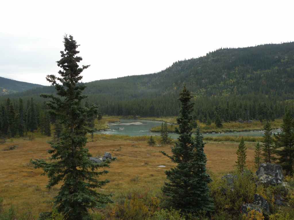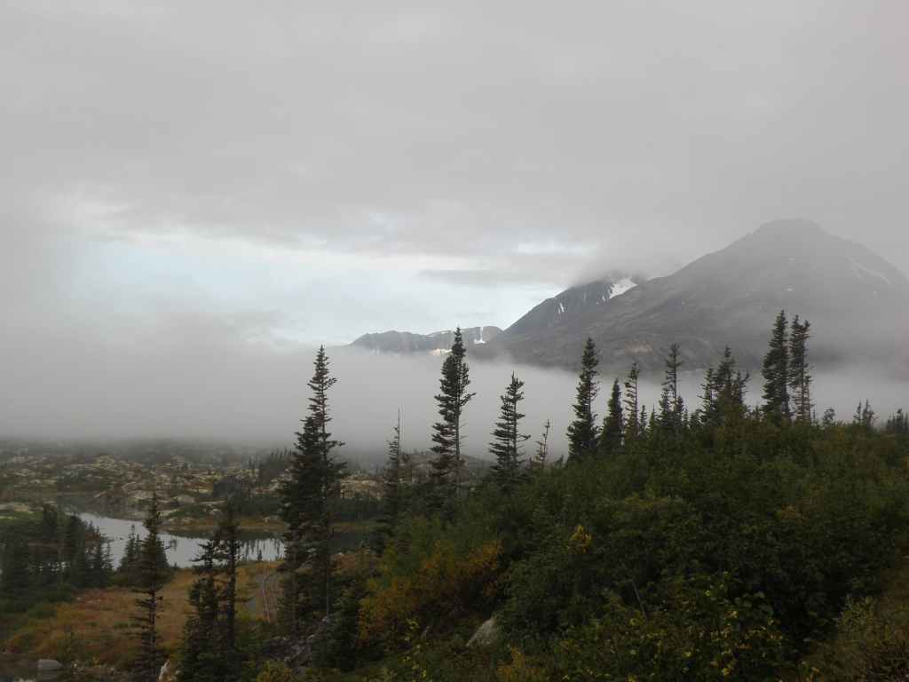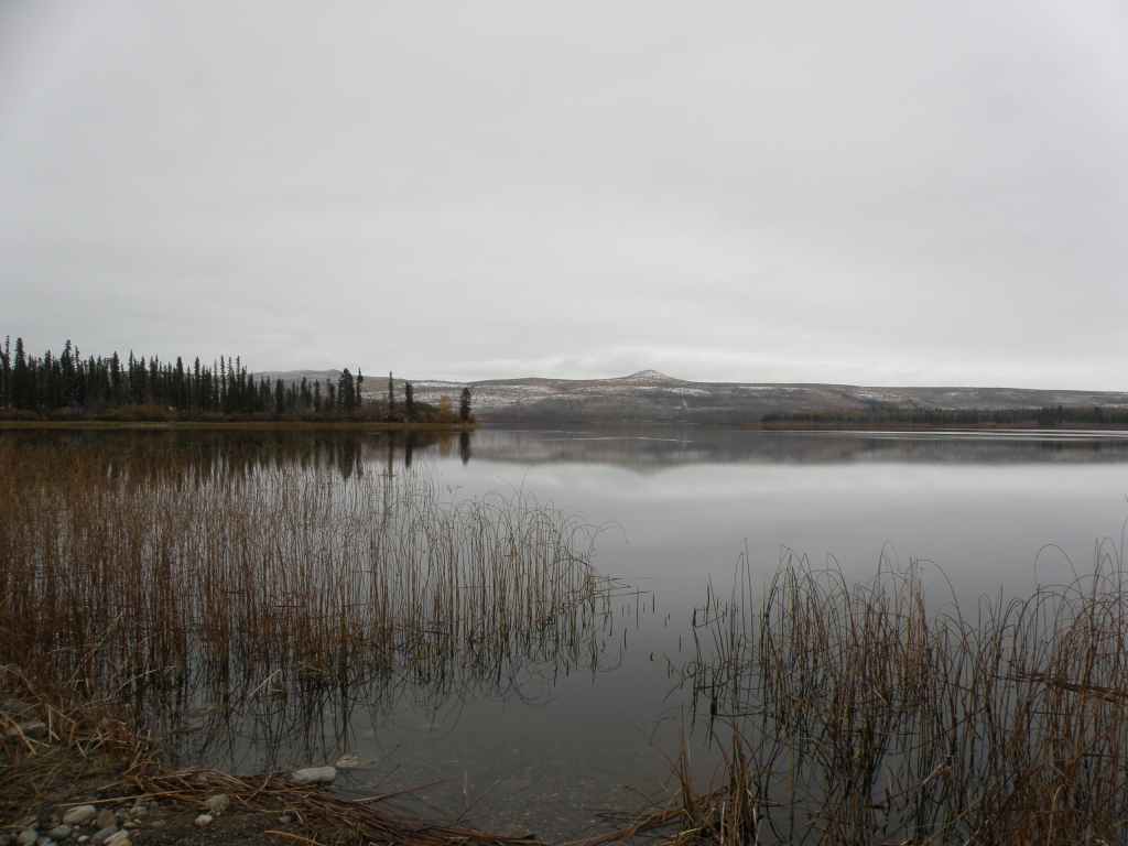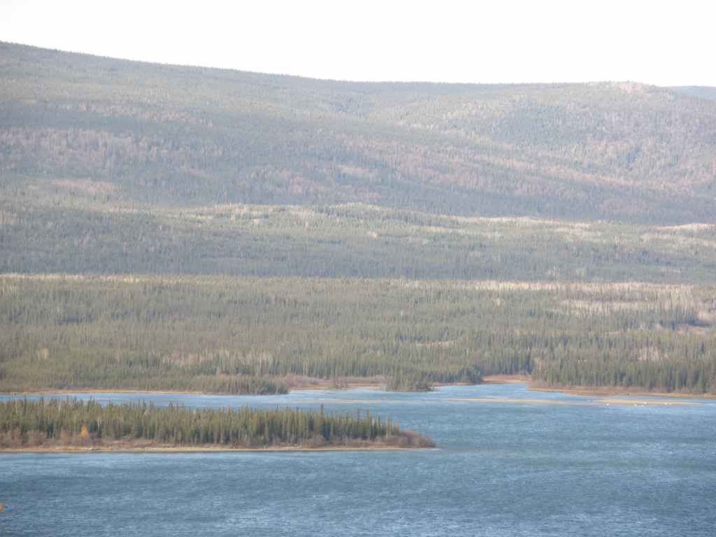 On passera par la Robert Campbell Highway théoriquement plus fréquentée mais avec un détour de 400 km ! La météo n’est pas super : brouillard et petite pluie. Mais cette route se réduit finalement sur une seule voie. Pas gênant car nous ne rencontrons qu’une demi-douzaine de voitures dans l’après-midi. Nous campons au bord du lac Simpson, en compagnie d’autres campeurs.