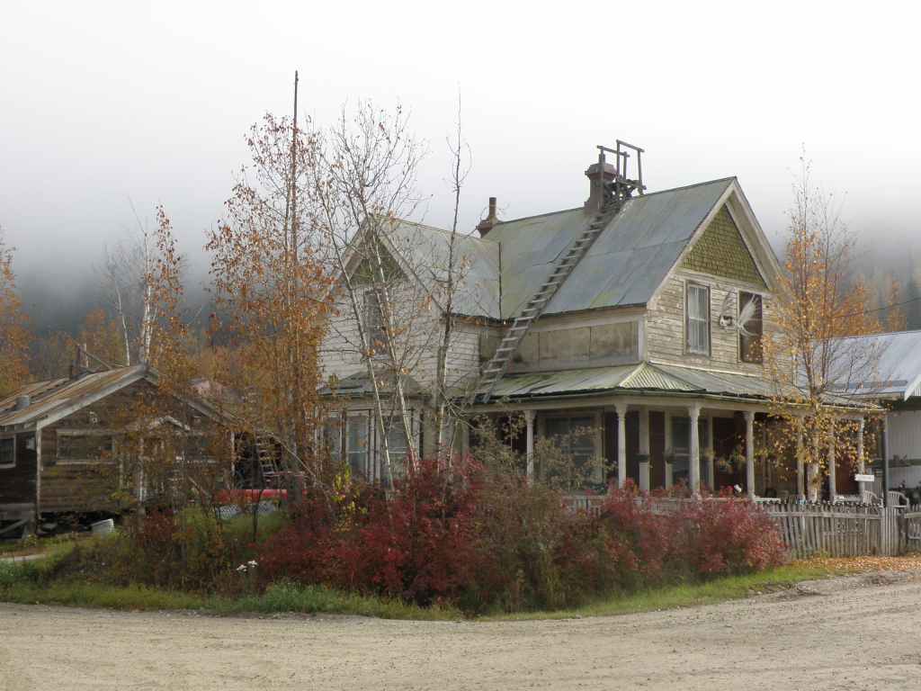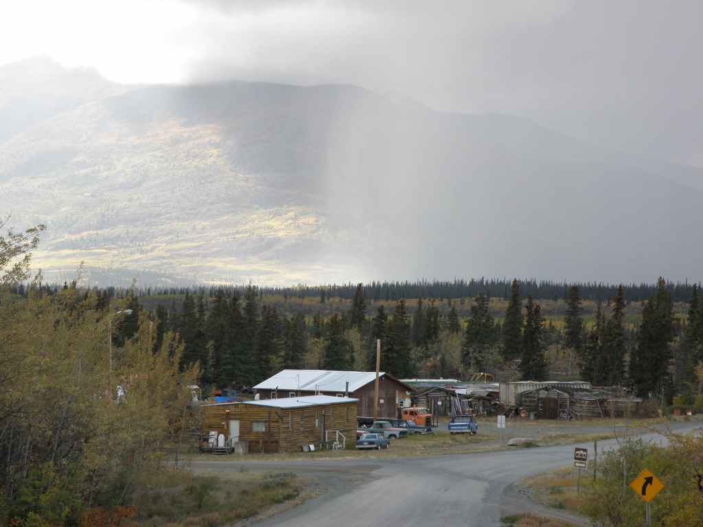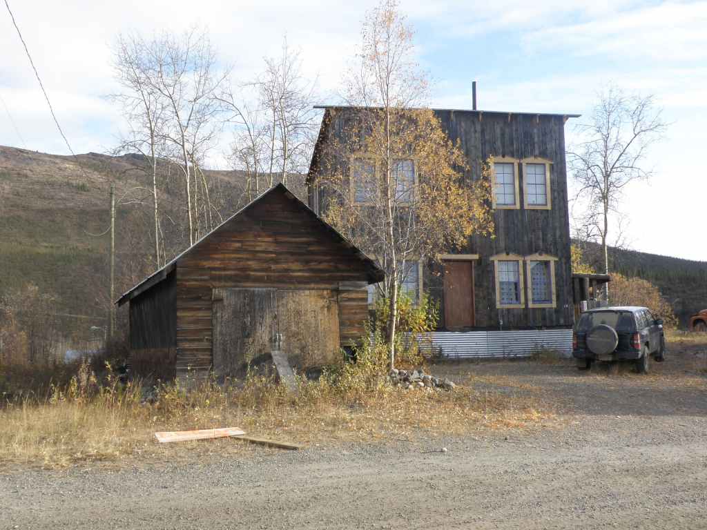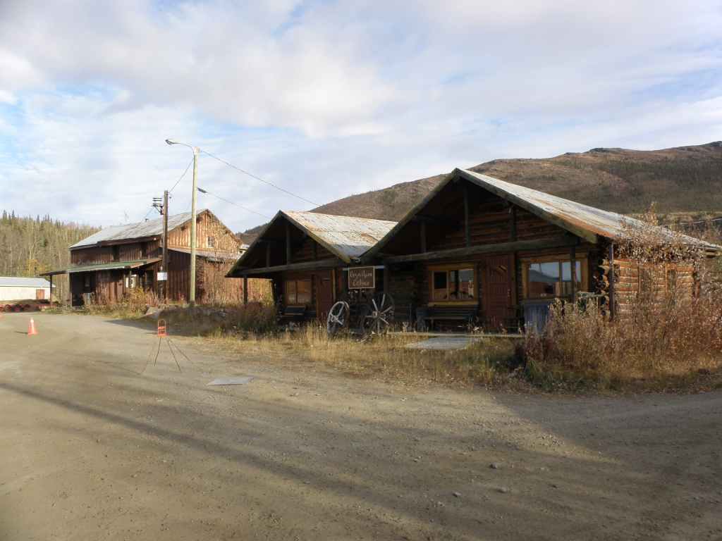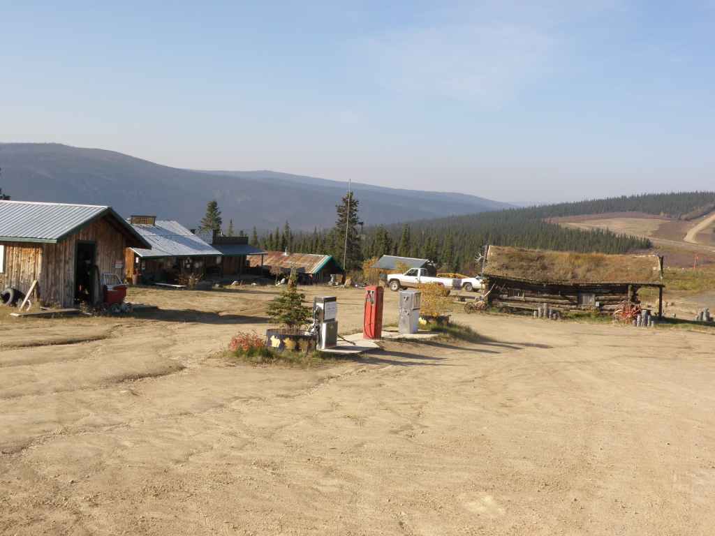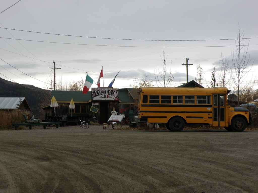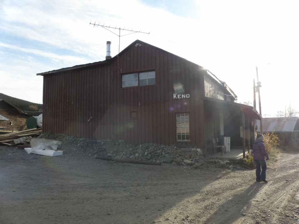 Les éclaircies sont aujourd’hui plus nombreuses mais les températures sont hivernales : – 4°c le matin et -2°C en journée. Nous partons en direction de Mayo où nous ravitaillons, lessivons, vidangeons et faisons réparer le pneu crevé chez un garagiste plutôt original… puis nous rejoignons la « ville » minière de Keno City, en fait un village avec ses vieilles maisons de bois plus ou moins abandonnées. Nous faisons une petite visite l’après-midi du village et décidons d’aller prendre un verre dans le café du coin.