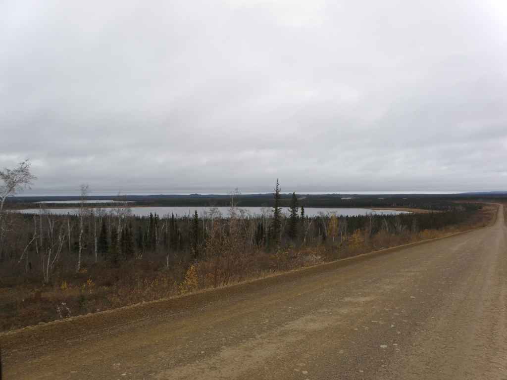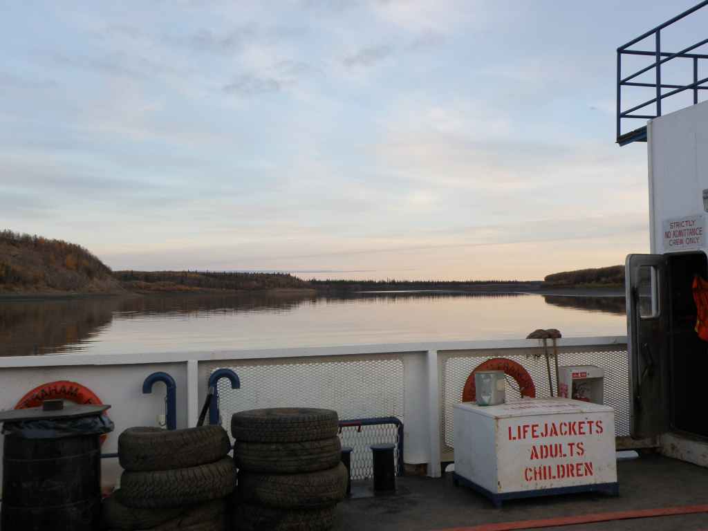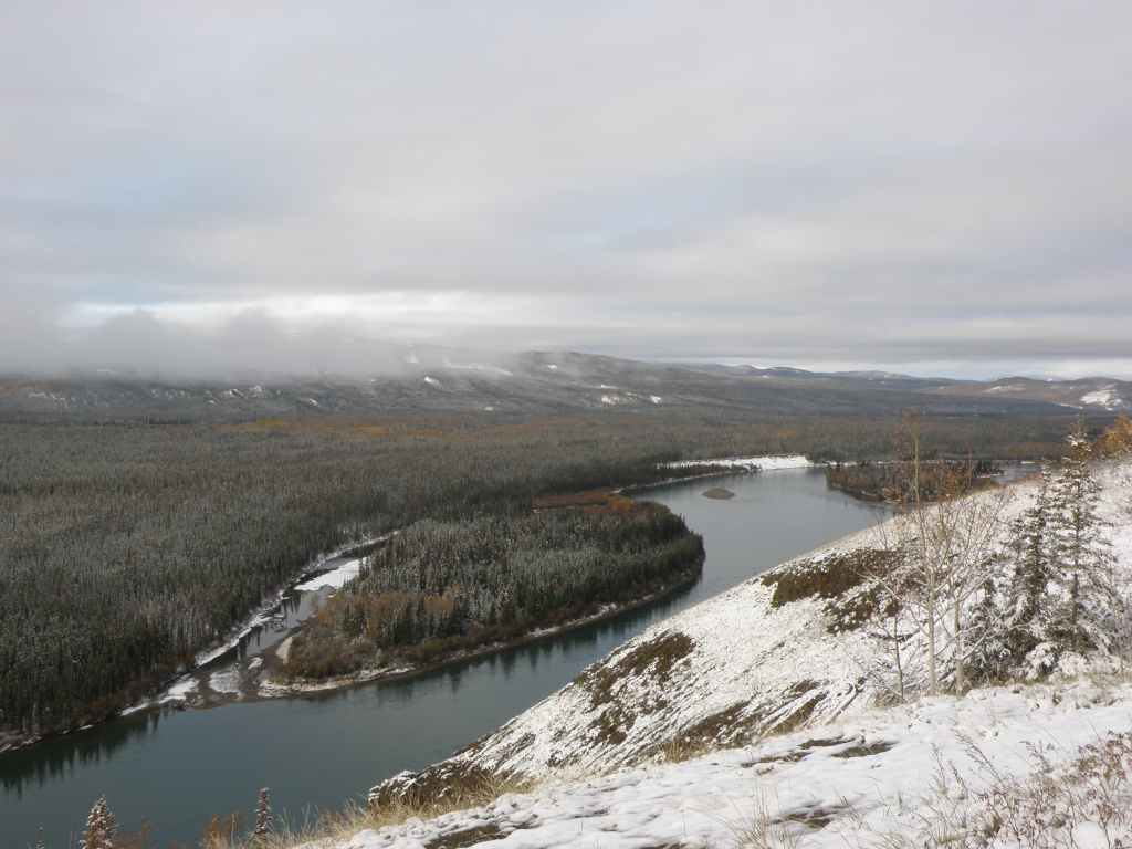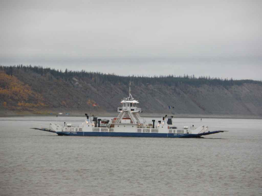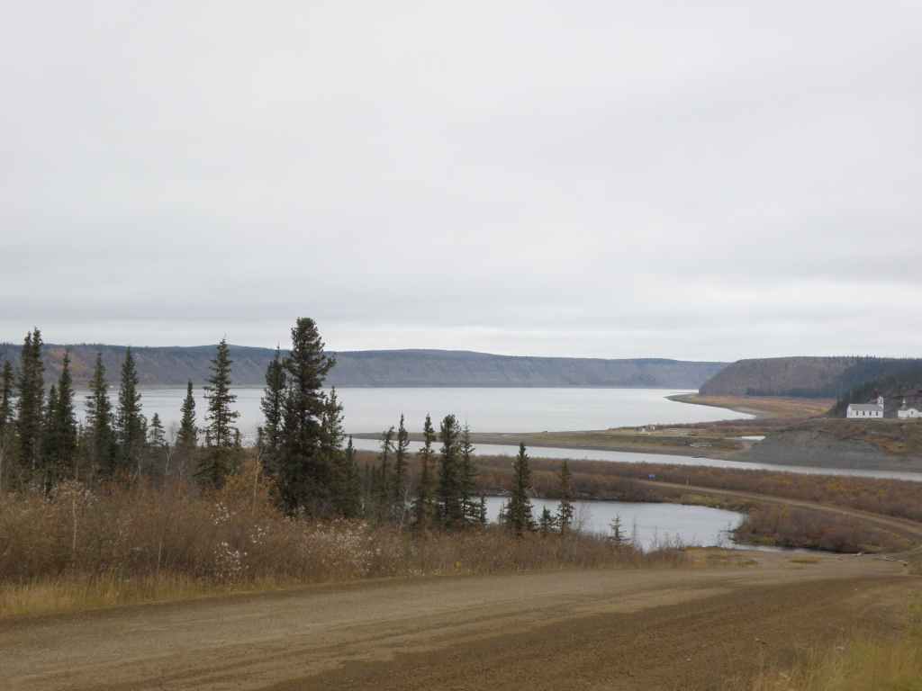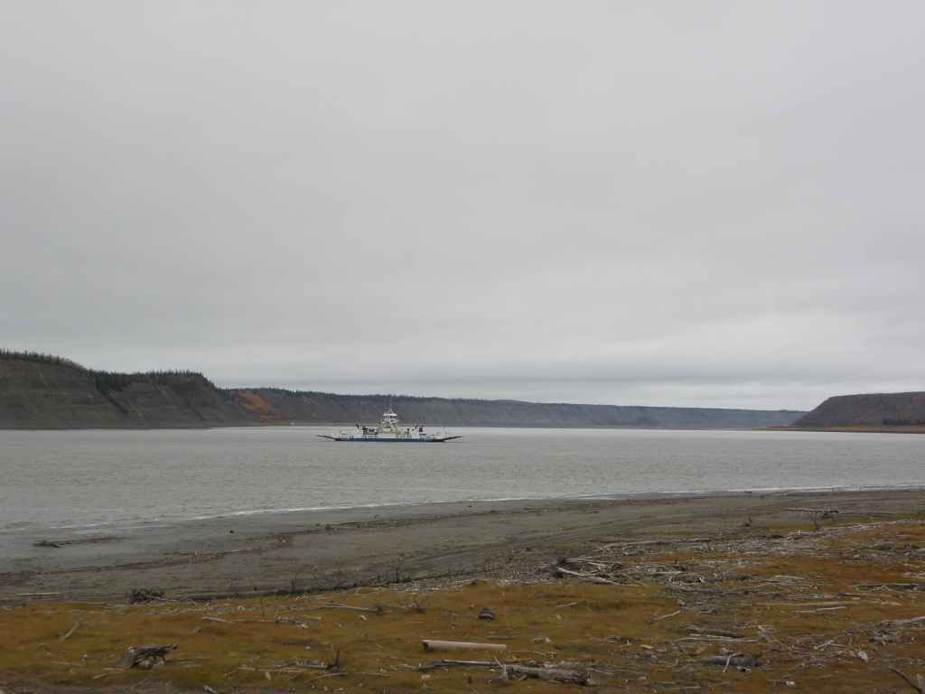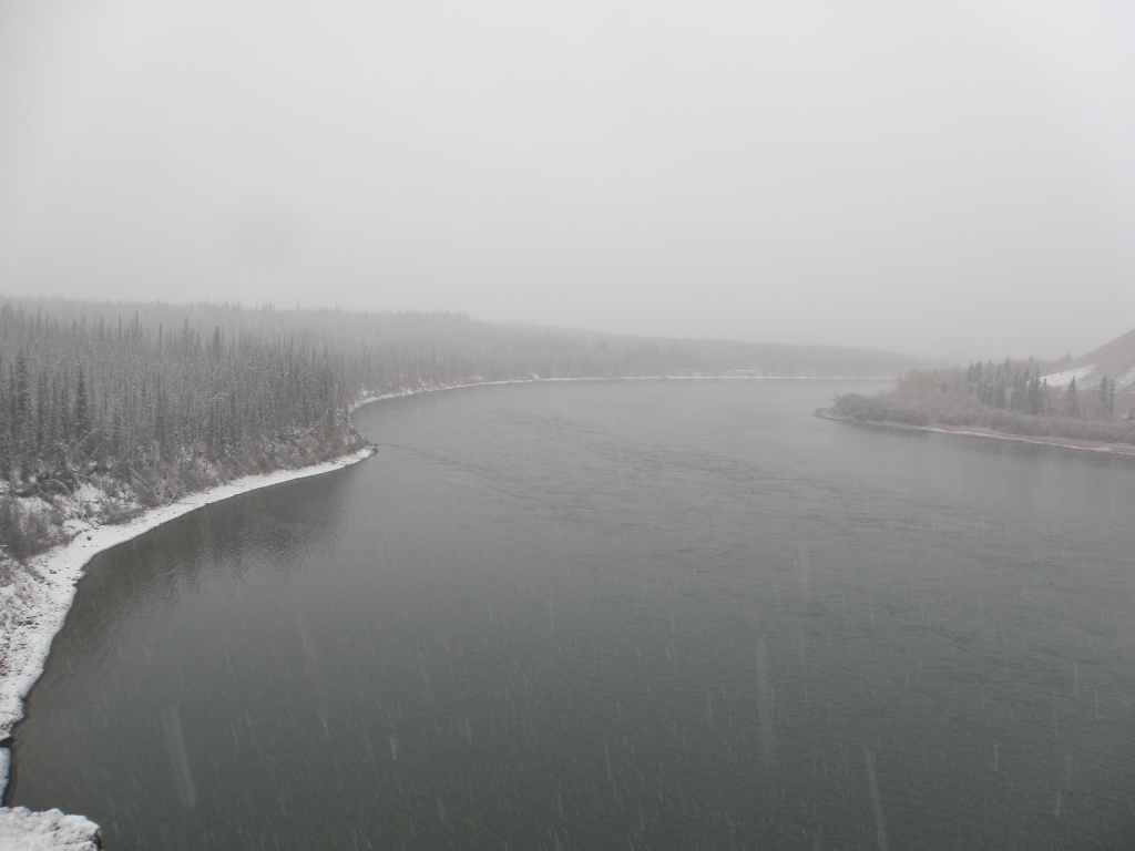 Ce matin, la température s’est radoucie (3°C) mais le ciel s’est couvert… on repart en direction de Fort Macpherson. On reprend à nouveau un traversier pour traverser la rivière Rouge Arctique et le fleuve Mackenzie. Celui-ci est à cet endroit très large. Puis la piste nous conduit tranquillement au belvédère du lac Campbell. C’est dans ce très bel endroit que nous prenons notre première averse de neige !