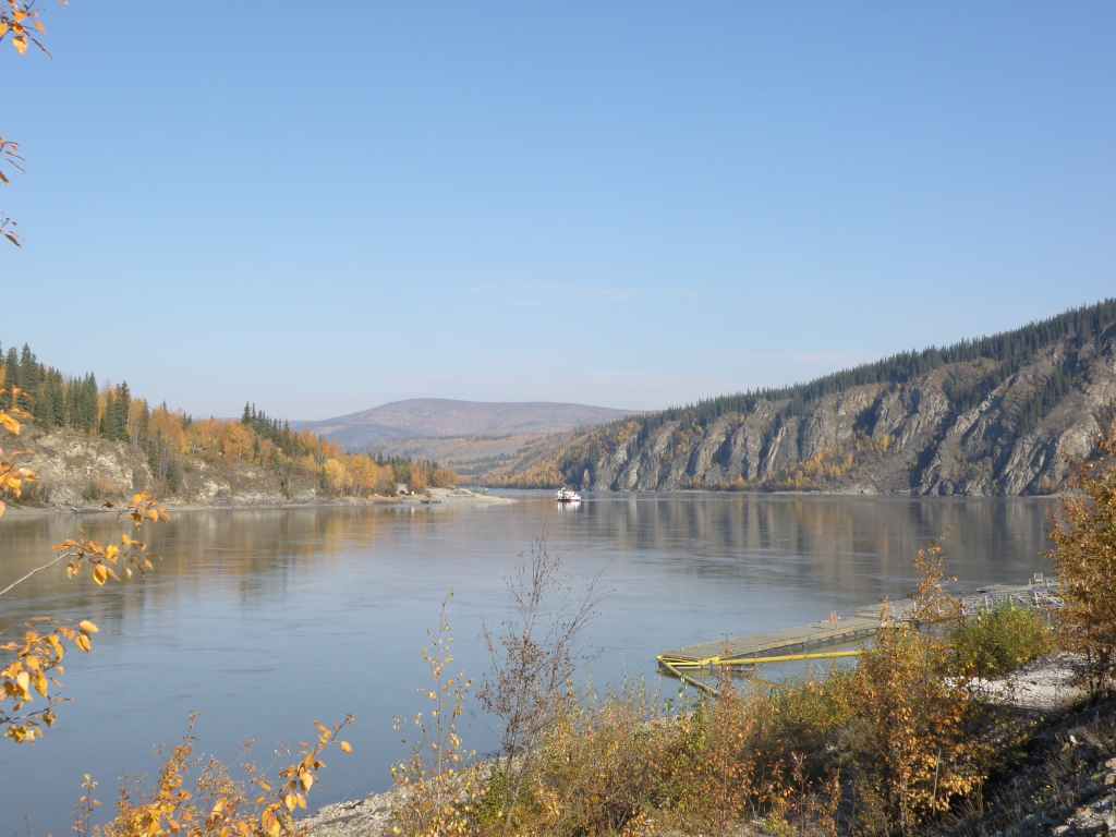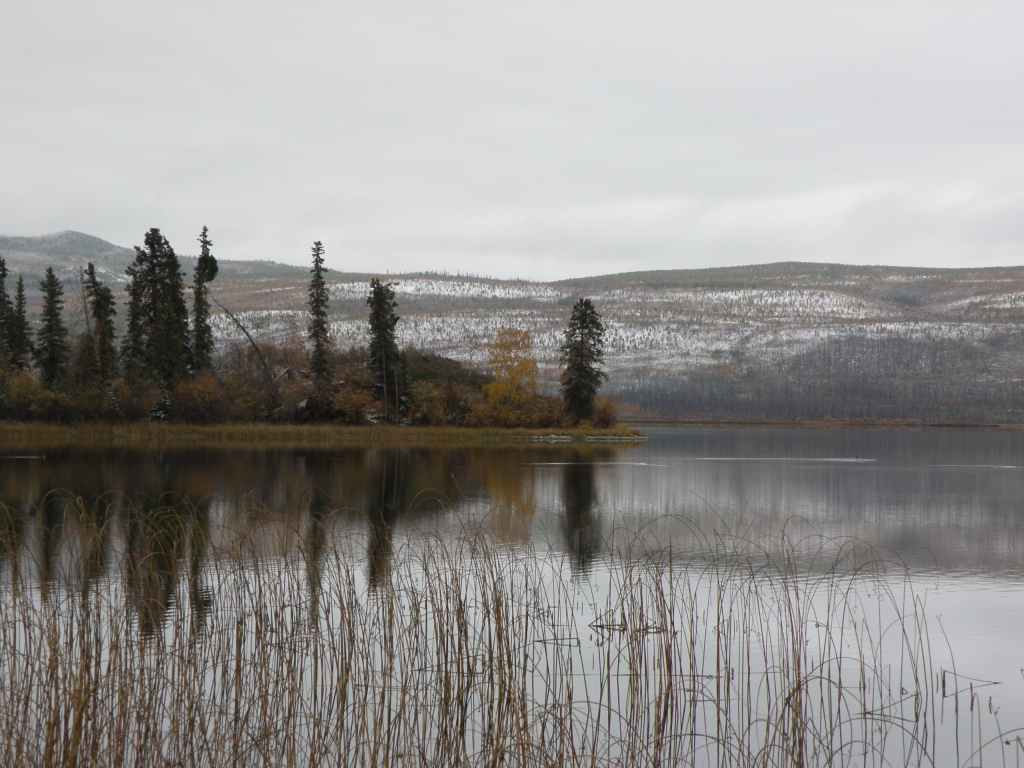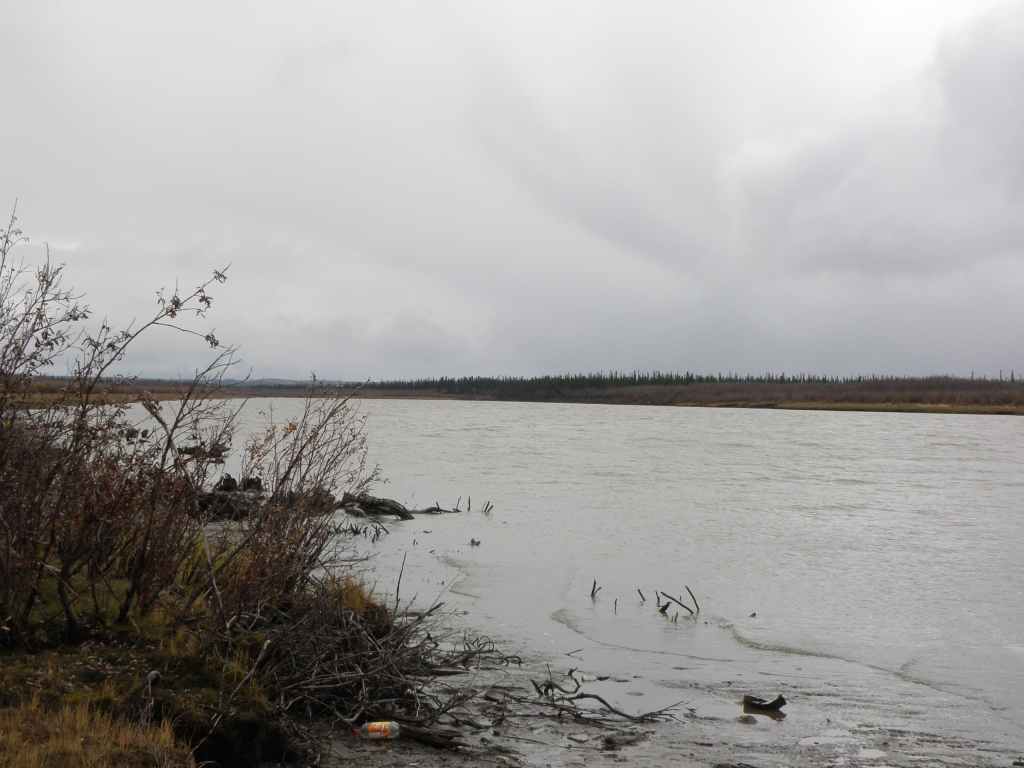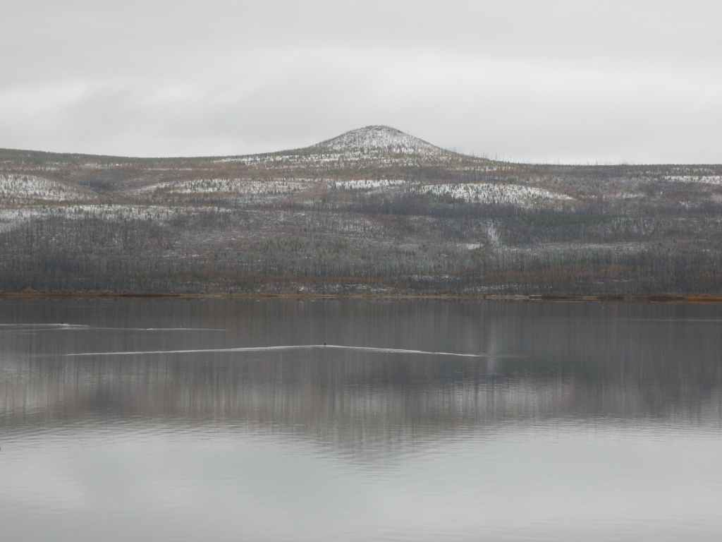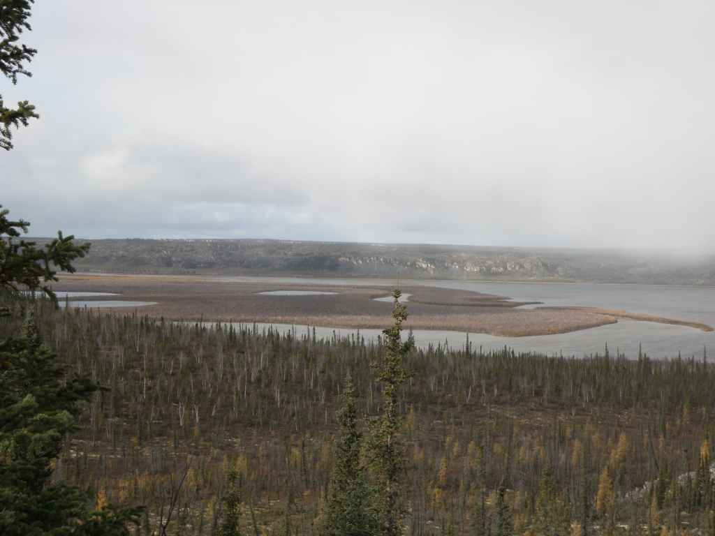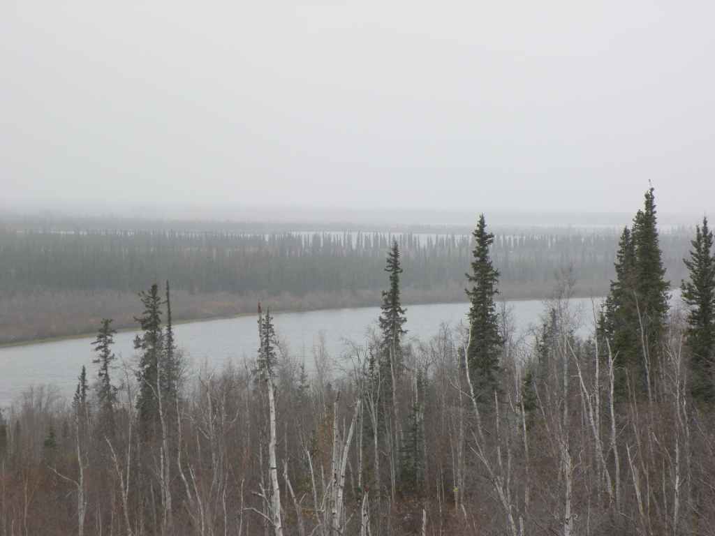 Ce matin, la température s’est radoucie (3°C) mais le ciel s’est couvert… on repart en direction de Fort Macpherson. On reprend à nouveau un traversier pour traverser la rivière Rouge Arctique et le fleuve Mackenzie. Celui-ci est à cet endroit très large. Puis la piste nous conduit tranquillement au belvédère du lac Campbell. C’est dans ce très bel endroit que nous prenons notre première averse de neige !