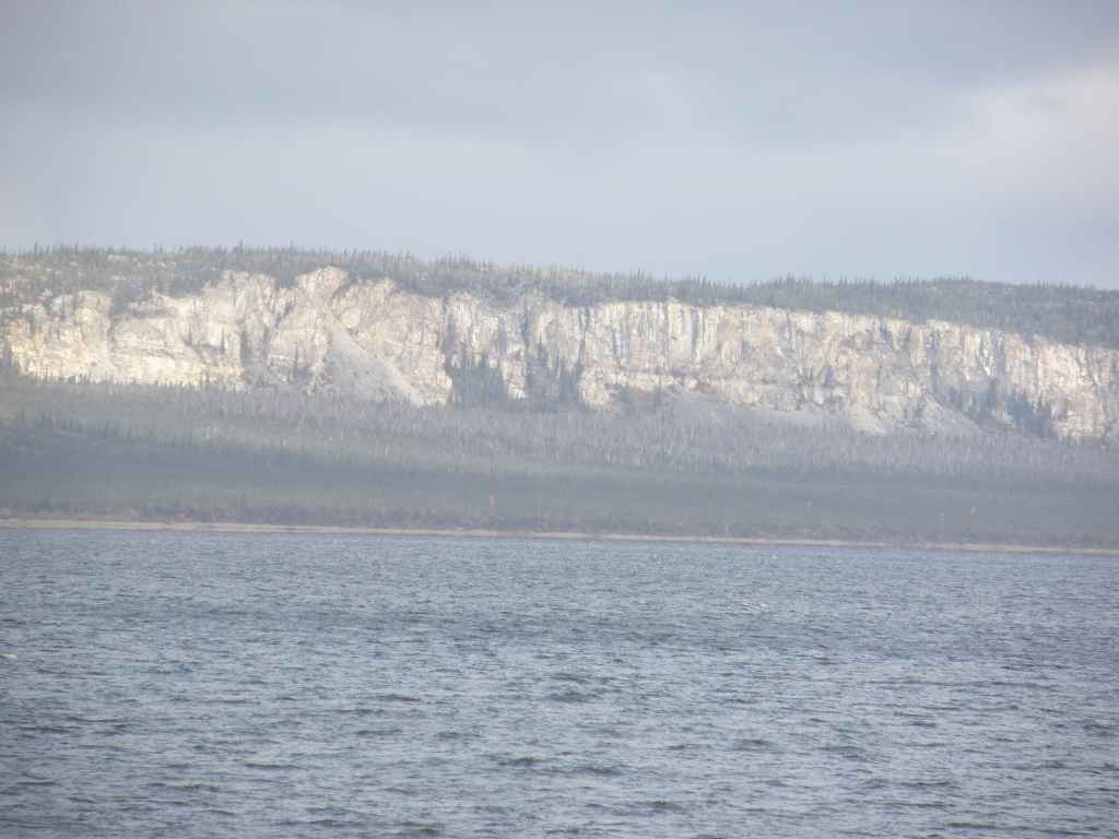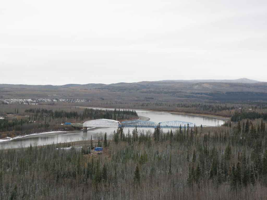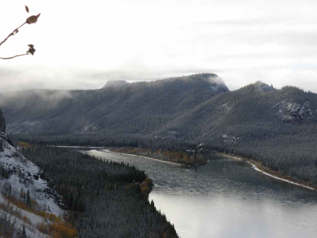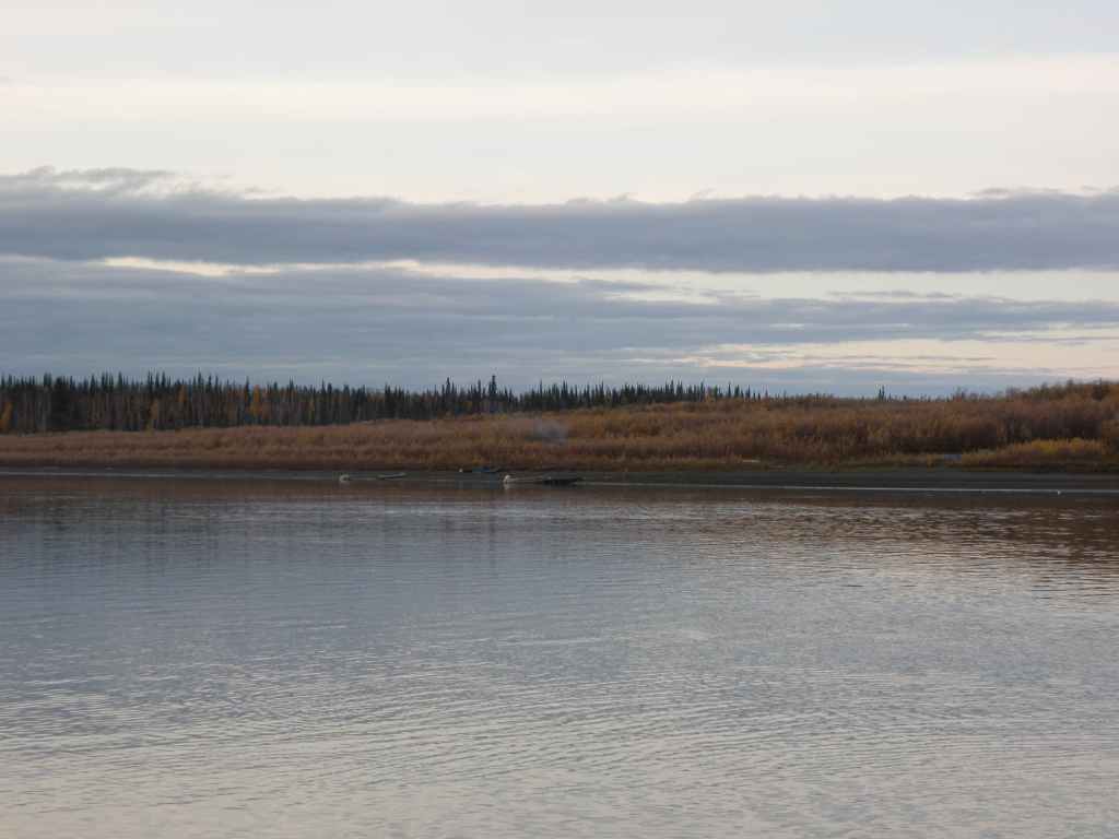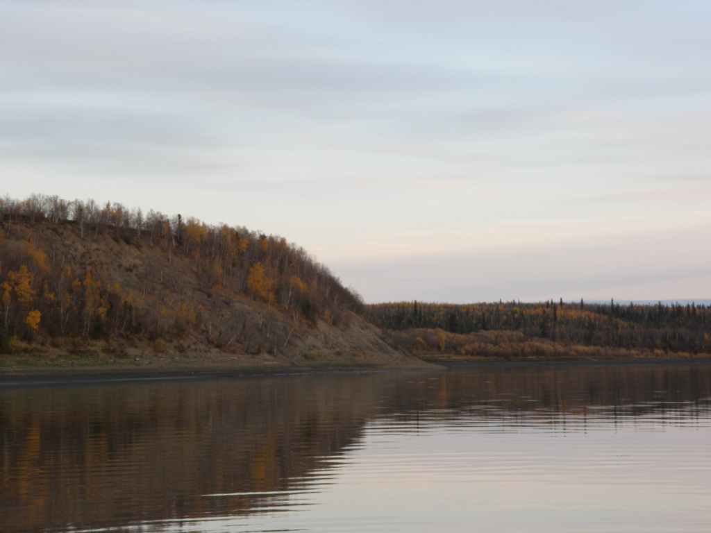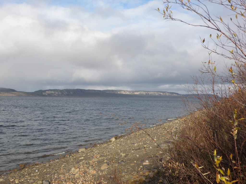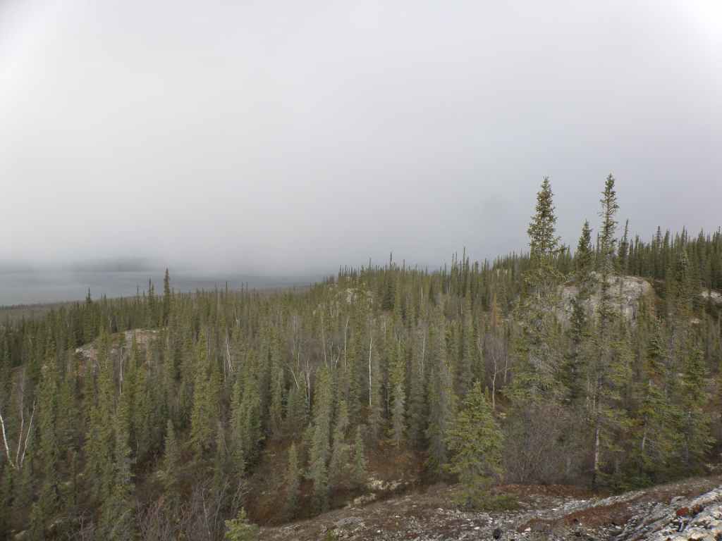 Ce matin, la température s’est radoucie (3°C) mais le ciel s’est couvert… on repart en direction de Fort Macpherson. On reprend à nouveau un traversier pour traverser la rivière Rouge Arctique et le fleuve Mackenzie. Celui-ci est à cet endroit très large. Puis la piste nous conduit tranquillement au belvédère du lac Campbell. C’est dans ce très bel endroit que nous prenons notre première averse de neige !