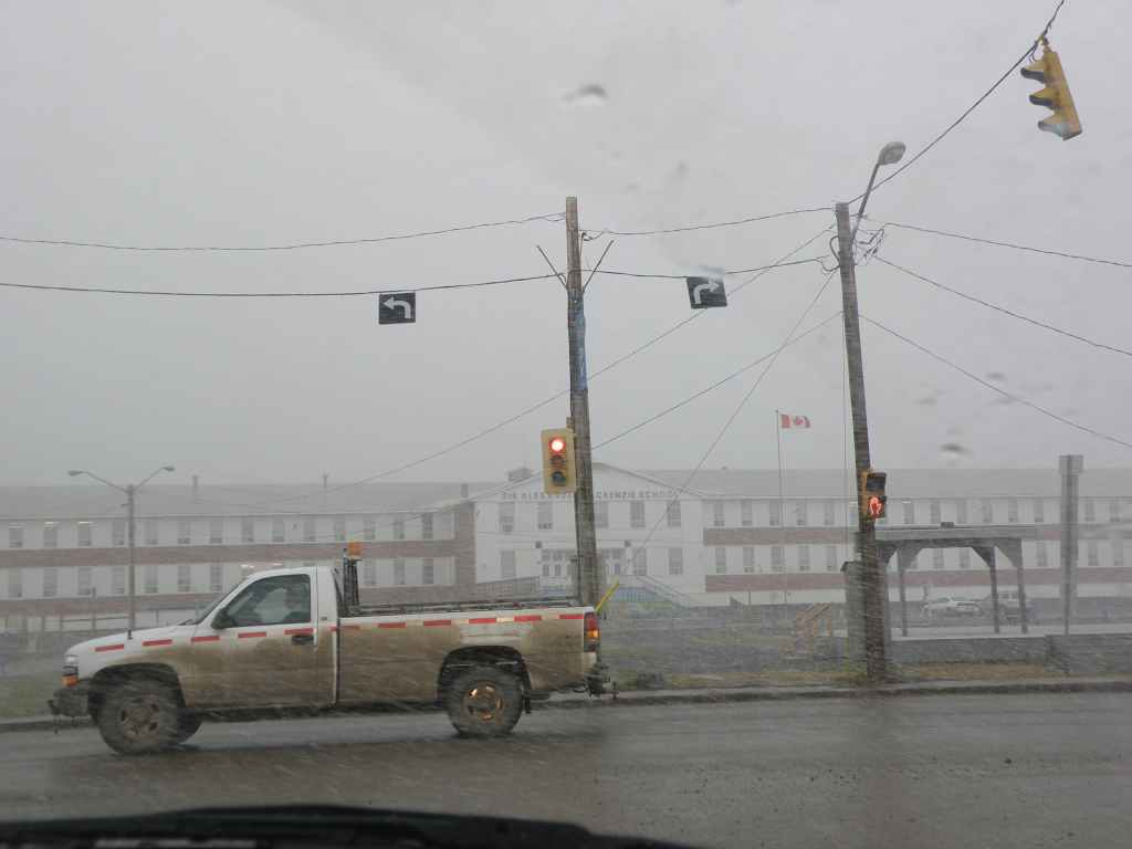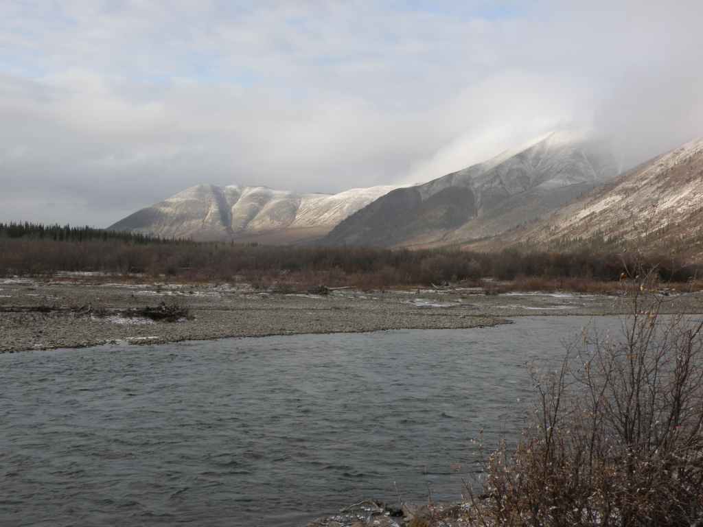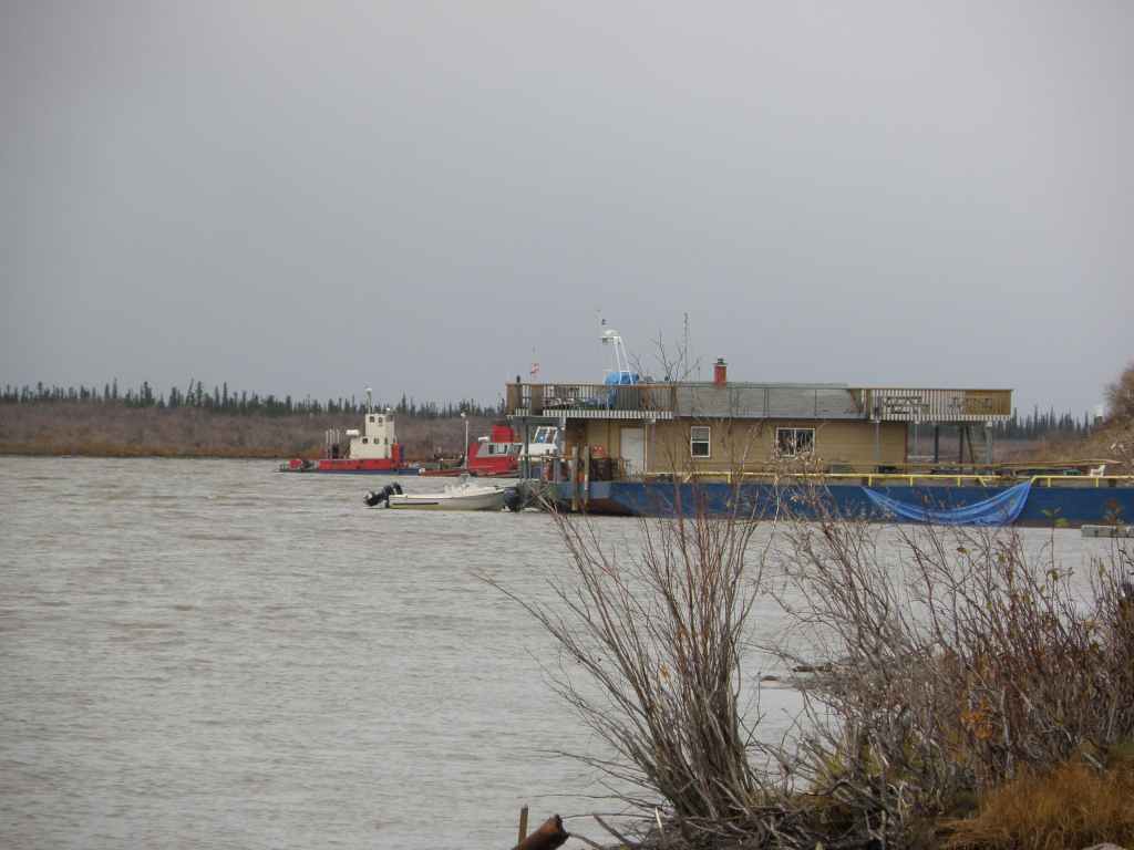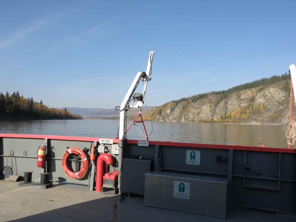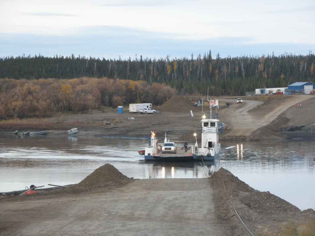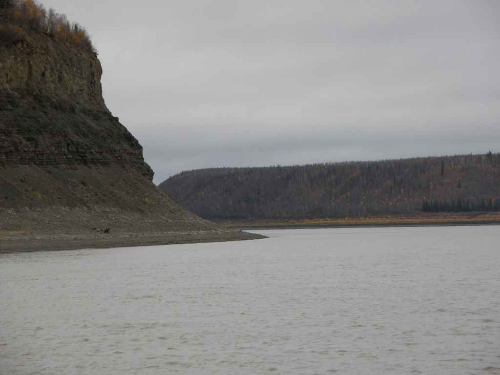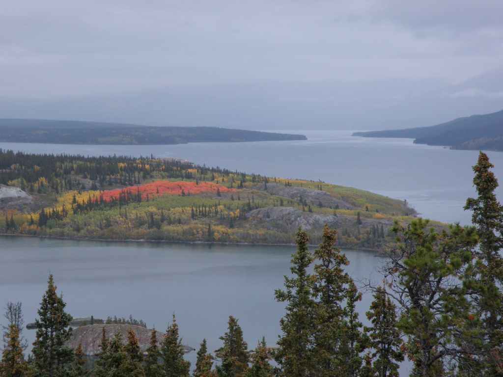Ce matin, la température s’est radoucie (3°C) mais le ciel s’est couvert… on repart en direction de Fort Macpherson. On reprend à nouveau un traversier pour traverser la rivière Rouge Arctique et le fleuve Mackenzie. Celui-ci est à cet endroit très large. Puis la piste nous conduit tranquillement au belvédère du lac Campbell. C’est dans ce très bel endroit que nous prenons notre première averse de neige !