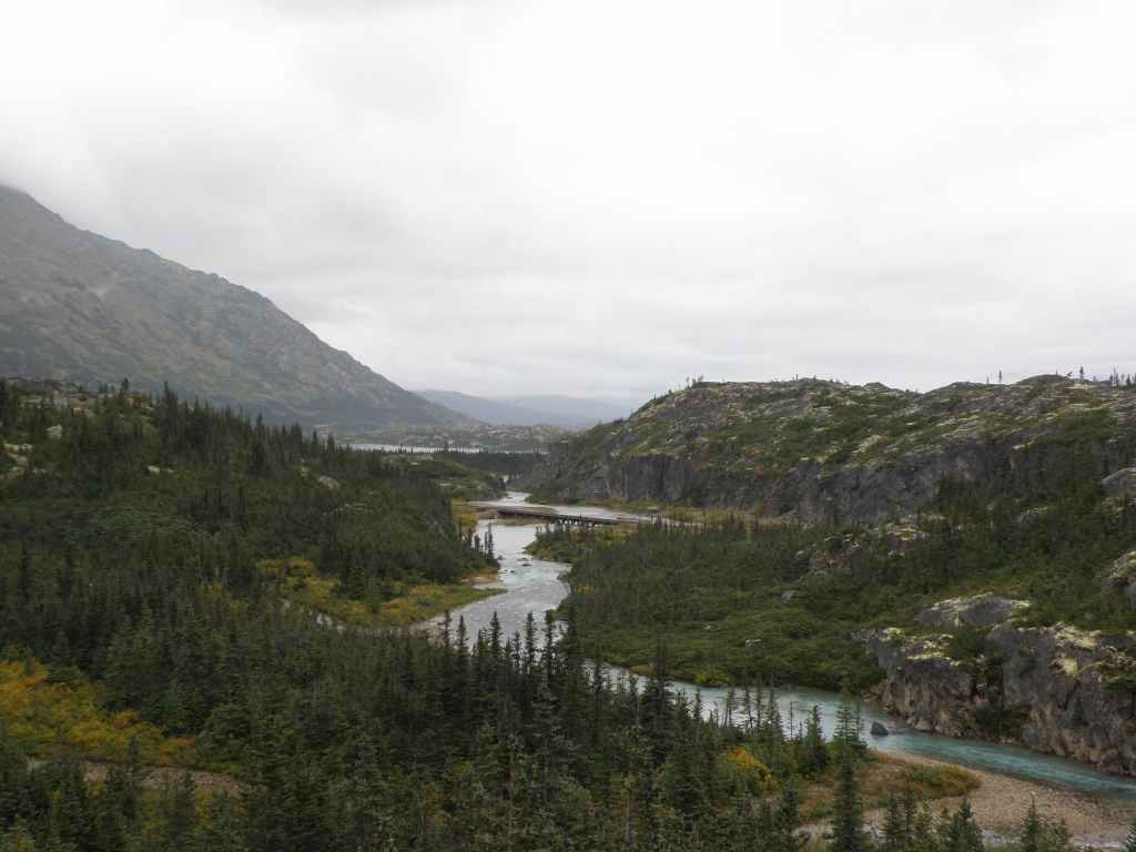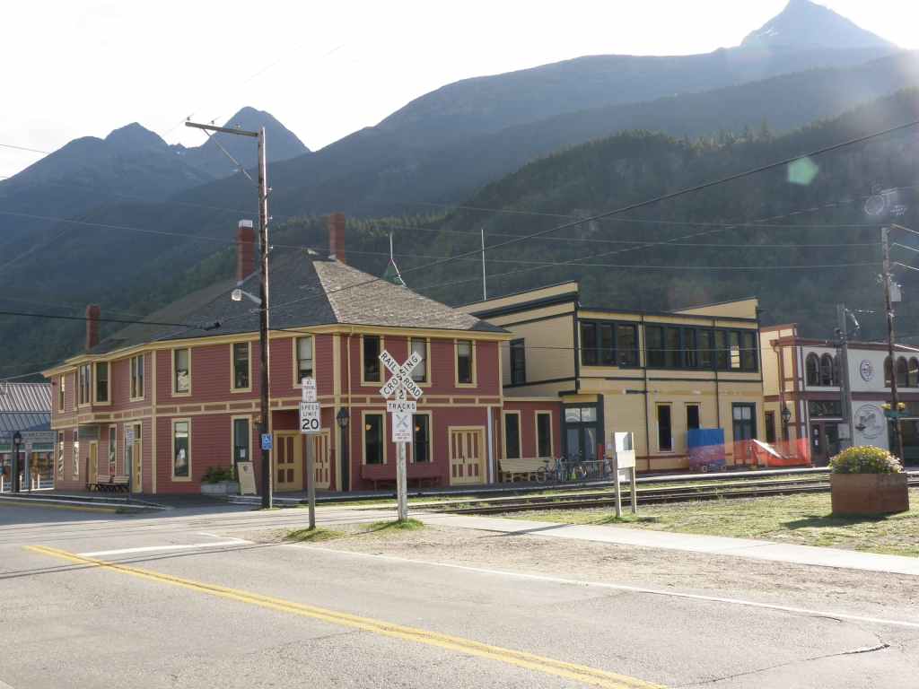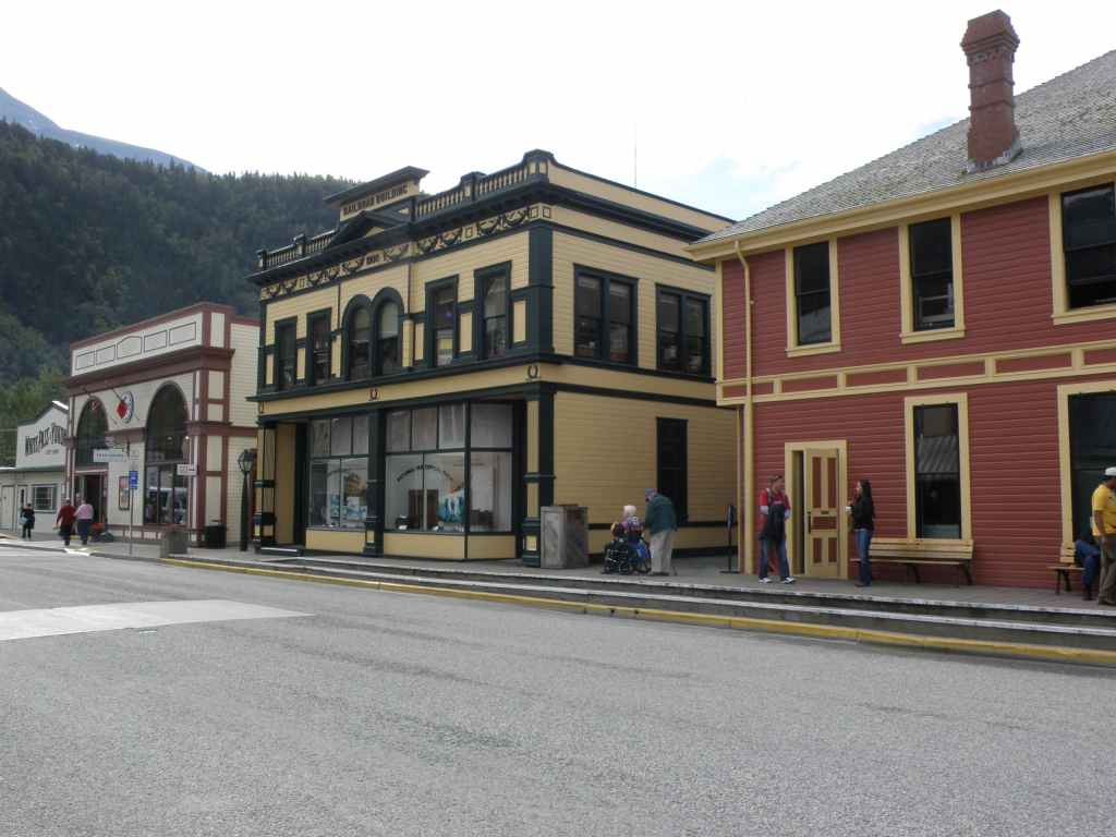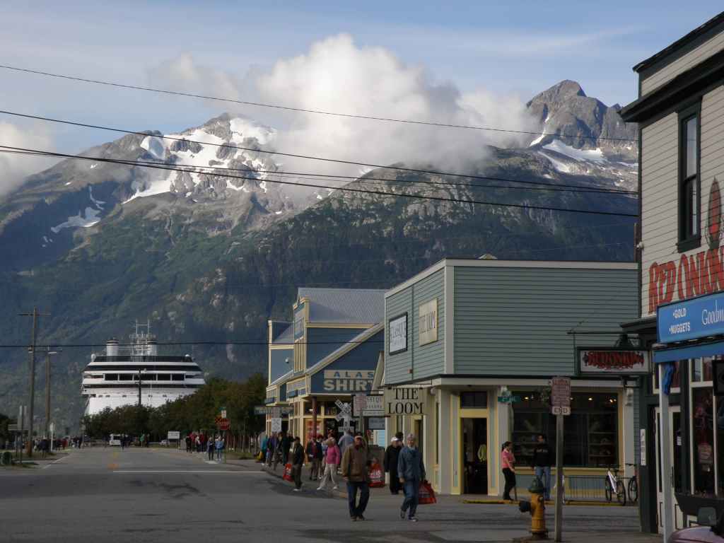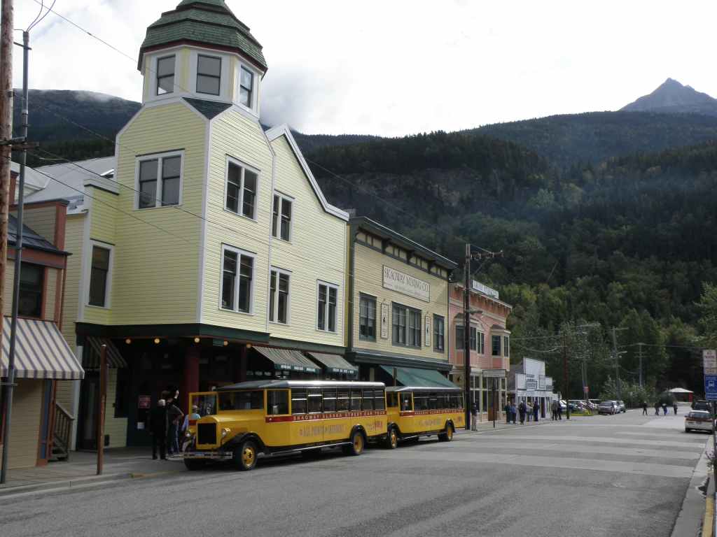 Petits soucis dans le camping-car comme une fuite d’eau qui mouille la moquette et un chauffage à soufflerie très bruyant qui nous oblige à mettre des bouchons d’oreille et ce jusqu’à la fin du voyage. Dommage car dehors c’est le silence absolu. Nous passons donc le White Pass, col à la frontière des USA. Le passage est impressionnant. La voiture est filmée de tous côtés, passe dans un portail servant probablement de scanner et nous, on nous scanne les 2 mains et on nous prend en photo. On nous donne un visa provisoire de 3 mois moyennant 6 $US / personne ! Nous continuons notre route en traversant des paysages grandioses pour redescendre à Skagway, ville de l’Alaska et lieu de départ de la ruée vers l’or à la fin du XIXème siècle.