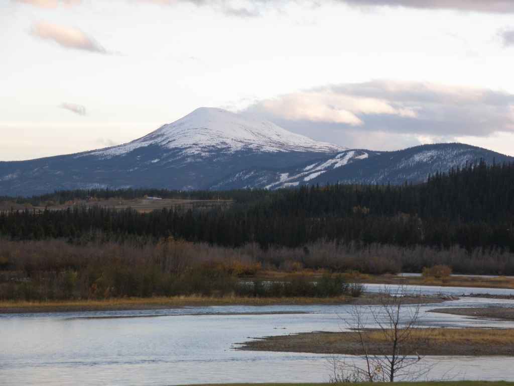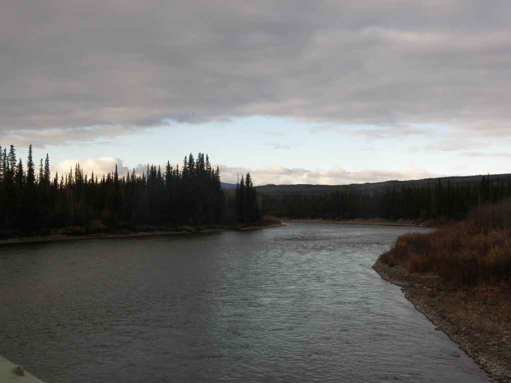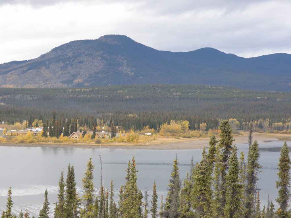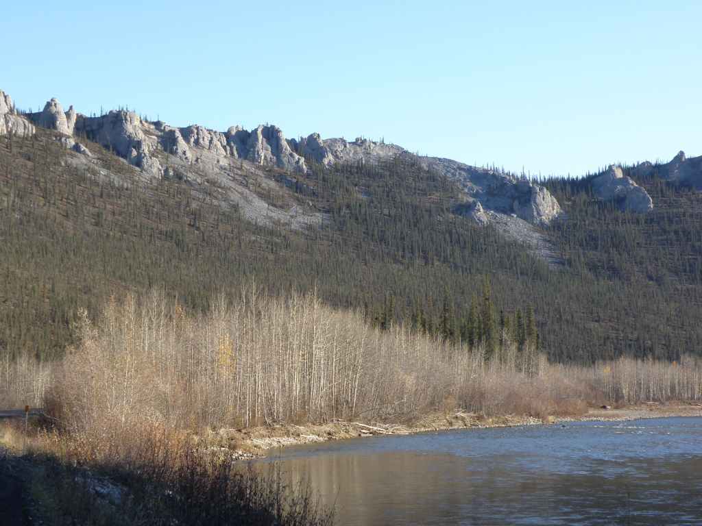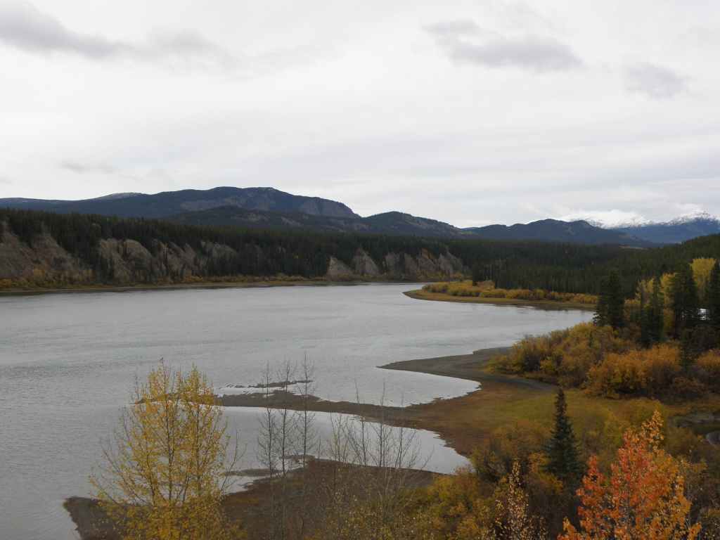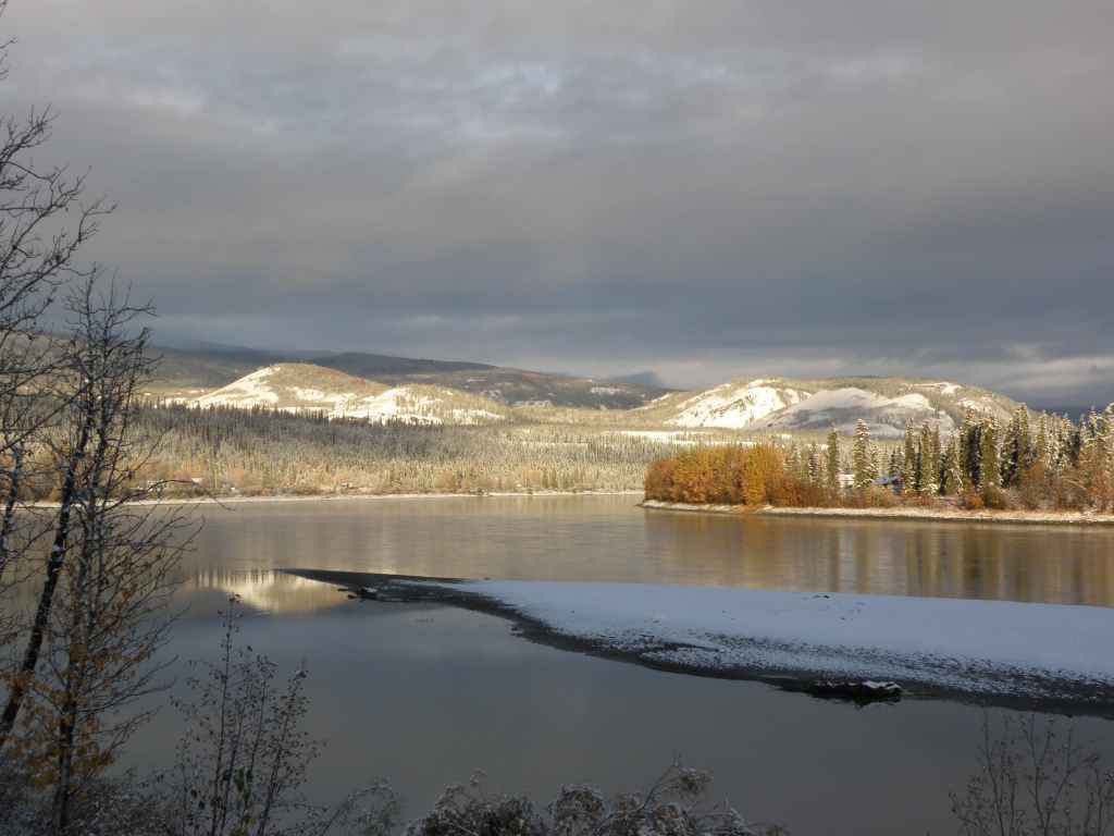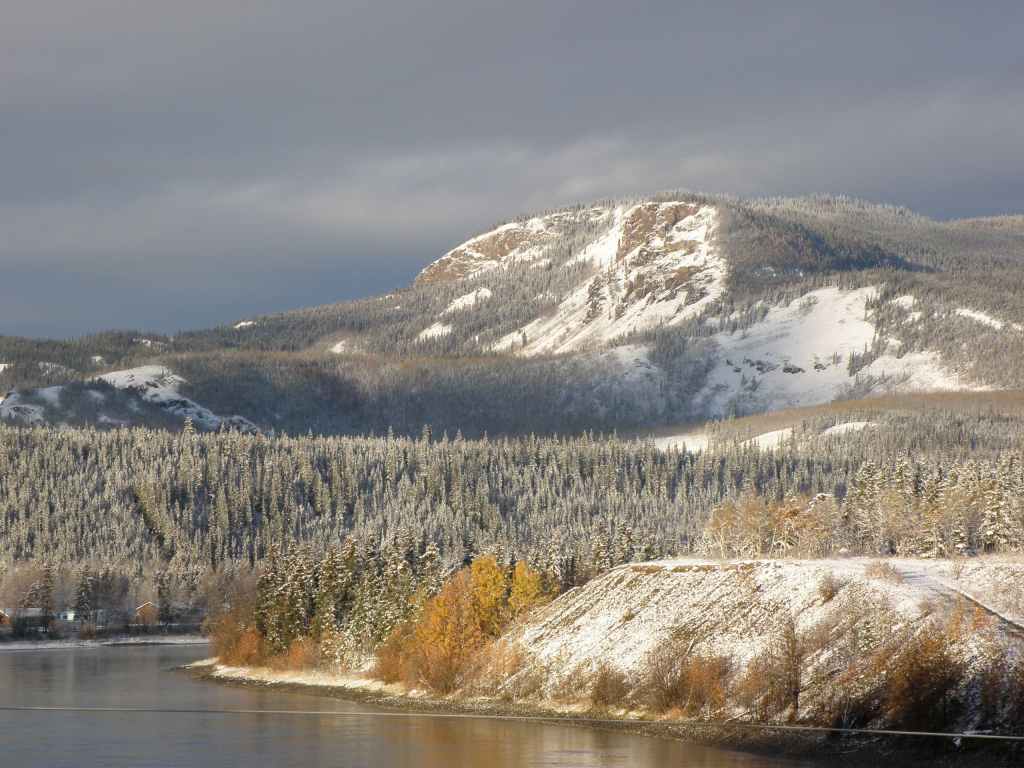 Les rayons du soleil embrasent le Yukon qui coule à côté de nous. 0°c ce matin et 5 cm de neige ! Mais elle disparait petit à petit au fil de la route et la température remonte à 7°C quand nous arrivons à Faro au terme de notre étape. Ici tout est fermé : la station d’essence a disparu ce qui risque de nous poser de sérieux problèmes pour continuer le lendemain. Après renseignement auprès de la police montée royale du village, nous trouvons quand même une petite épicerie ouverte le dimanche où l’on se ravitaille mais c’est le strict minimum…