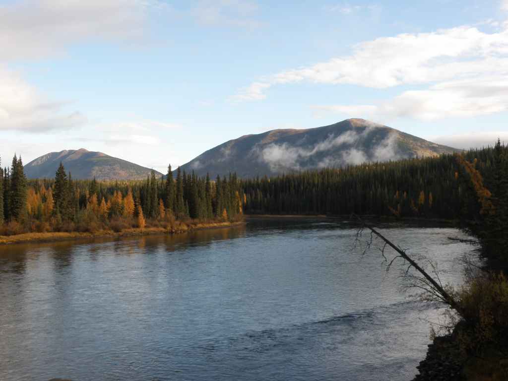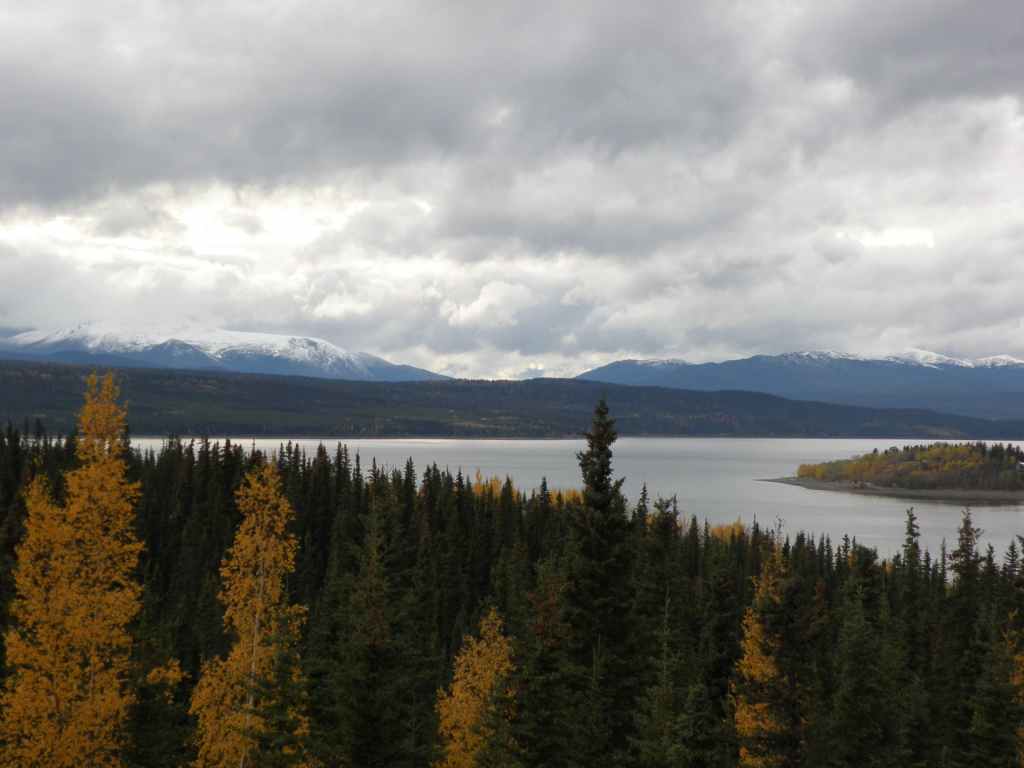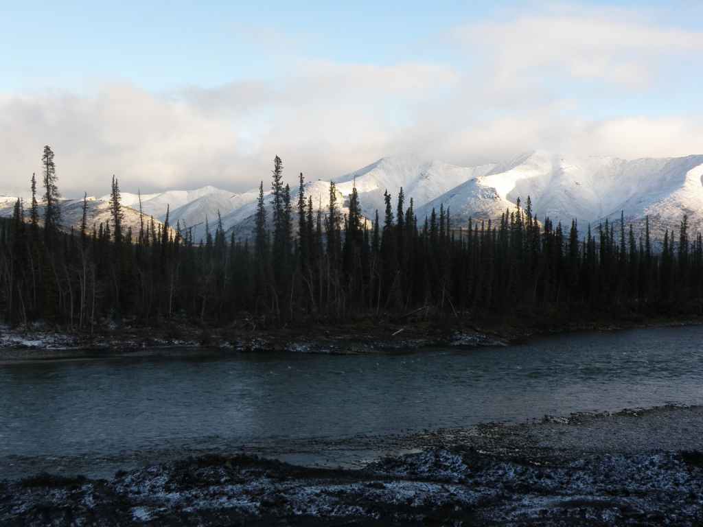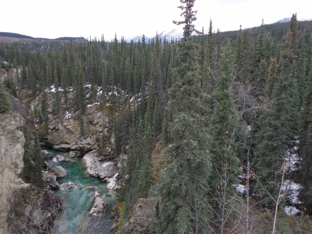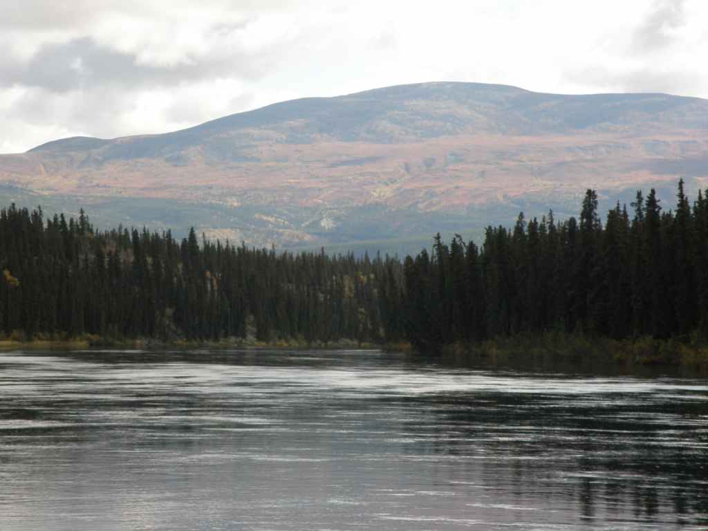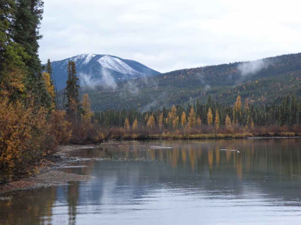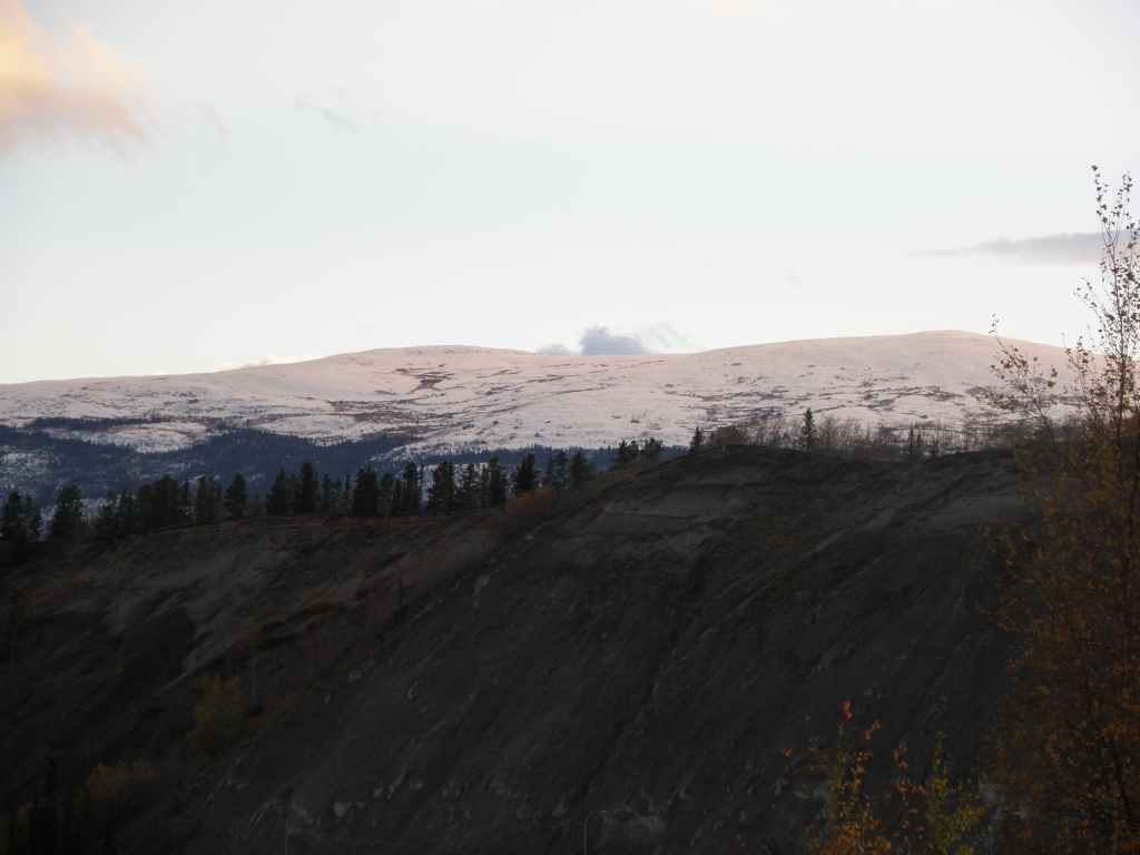 Les rayons du soleil embrasent le Yukon qui coule à côté de nous. 0°c ce matin et 5 cm de neige ! Mais elle disparait petit à petit au fil de la route et la température remonte à 7°C quand nous arrivons à Faro au terme de notre étape. Ici tout est fermé : la station d’essence a disparu ce qui risque de nous poser de sérieux problèmes pour continuer le lendemain. Après renseignement auprès de la police montée royale du village, nous trouvons quand même une petite épicerie ouverte le dimanche où l’on se ravitaille mais c’est le strict minimum…