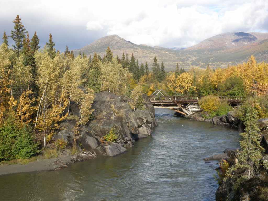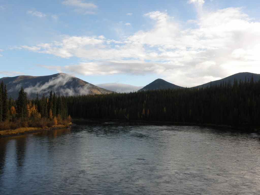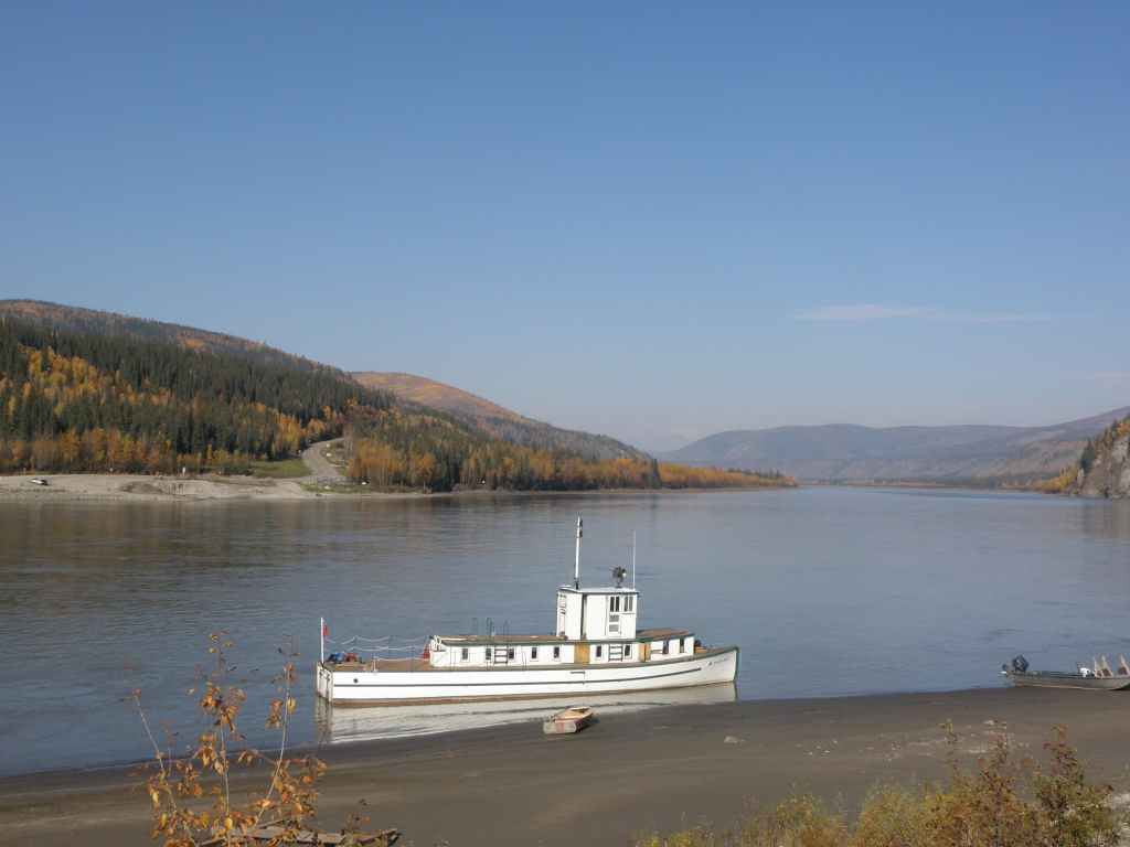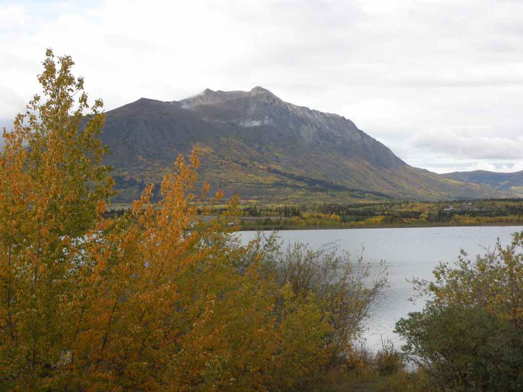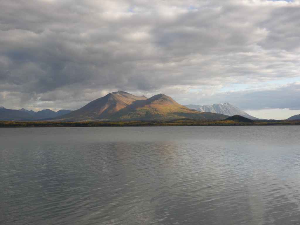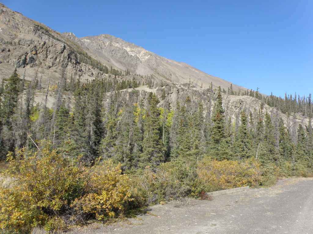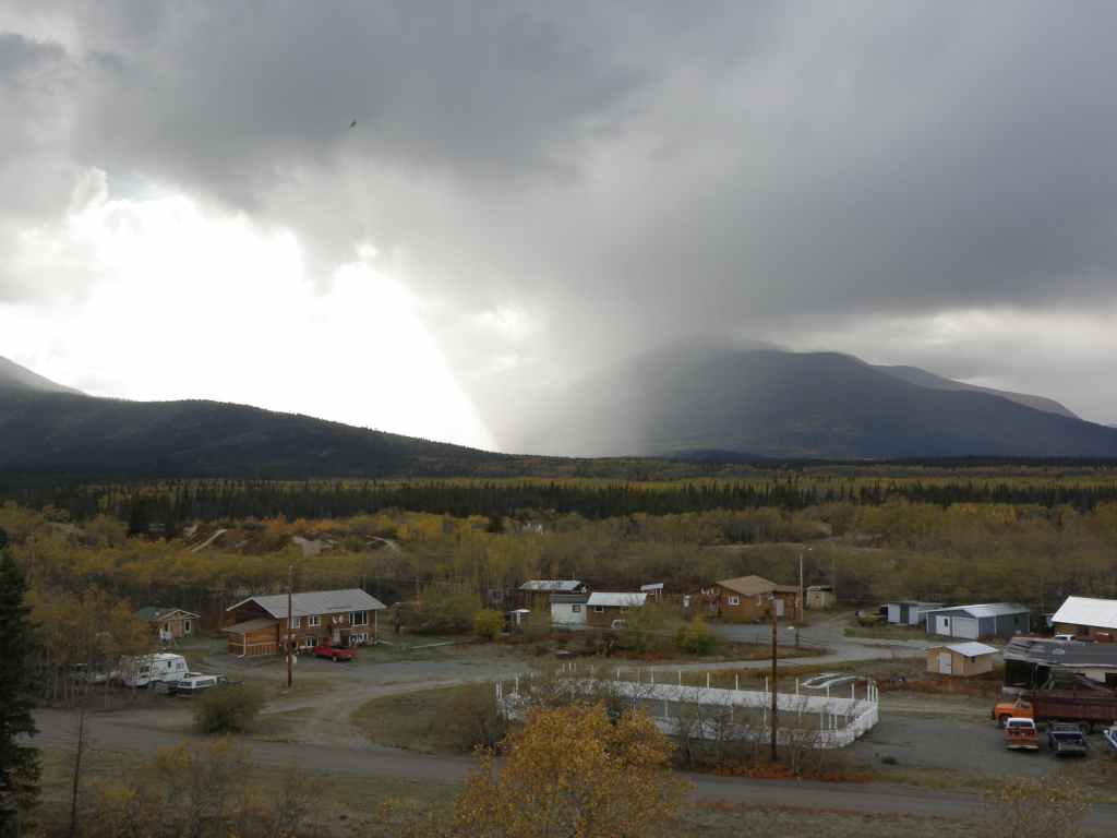 Les rayons du soleil embrasent le Yukon qui coule à côté de nous. 0°c ce matin et 5 cm de neige ! Mais elle disparait petit à petit au fil de la route et la température remonte à 7°C quand nous arrivons à Faro au terme de notre étape. Ici tout est fermé : la station d’essence a disparu ce qui risque de nous poser de sérieux problèmes pour continuer le lendemain. Après renseignement auprès de la police montée royale du village, nous trouvons quand même une petite épicerie ouverte le dimanche où l’on se ravitaille mais c’est le strict minimum…